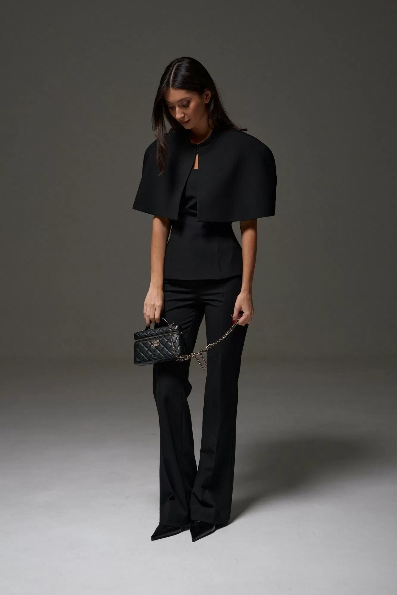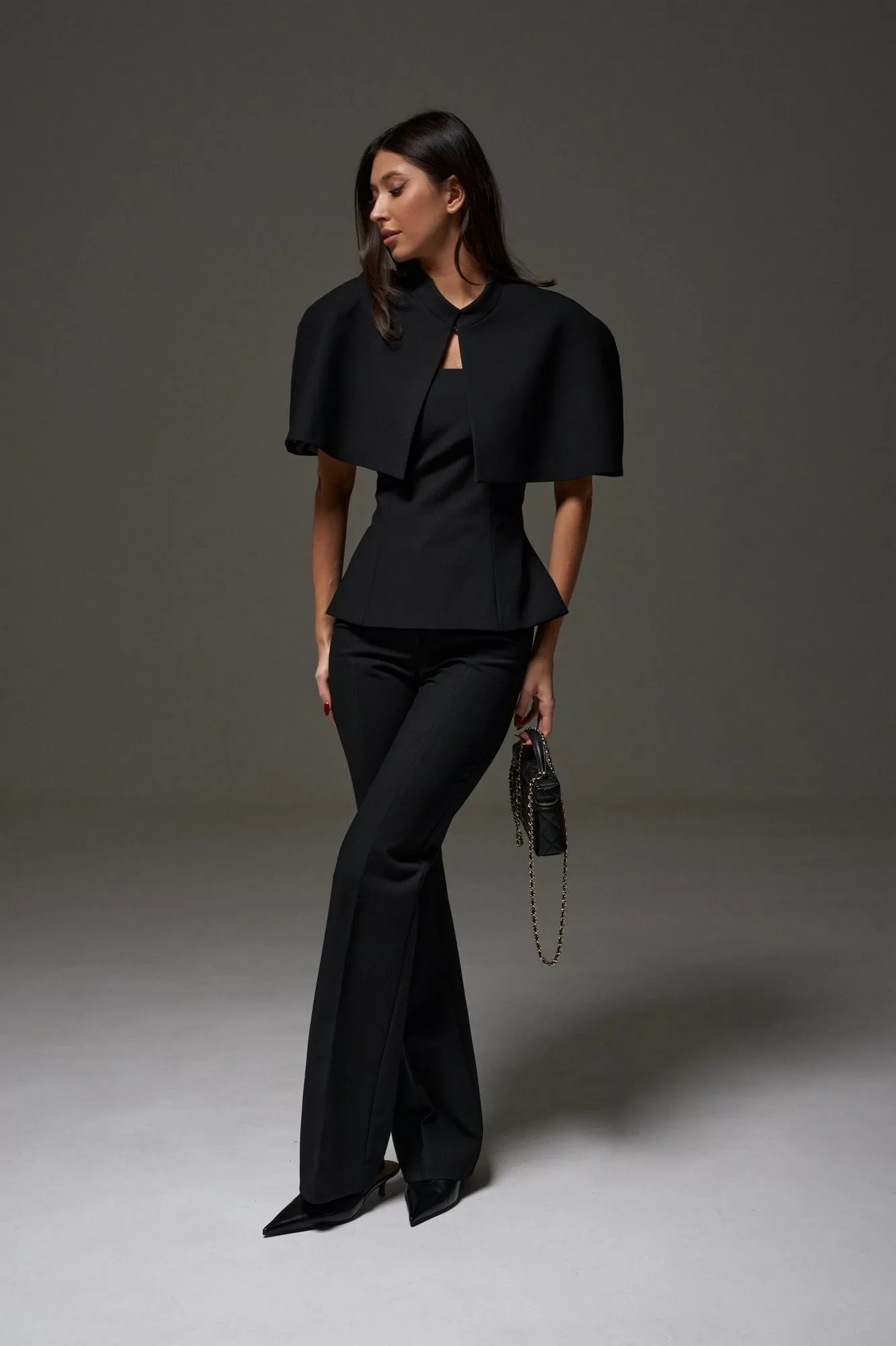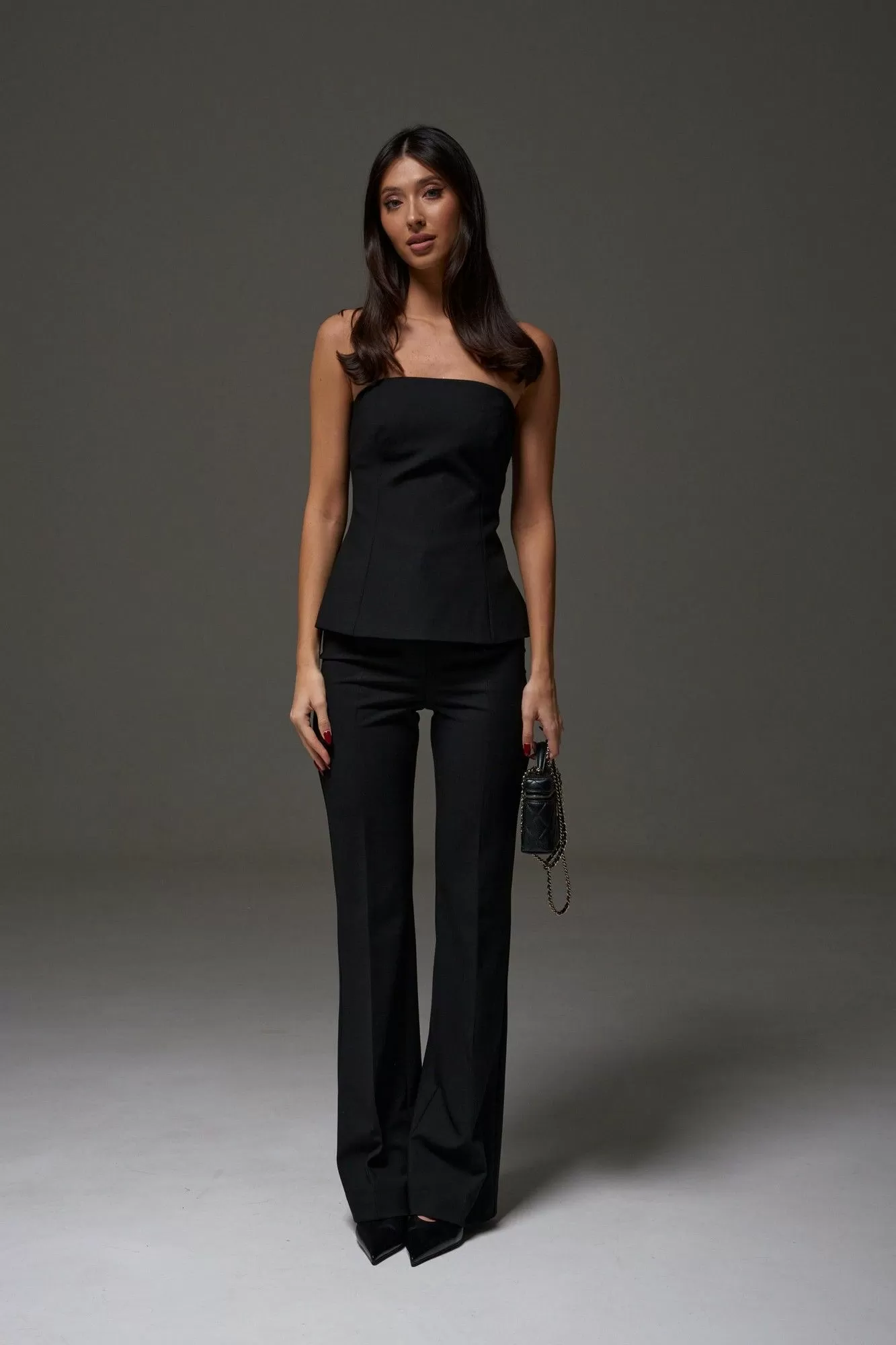 Корсет прилегающего силуэта из черной костюмной ткани. Характеристики: прилегающий силуэт, брендированная подкладка, прямой вырез горловины, по передней и задней части изделия прошиты строчки, по заднему полотну в среднем шве потайная молния. Длина по центру спинки 36см.