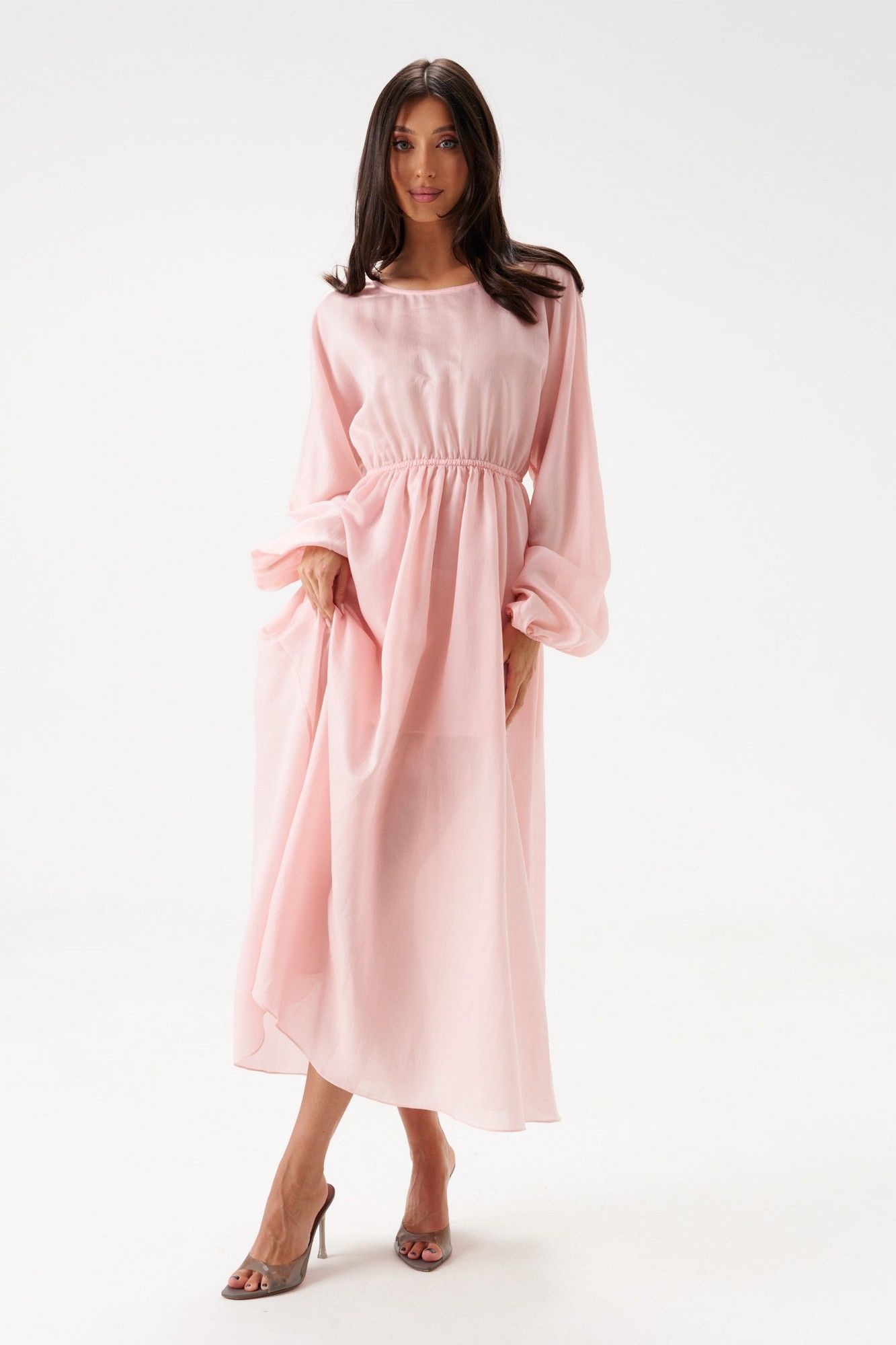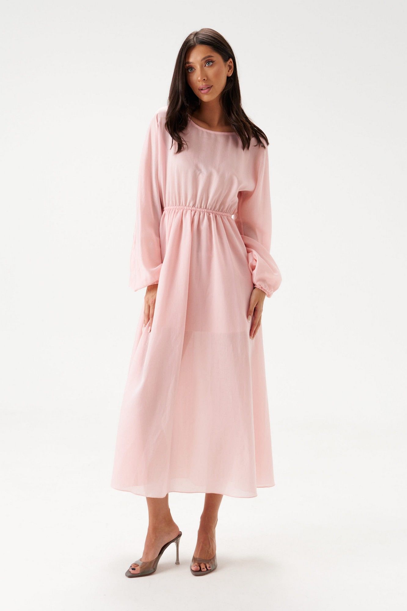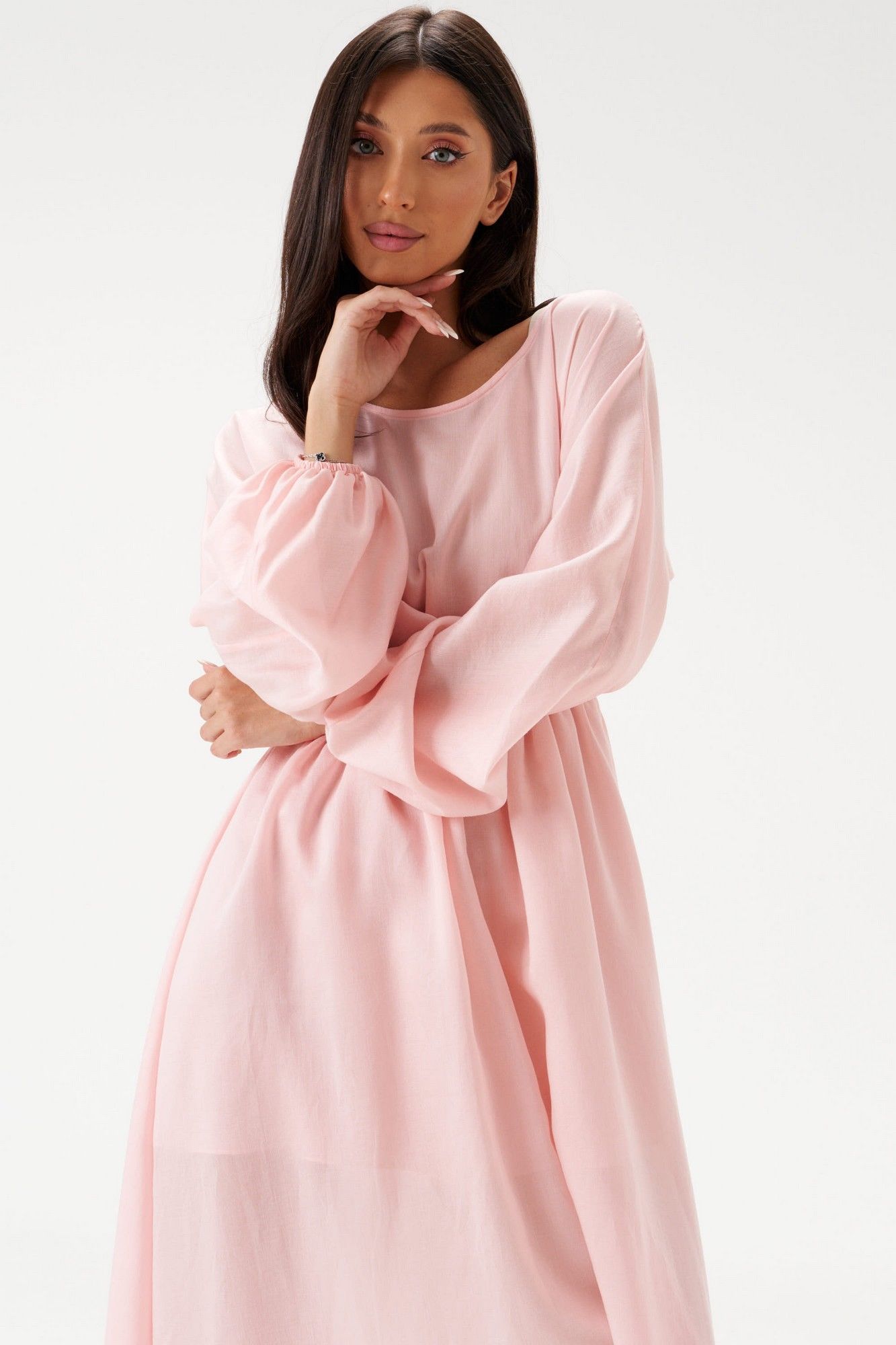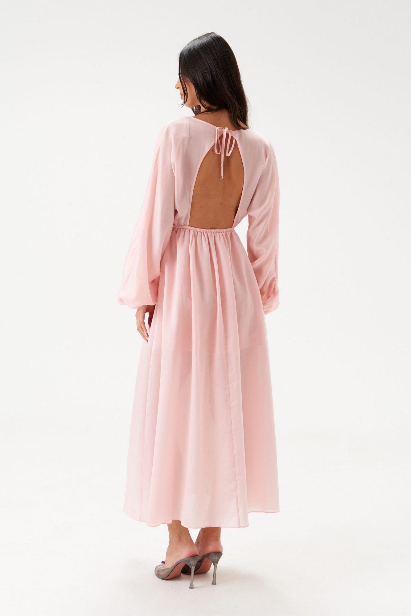 Платье - миди полуприлегающего силуэта выполнено из розового полотна. Горловина овальная. Отрез ниже талии на резинке. По лифу спинки вырез с завязками. Рукав спущенный, присборен на резинку. Длина платья 132 см, длина рукава 76 см.