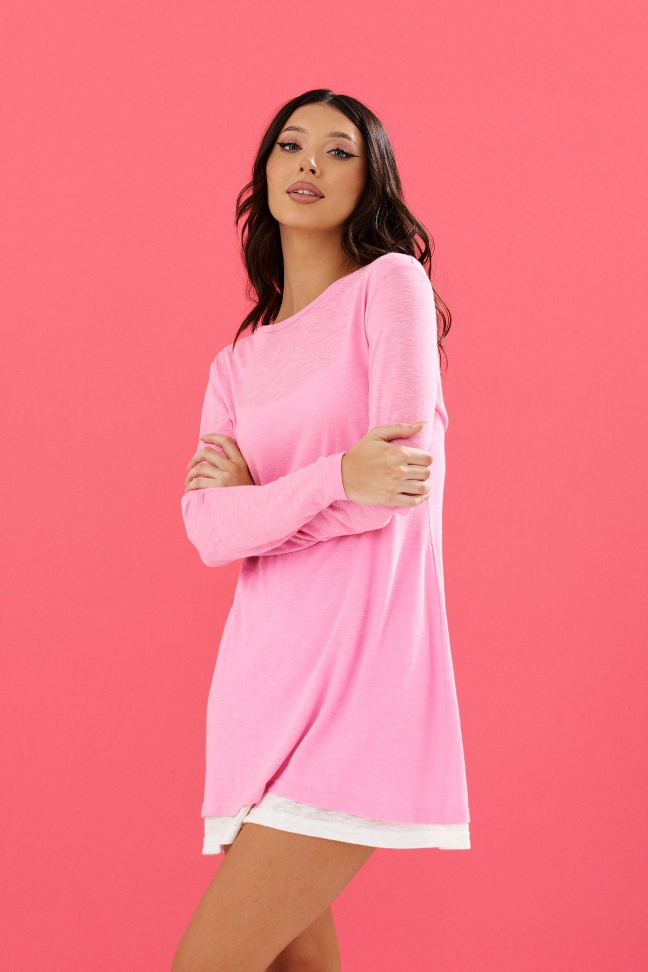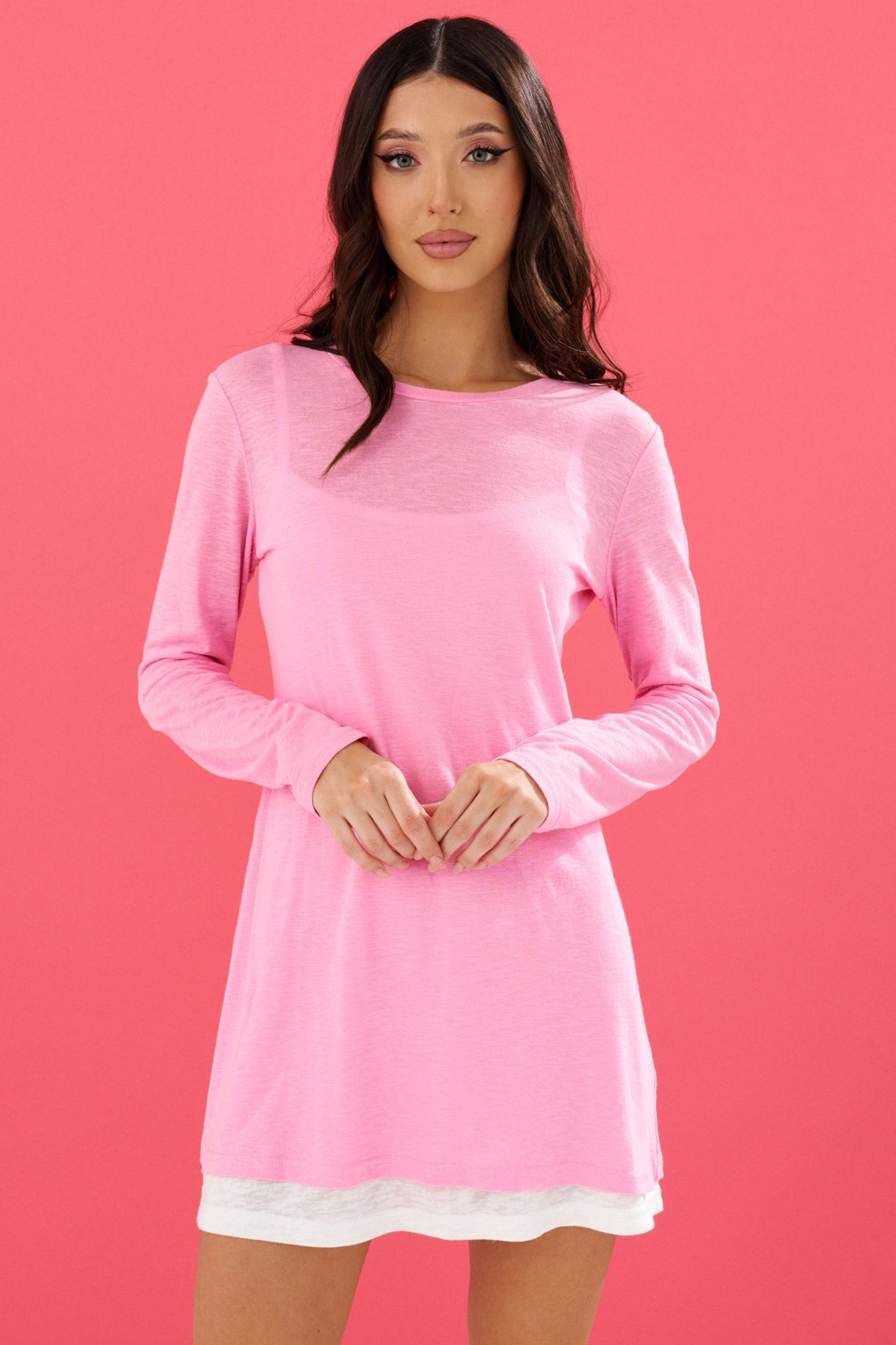 Комплект состоит из двух платьев: платье на бретелях и платье полуприлегающего силуэта. Выполнен из полупрозрачной трикотажной ткани двух цветов , белый и розовый цвет. Характеристики:нижнее платье полуприлегающего силуэта, А-образный силуэт, бретели - не регулируемые. Длина по спинке 82 см. Верхнее платье полуприлегающего силуэта, А-образный силуэт, горловина овальная, рукав втачной. Длина по спинке 74 см, 62 см.
