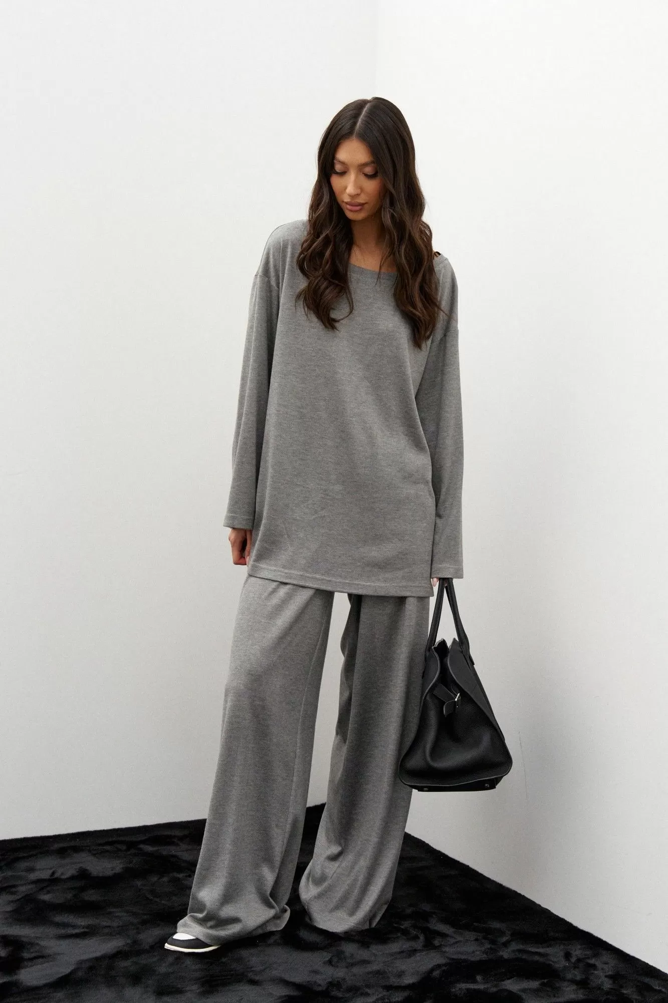 Комплект 2-х предметный. Состоит из джемпера и брюк, выполнен из трикотажного полотна серого цвета. Характеристики: джемпер прямого кроя с рукавом, горловина овальная. Длина по спинке от края горловины 72 см, длина рукава от края горловины 68см. Брюки прямого кроя, пояс на резинке, длина брюк по боковой стороне 111 см.