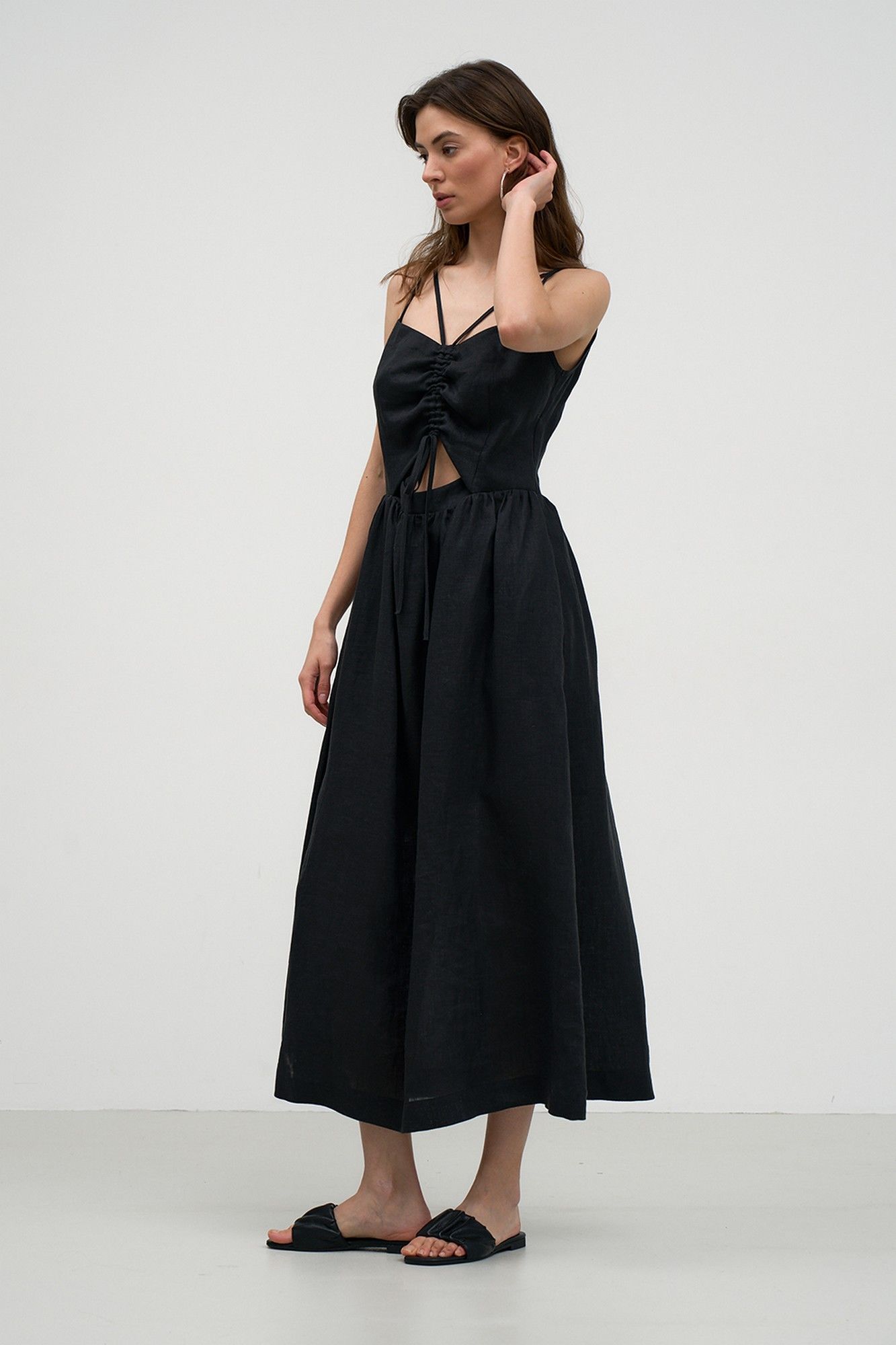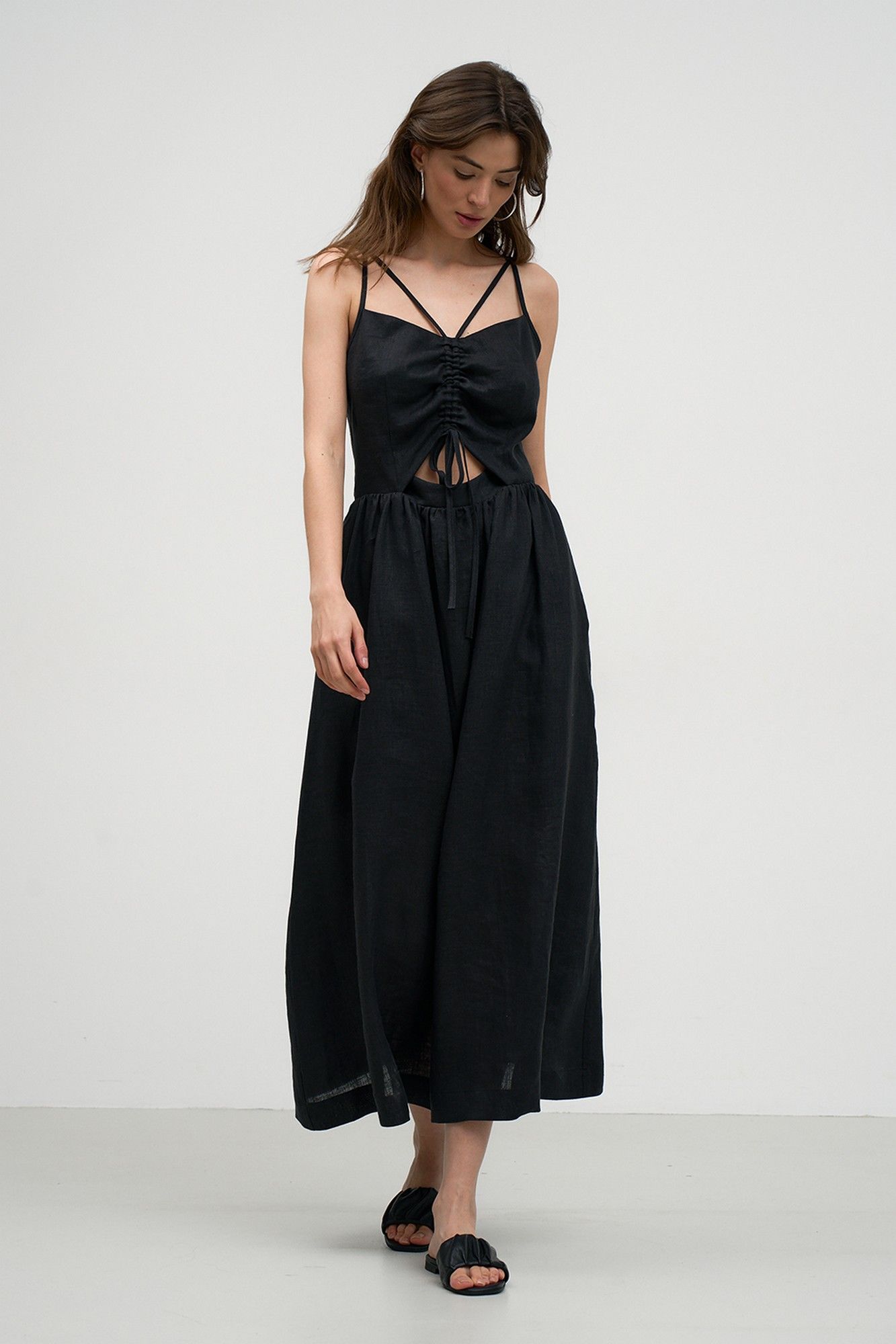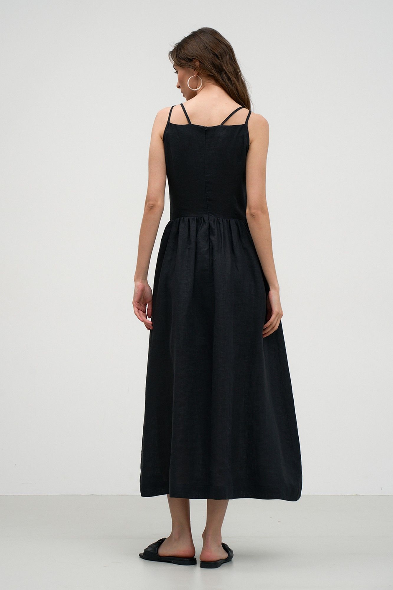 Смелый и запоминающийся образ обеспечит Вам стильное и необычное платье, выполненное из высококачественной льняной ткани. Платье полуприлегающего силуэта, на регулируемых бретелях. На переде обработаны вытачки и кулиска. Спинка также с вытачками. Изделие отрезное по линии талии с карманами в боковых швах. На спинке обработана застежка на потайную тесьму-молнию. Изделие н а хлопковой подкладке. . Возможно отличие фотографии по оттенку, связанное с разной цветопередачей монитора. Длина по центру спинки (см): 119, 119, 119 По груди (см): 46, 48, 50 По талии (см): 37, 39, 41 Ширина спинки (см): 27, 28, 29
