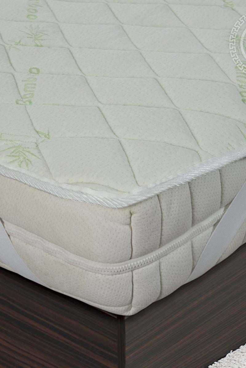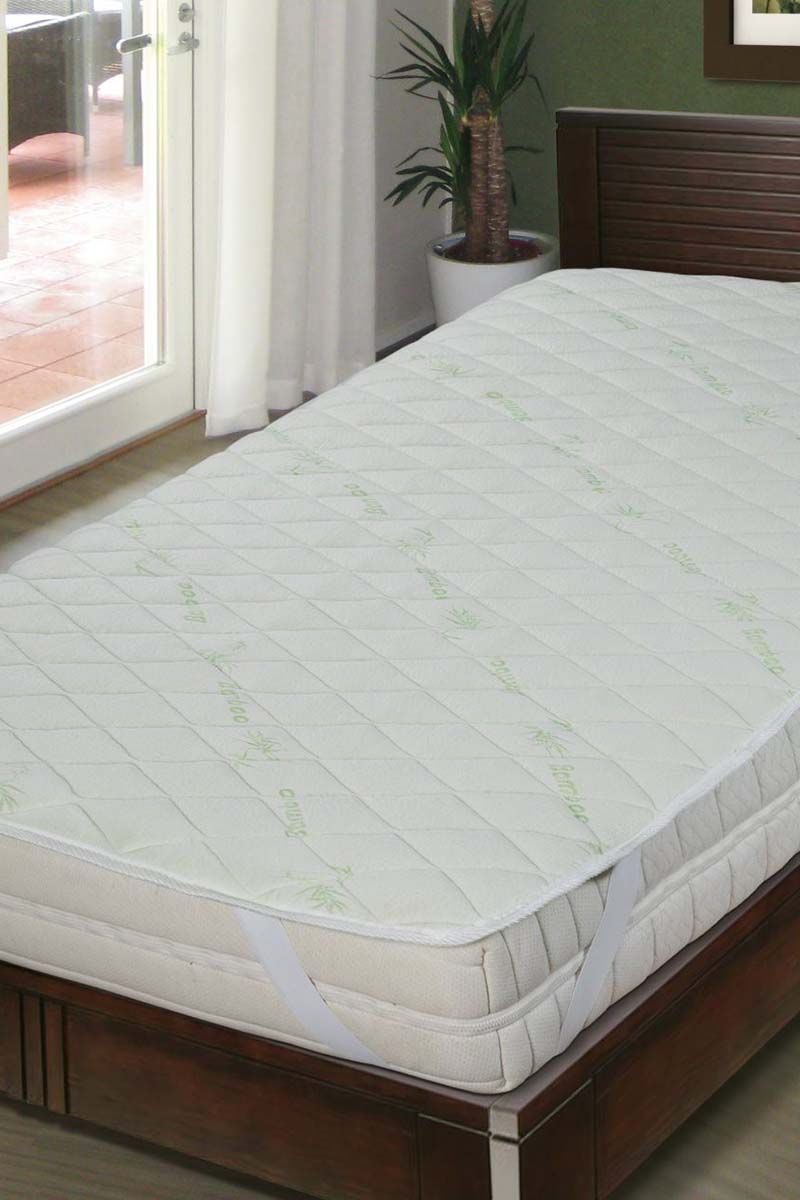 Наматрасник стёганый "Бамбук". Наполнитель: термоскреплённое волокно бамбука Материал чехла: трикотажное полотно (50% бамбук, 50% полиэстер) Плотность наполнителя г/кв.м: 150 Вид крепления: угловое (4 угла) Тип наматрасника: стёганый, с окаймляющей лентой *: Подходит для людей, склонных к аллергии