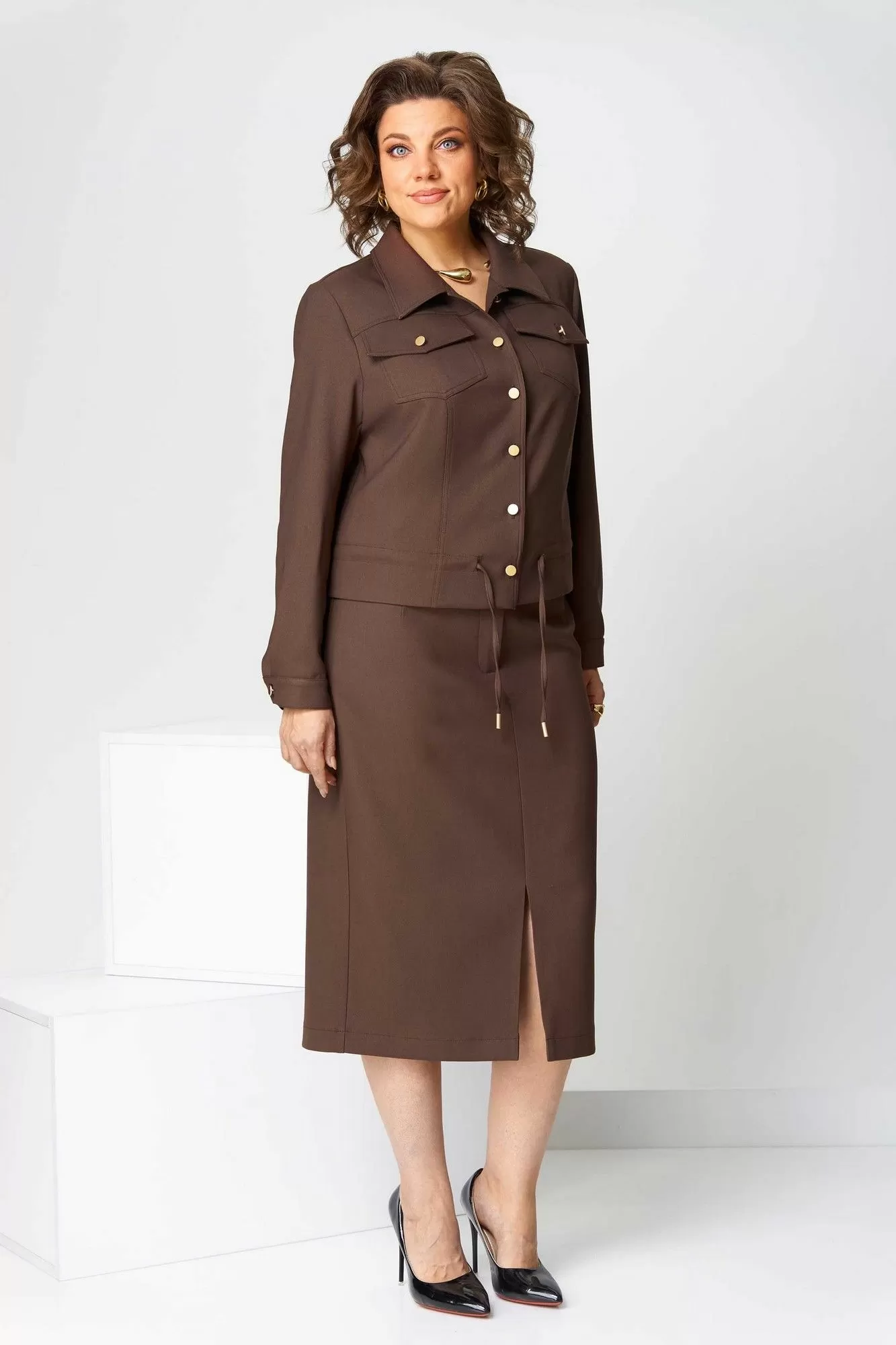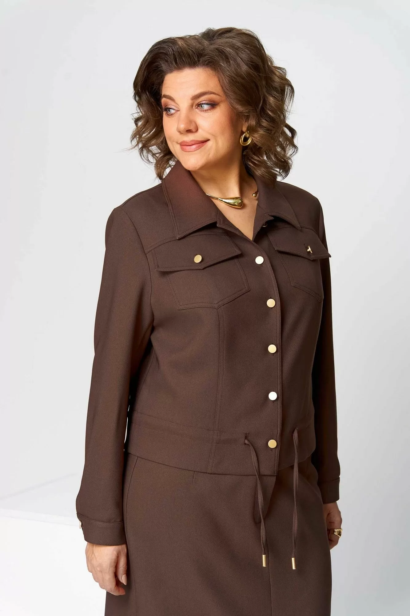 Костюм юбочный (двойка) женский свободного силуэта, состоит из жакета и юбки. Жакет без подкладки с центральной застежкой на петли и пуговицы, воротник отложной, рукав длинный с манжетом, застегивающимся на петлю. По спинке - кокетка. По переду кокетка и рельефы, выходящие из нее, накладные нагрудные карманы с клапанами. По низу жакета кулиска со шнуром и наконечниками.