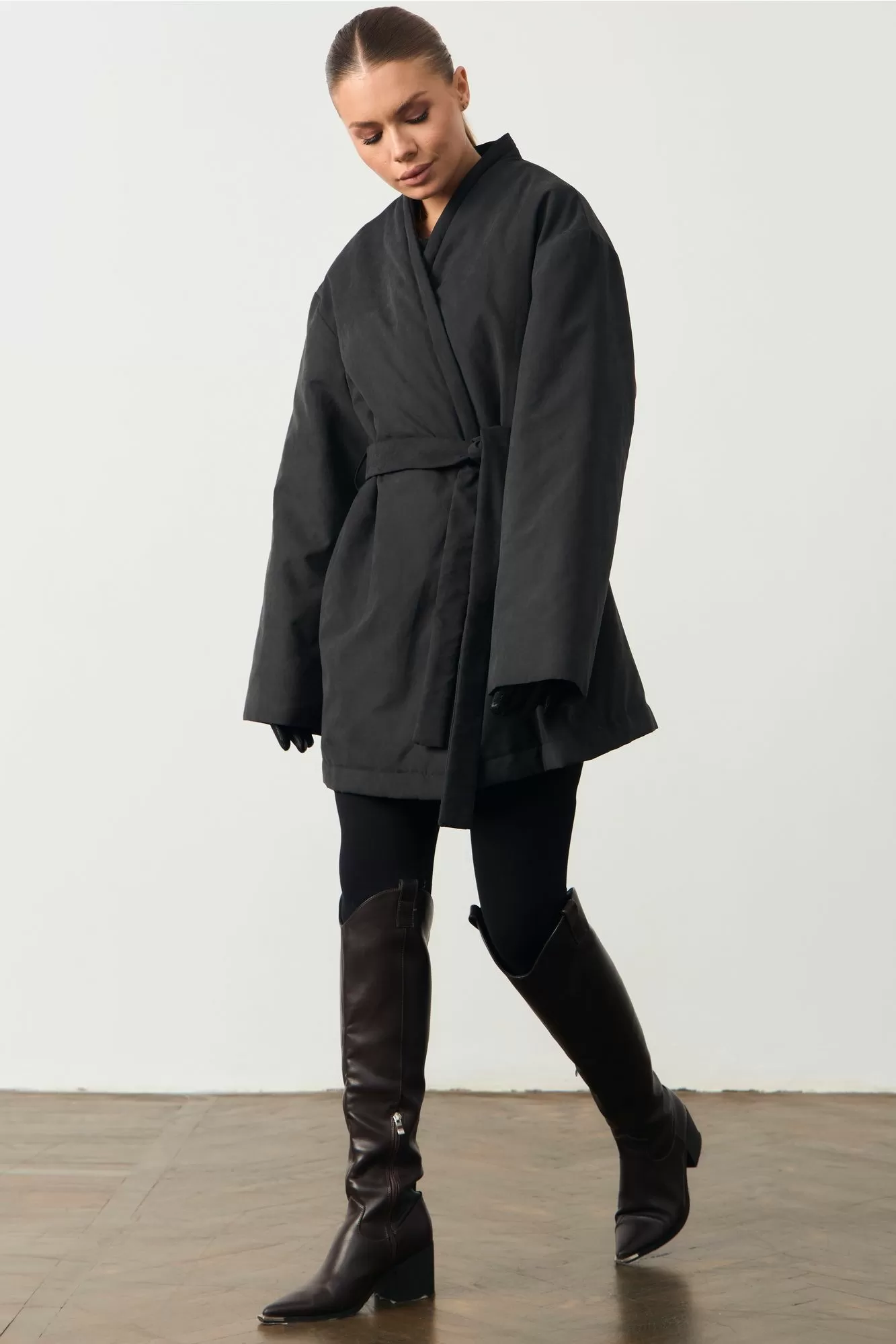 Куртка-кимоно из водостойкой плащёвой ткани. В боковых швах карманы. По краю борта отстрочки.Модель с поясом.