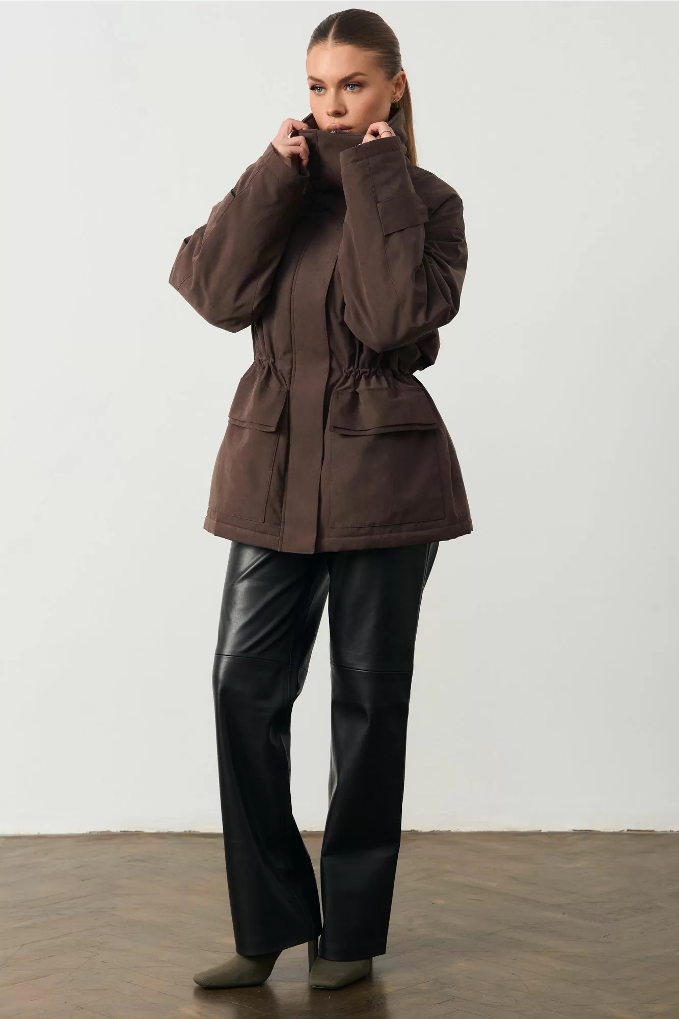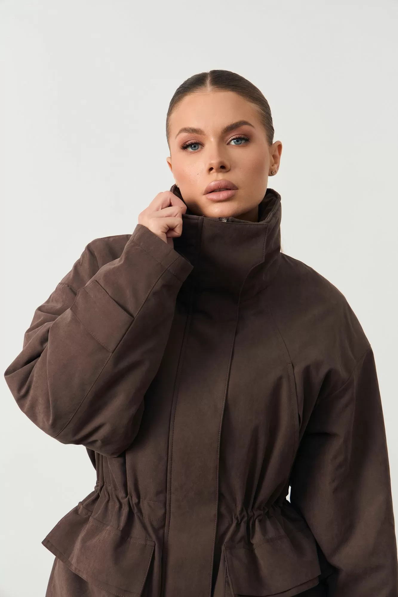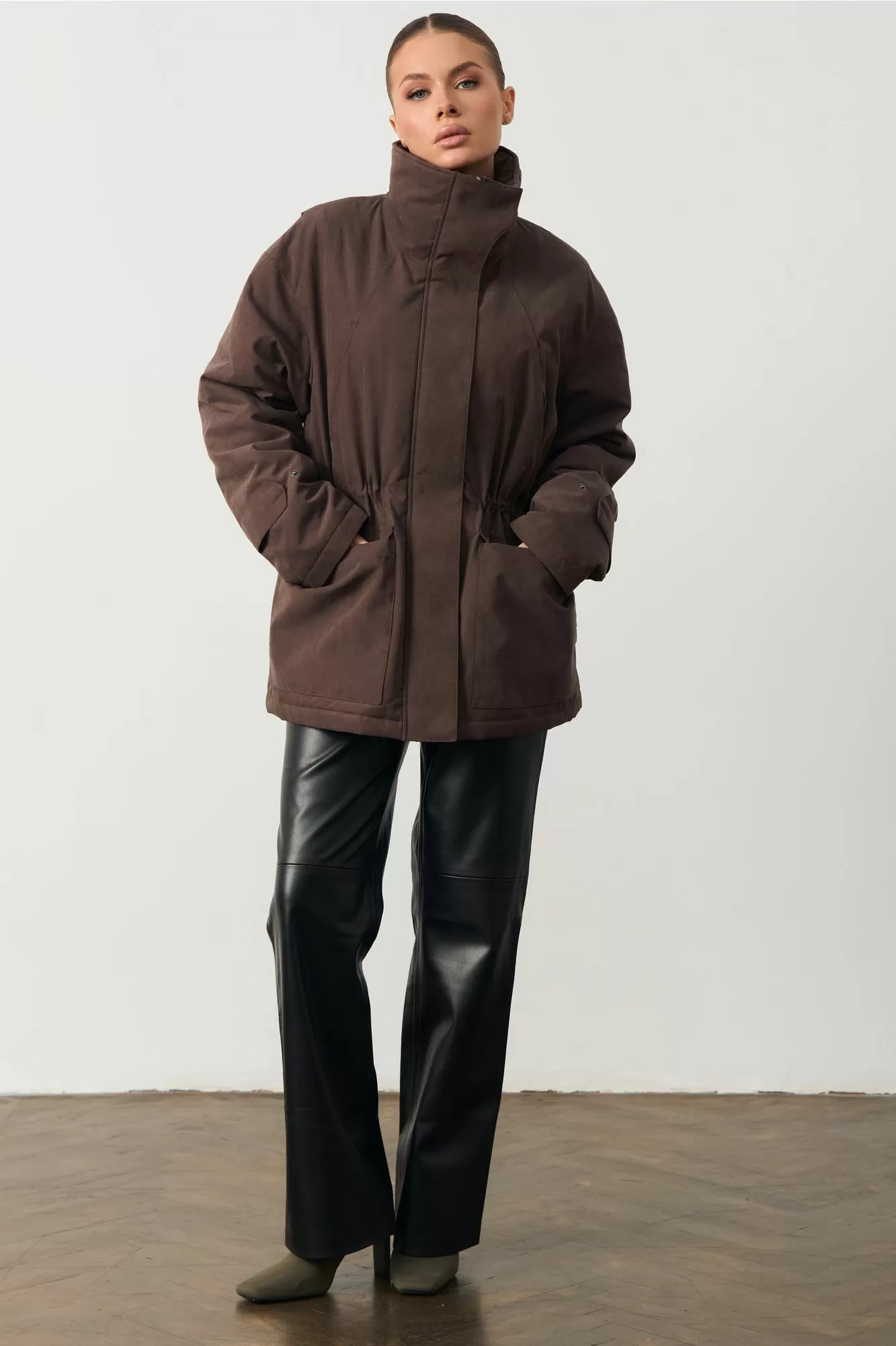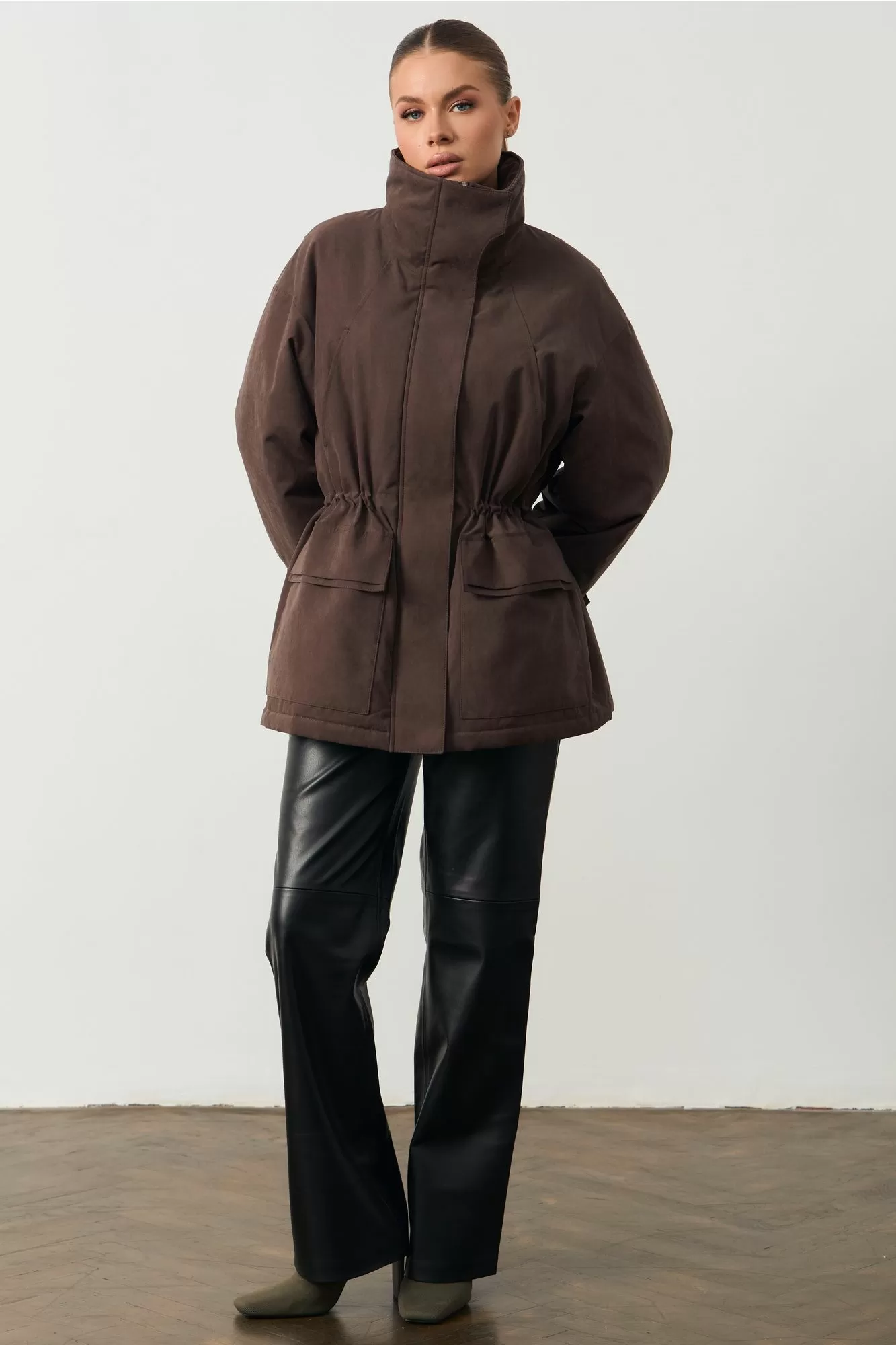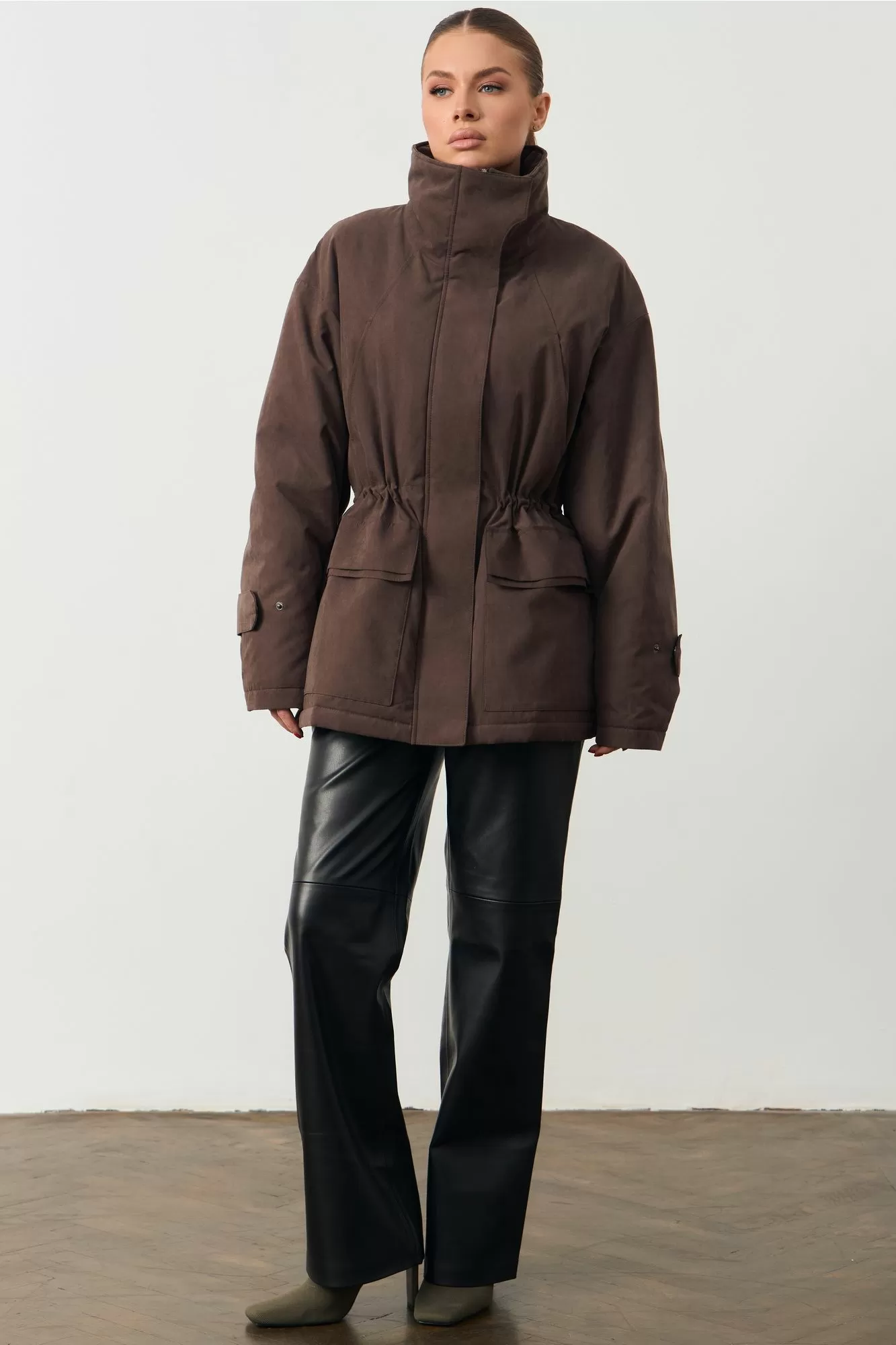 Женская куртка с высоким воротом. На поясе кулиска. Изделие прямого кроя. Длина изделия 74см; Длина рукава 75см.