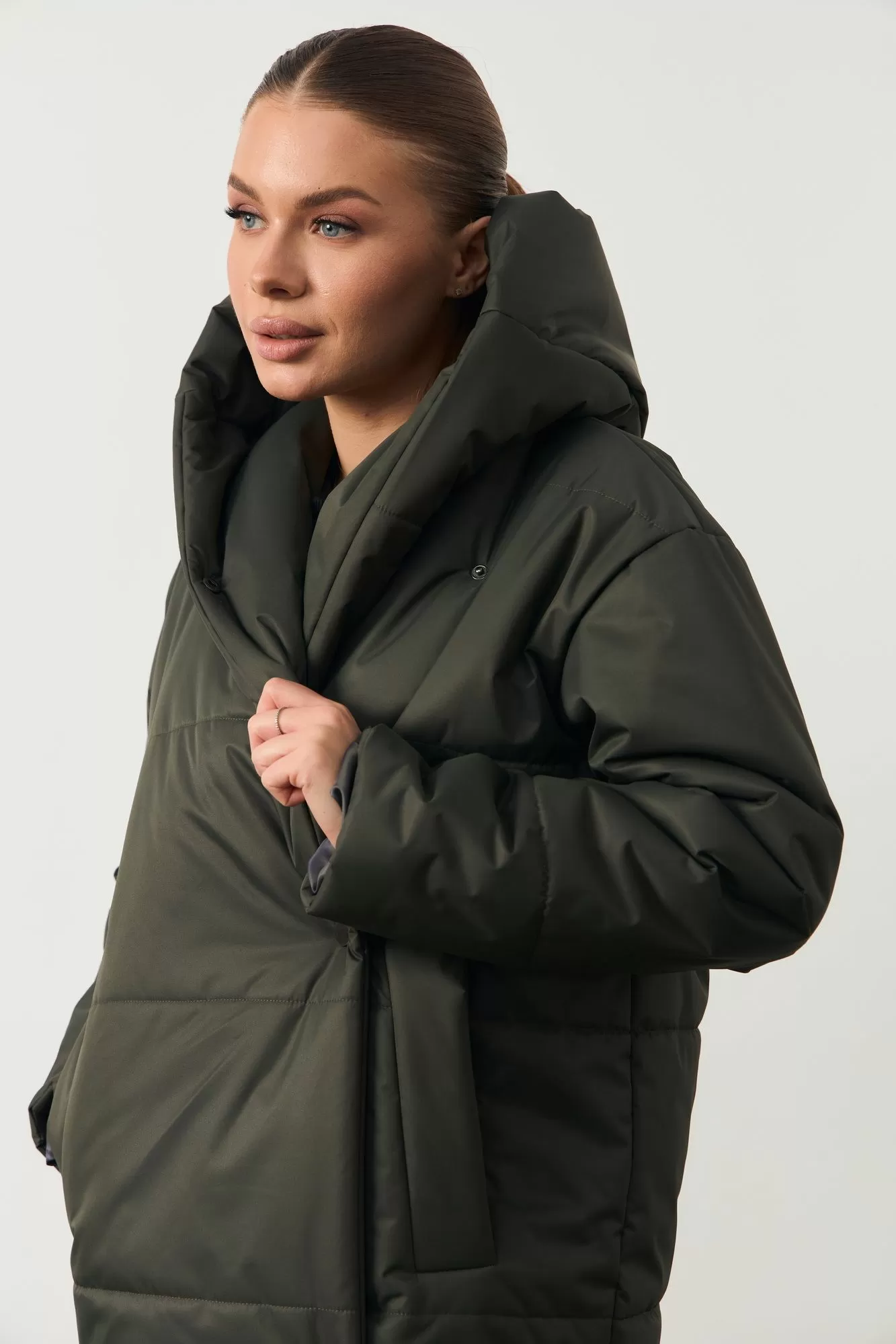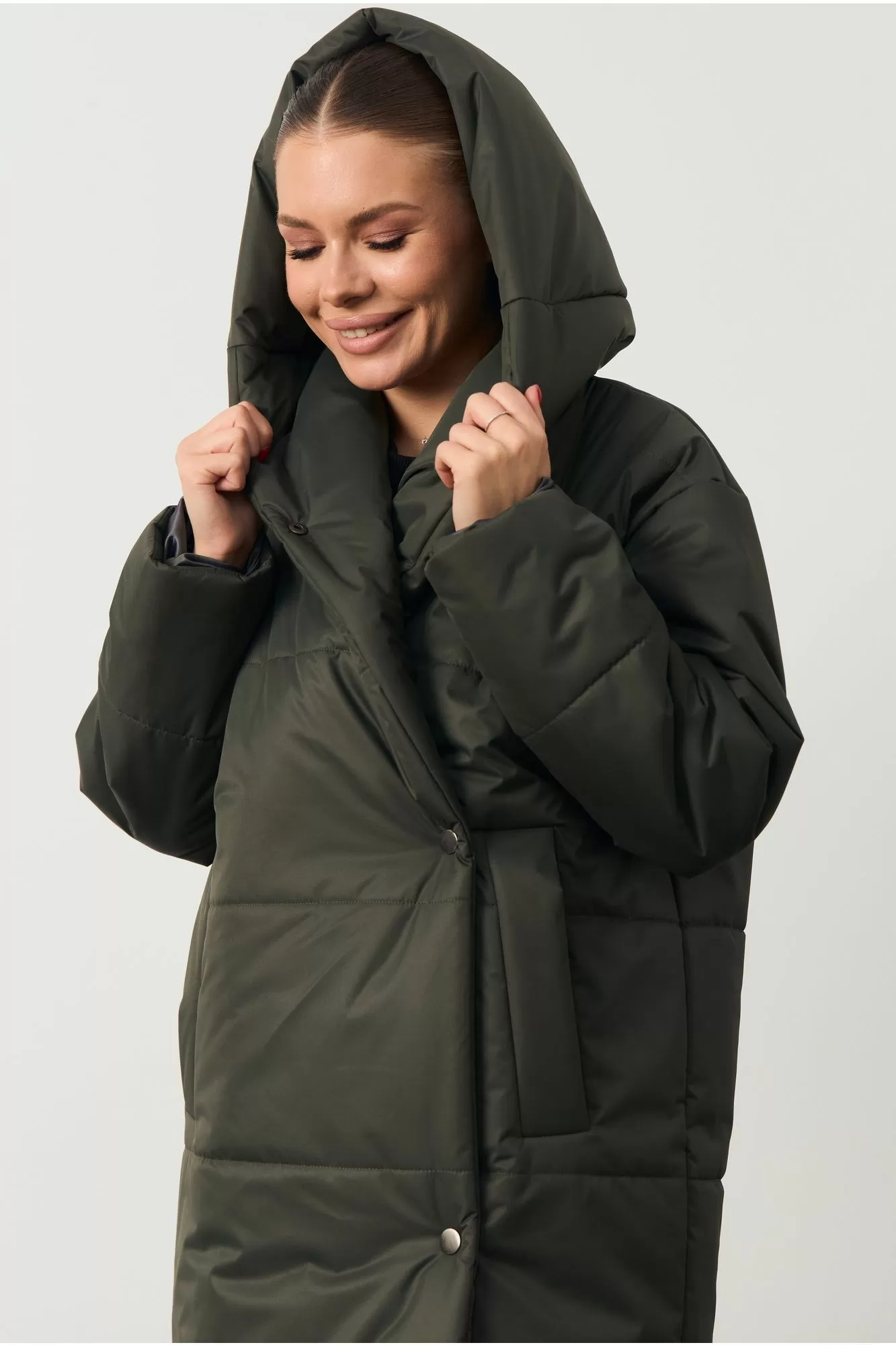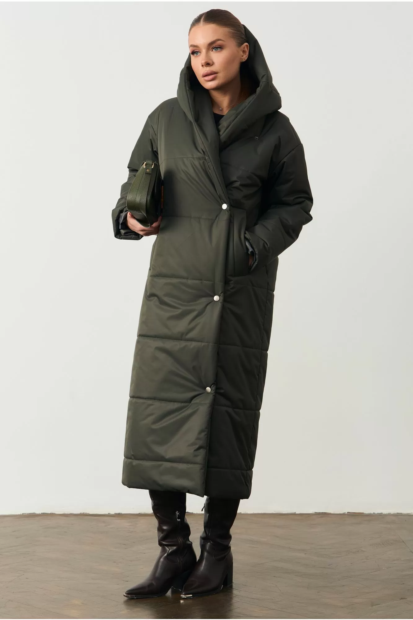 Пальто из плащёвой ткани с водоотталкивающей пропиткой.Пальто двубортное, с застежкой на кнопки. Рукав спущенный. Пальто на синтепоне. Пальто с капюшоном. В комплекте съемный пояс. Длина изделия 126 см