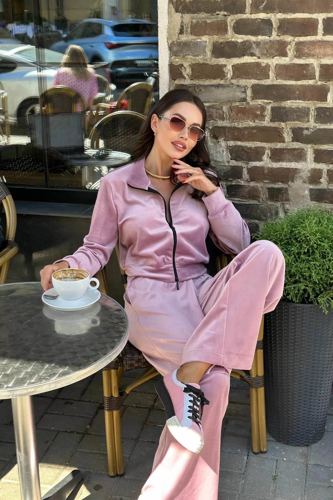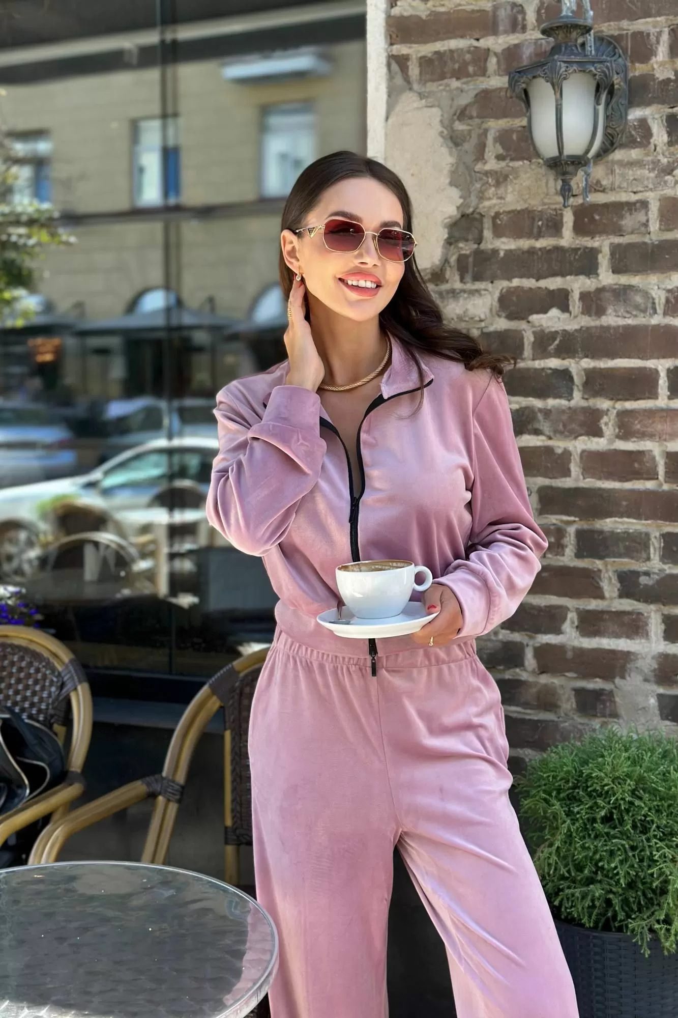 Костюм спортивный, 2-х предметный, состоит из джемпера и брюк. Джемпер прямого силуэта, застежка - молния разъёмная по центру переда. Рукава втачные, прямые. Брюки на резинке, средняя линия иалии, брюки свободные. Клстюм выполнен из эластичной велюровой ткани