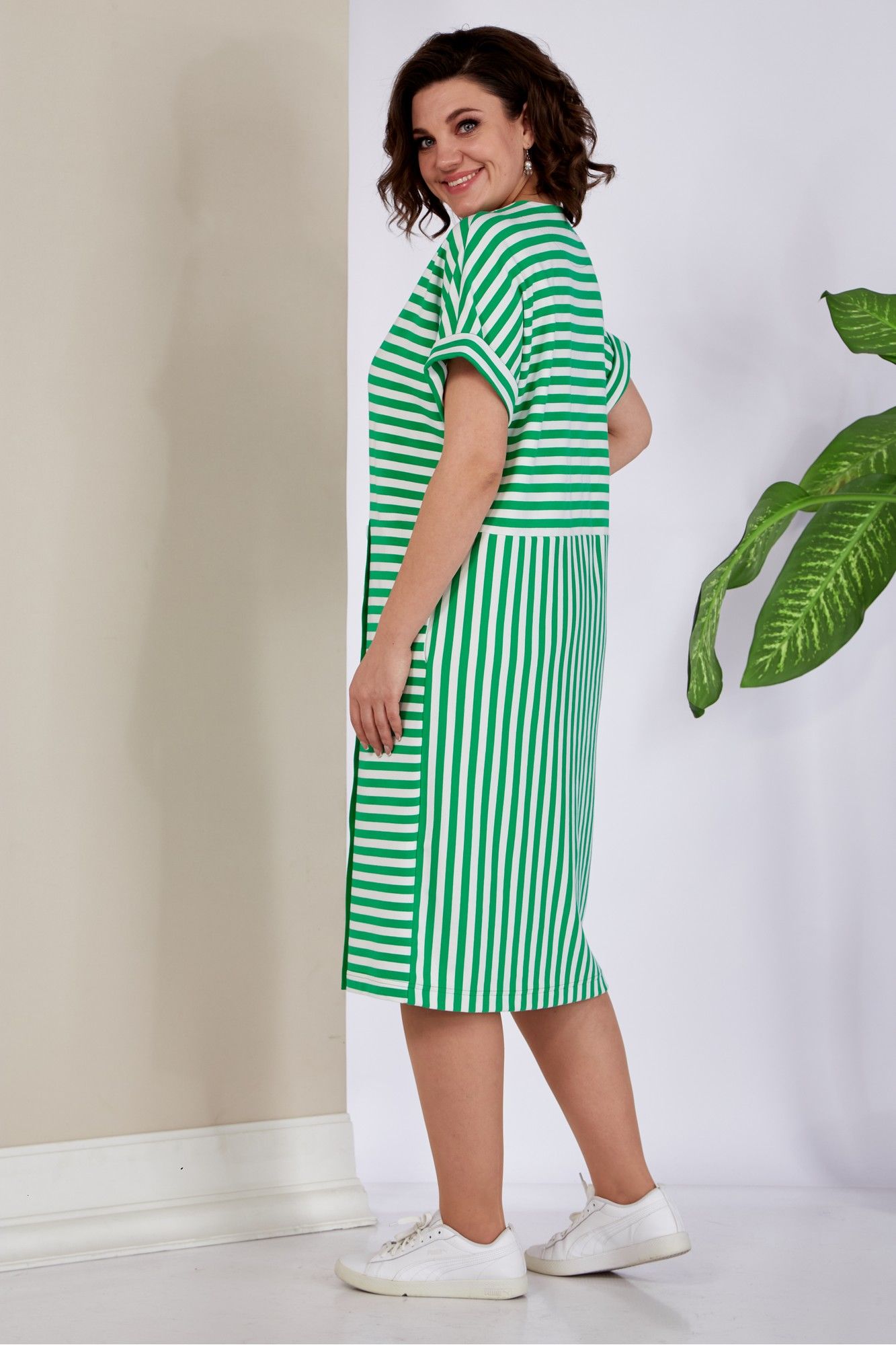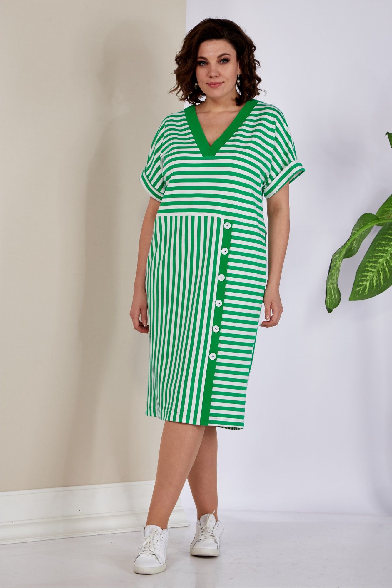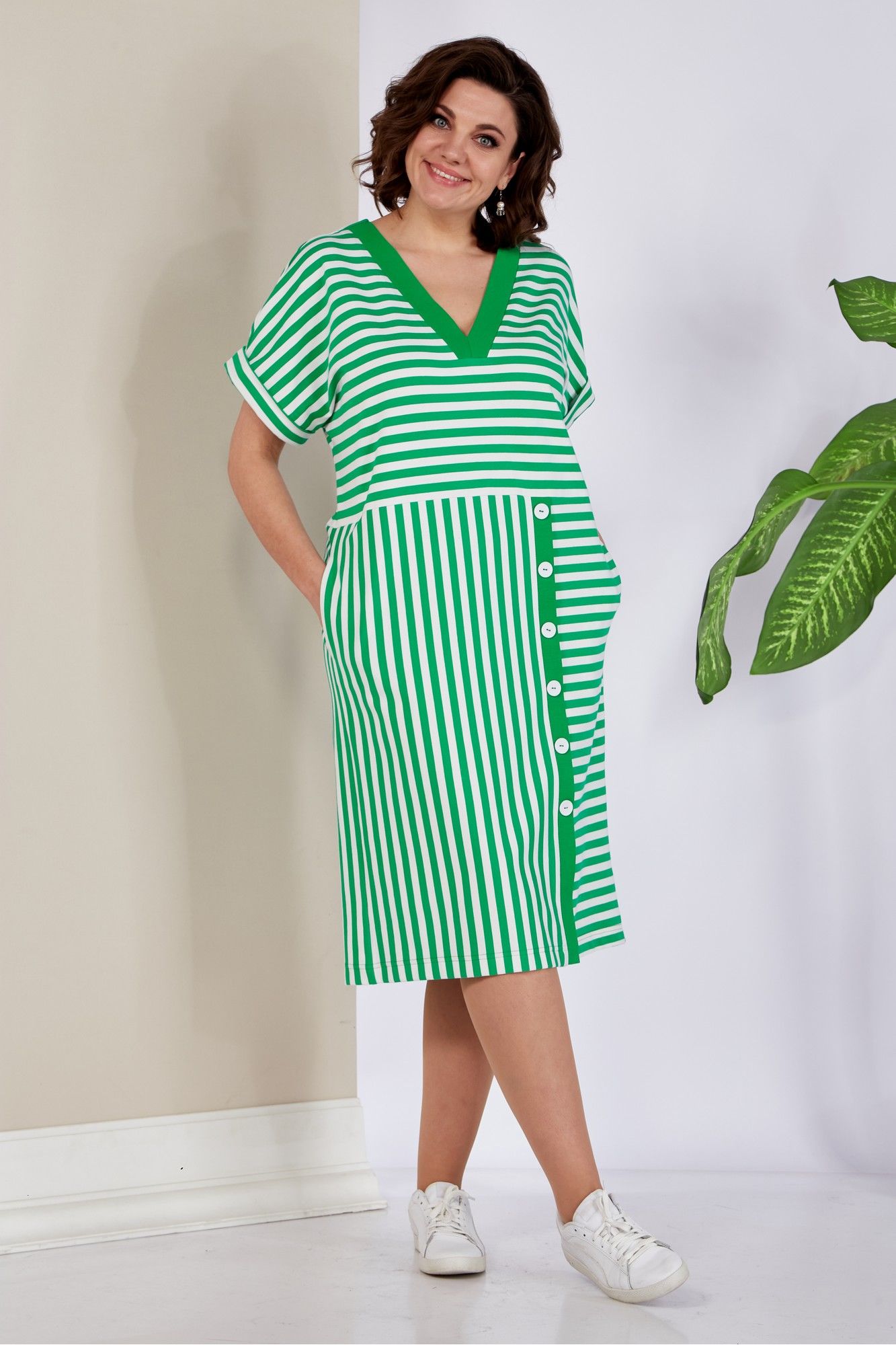 Платье женское прямого силуэта, V-образный вырез горловины. Платье сшито из плотной мягкой кулирной глади в полоску. В боковых швах карманы. Длина-110 см.