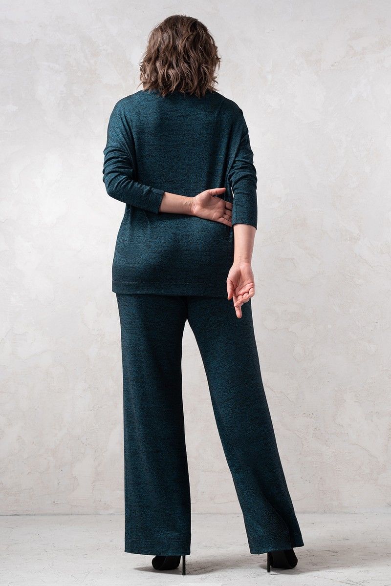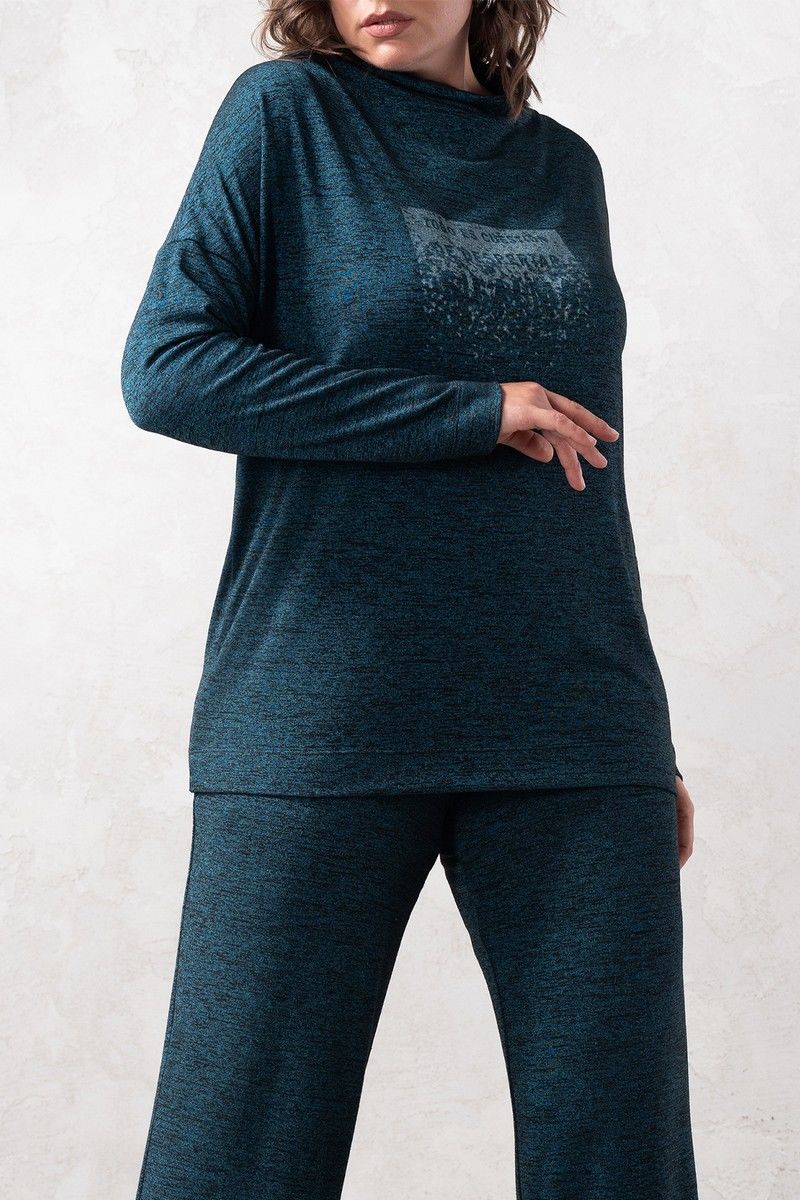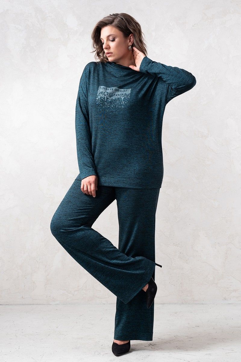 Трикотажный комплект двойка: джемпер+брюки. Трикотаж мягкий, приятный на ощупь, эластичный. Джемпер свободного кроя, рукав втачной на спущенной пройме. Длина рукава - полный. Длина джемпера 75 см. На переде печать. Брюки удобные, прямые, талия на резинке. Длина брюк по боковому шву 112 см.