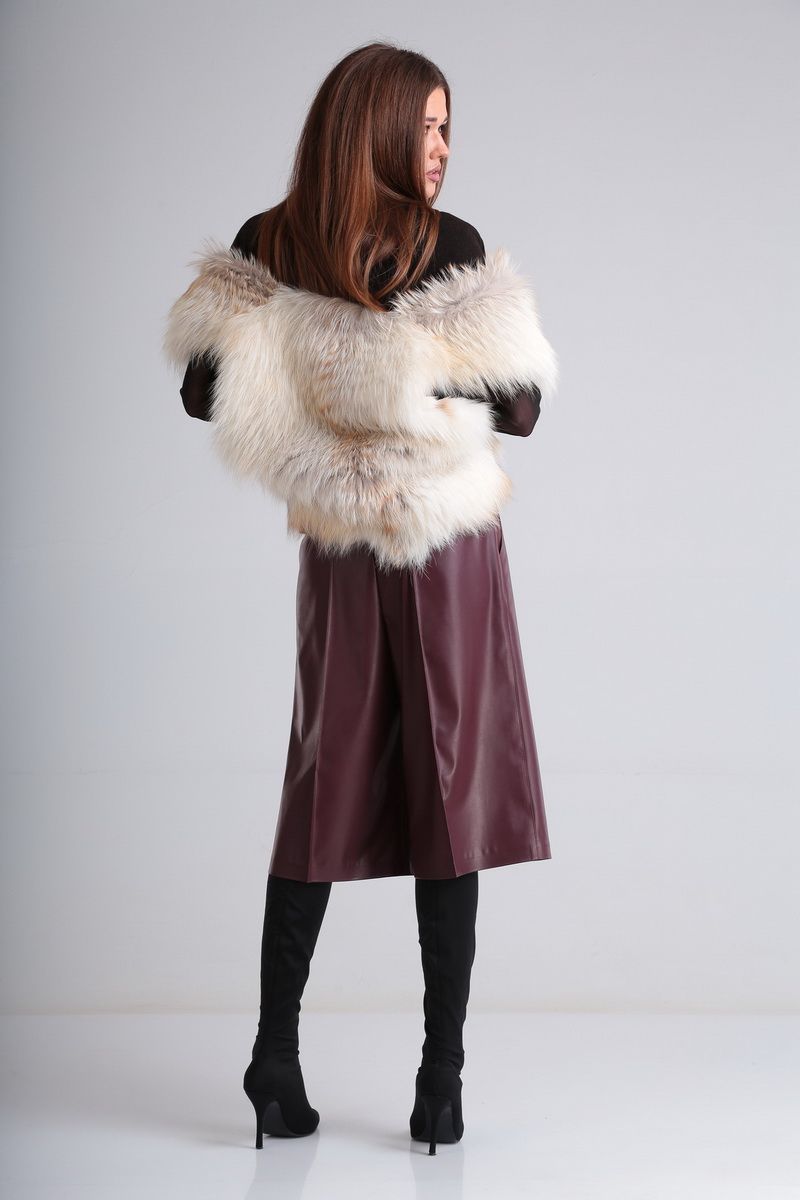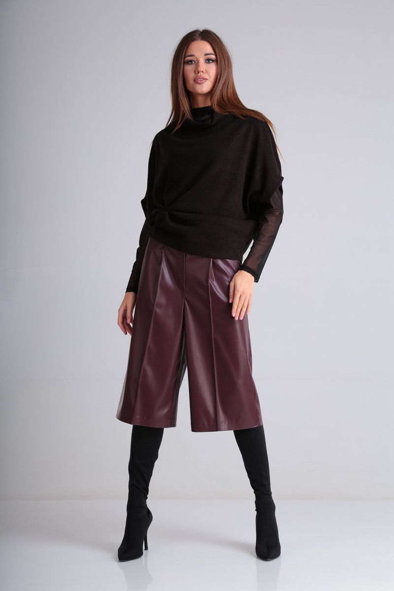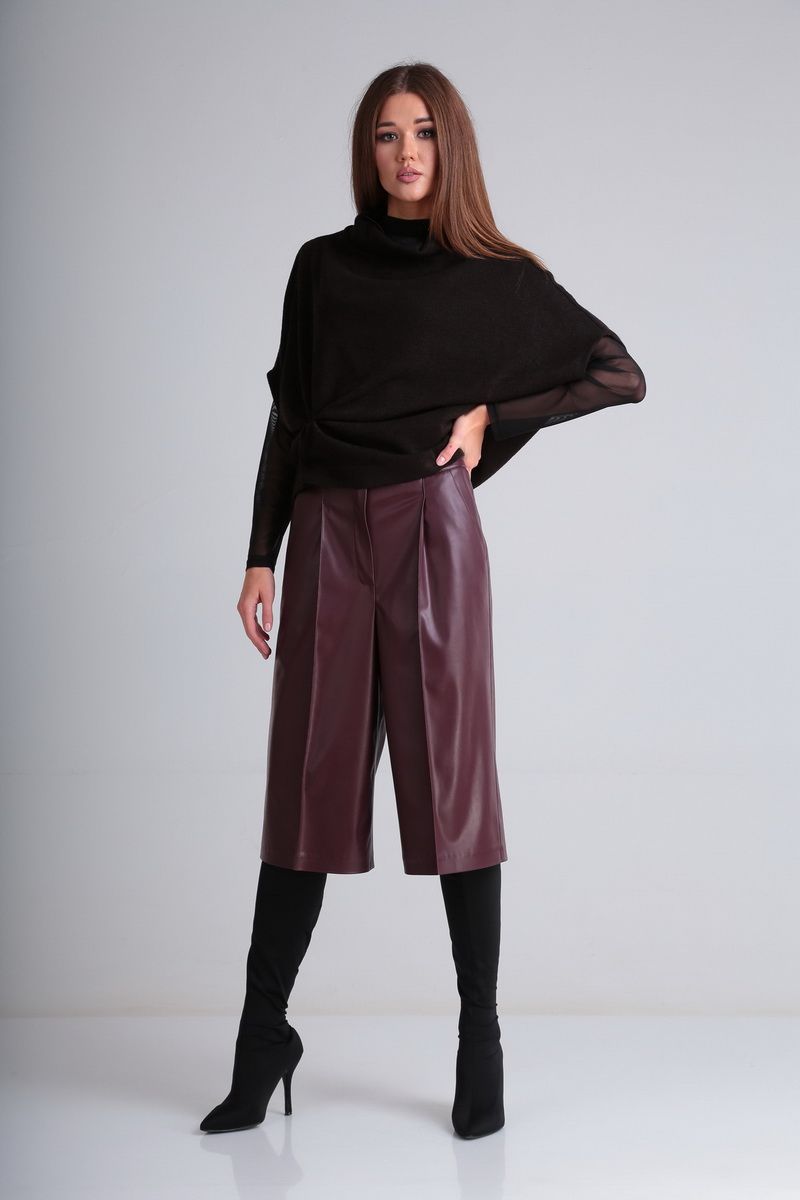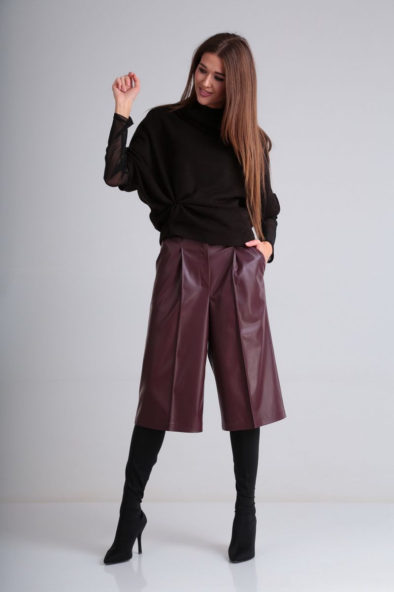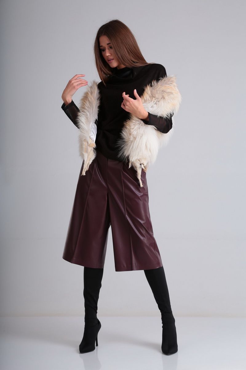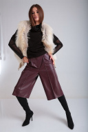 В этом году кюлоты бьют рекорды по популярности и становятся самыми модными брюками года! Именно свободные брюки-кюлоты могут подчеркнуть достоинства Вашей фигуры. Кюлоты можно смело носить с топами, жакетами и блейзерами, с которыми они станут суперэлегантными. А с простыми футболками, объемными пуловерами создадут более спортивный образ. Представленная модель выполнена на притачном поясе, длина за колено. Застежка типа «гульфик» на петлю – пуговицу. В боковых швах расположены функциональные косые карманы. По передней и задней половинке изделия расположены застроченные стрелки. Модные кожаные кюлоты— это та самая крутая базовая вещь для создания модного образа Вашего гардероба. Длина брюк 70 см