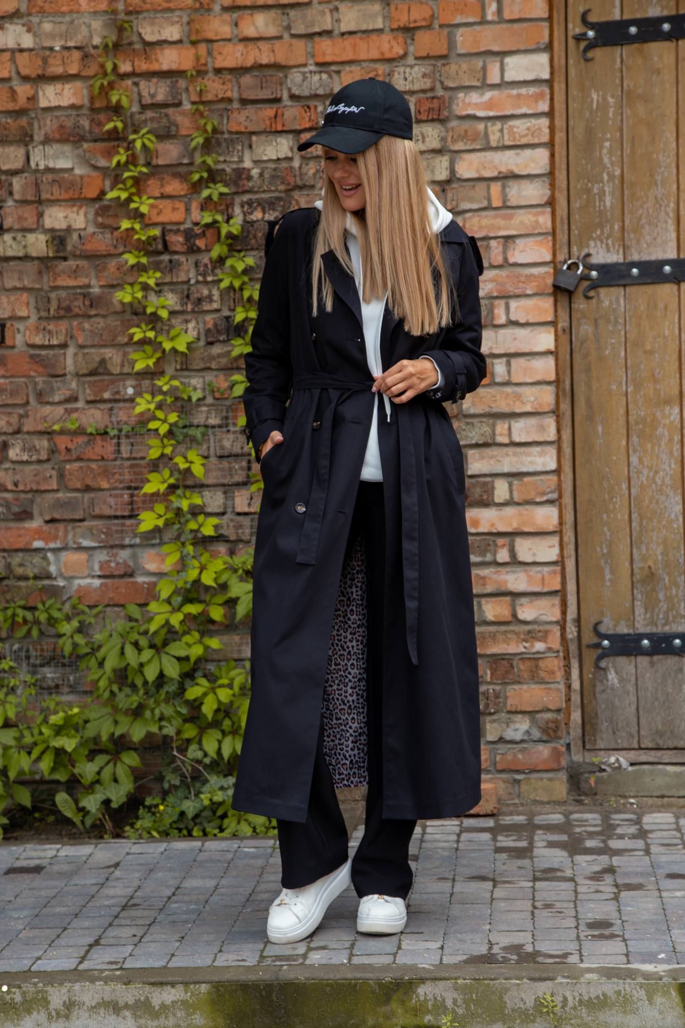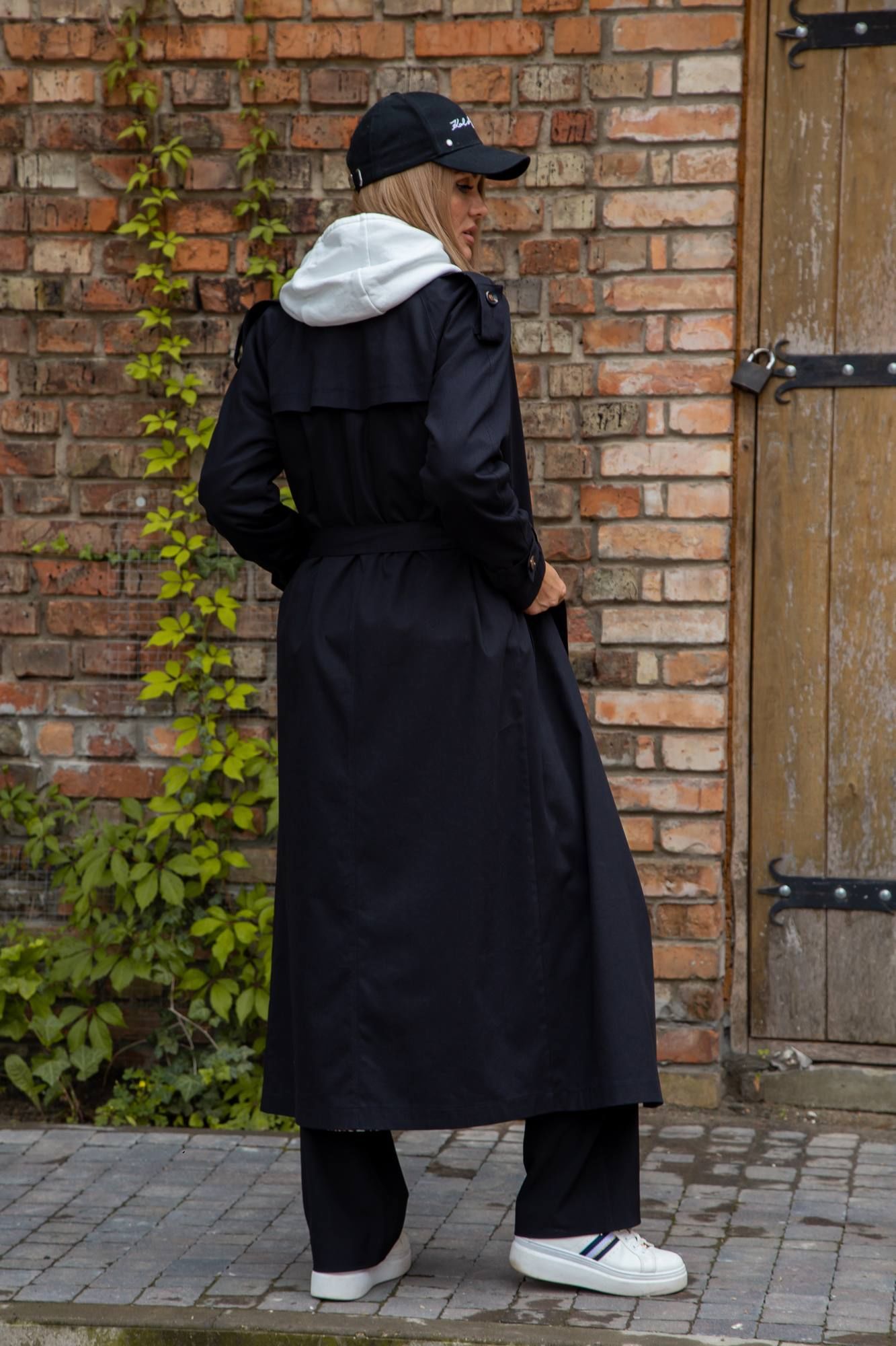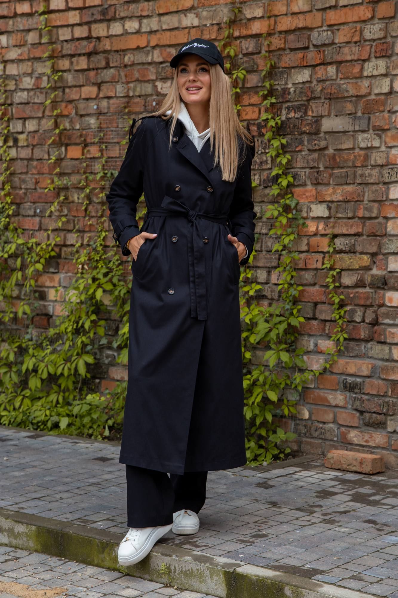Плащ женский, удлинённый, двубортный, под съёмный пояс воротник на стойке, рукав покроя "реглан" с патами и погонами, застёжка спереди на петли и пуговицы, по переду карманы с листочками, на спинке-кокетка, изделие на подкладке.