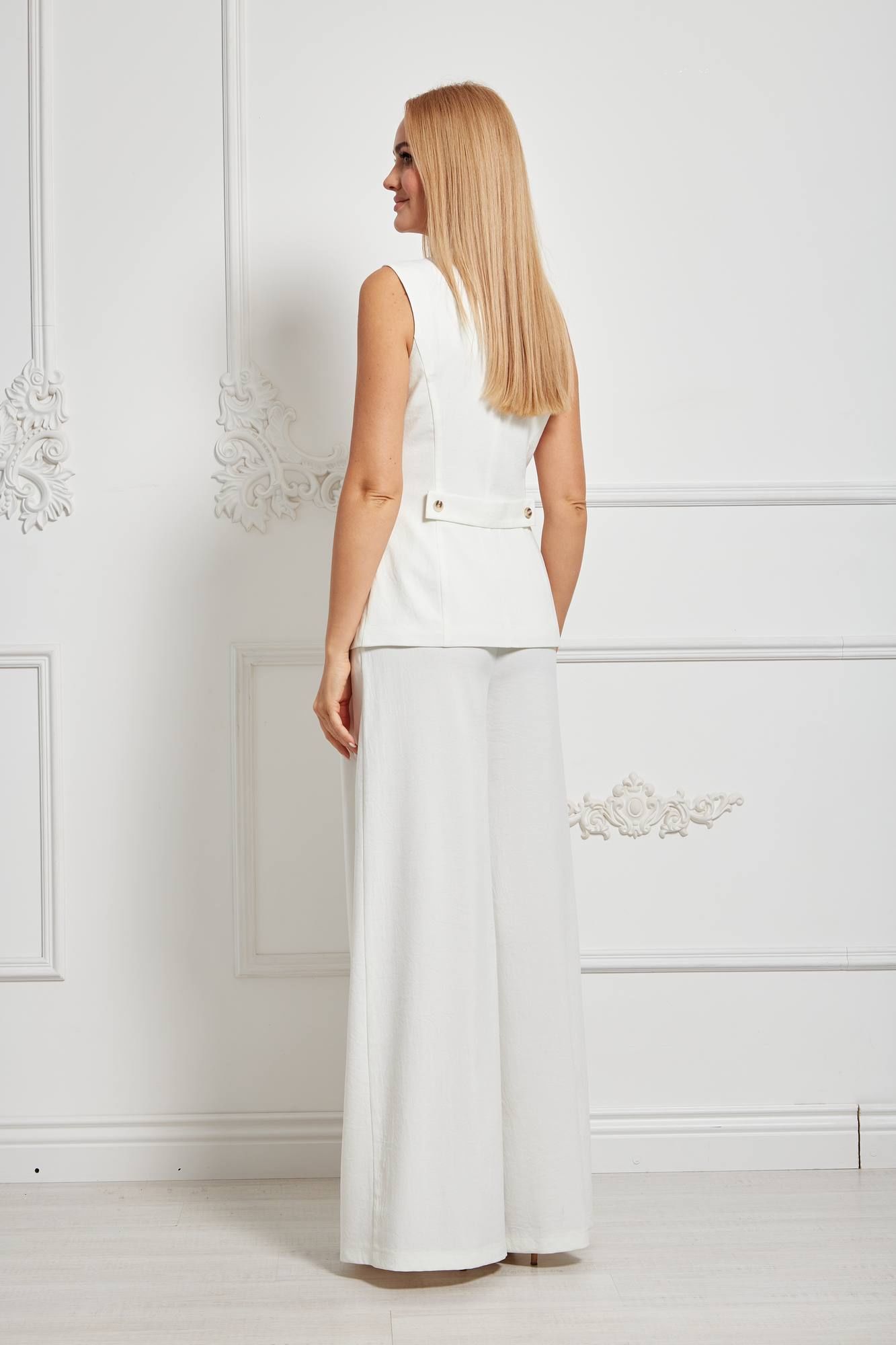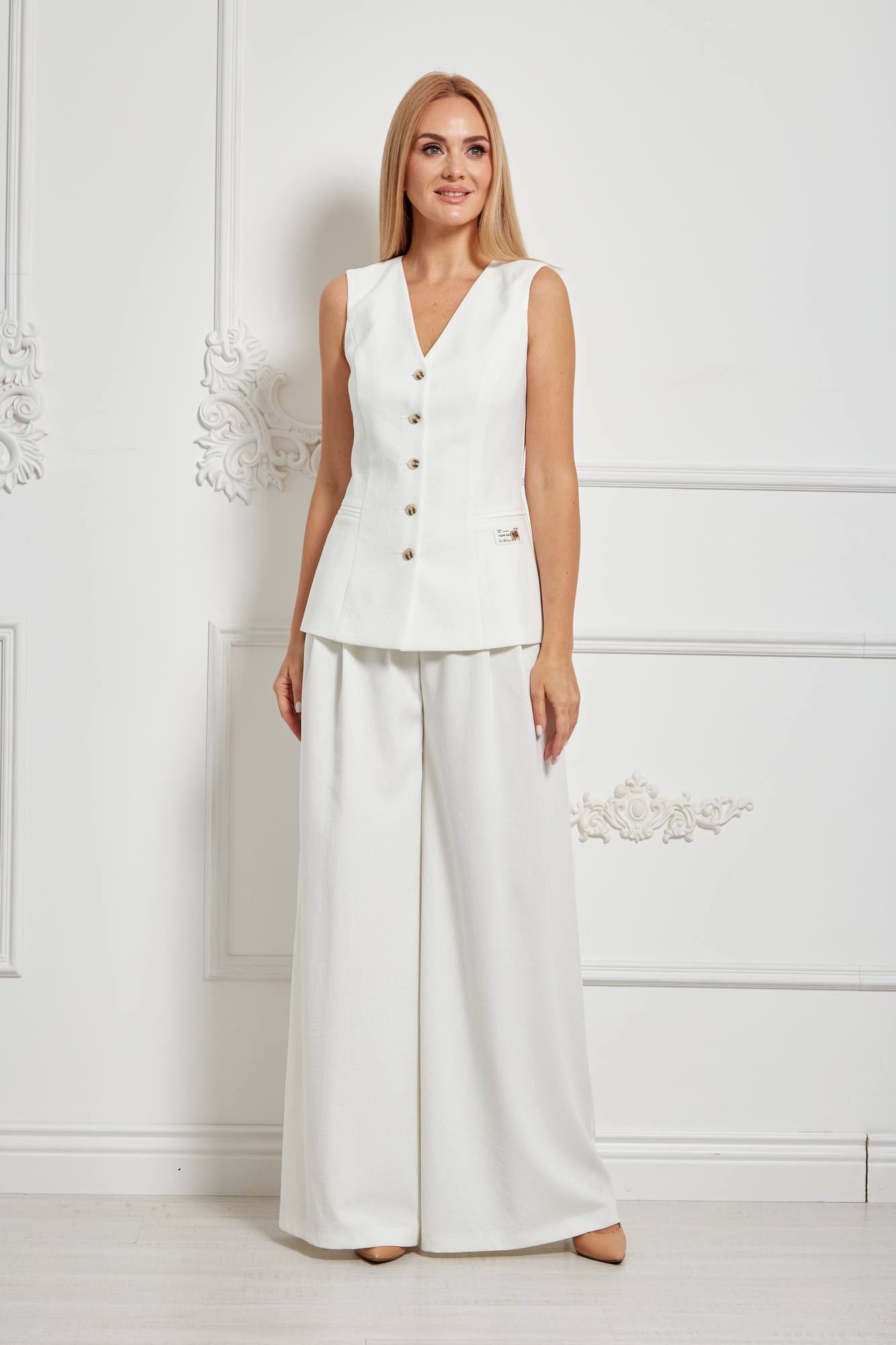 Комплект женский, состоящий из жилета и брюк из одного вида ткани. Жилет удлинённый до линии бёдер, прилегающего силуэта, вырез горловины v-образный, застёжка спереди на пуговицы, по переду карманы-"обманки", изделие на подкладке. Брюки широкие со складками по передним половинкам, на поясе-кокетке, застёжка спереди на молнию и пуговицы, с карманами. Ширина по линии груди (42):44см (44):46см (46):48см (48):50см (50):52см (52):54см Ширина по линии бедер жилет(42):48см брюки:48см жилет(44):50см брюки:50см жилет(46):52см брюки:52см жилет(48):54см брюки:54см жилет(50):56см брюки:56см жилет(52):58см брюки:58см Ширина по линии талии (42):35см (44):37см (46):39см (48):41см (50):43см (52):45см Длина изделия жилет:61-62см брюки:112см