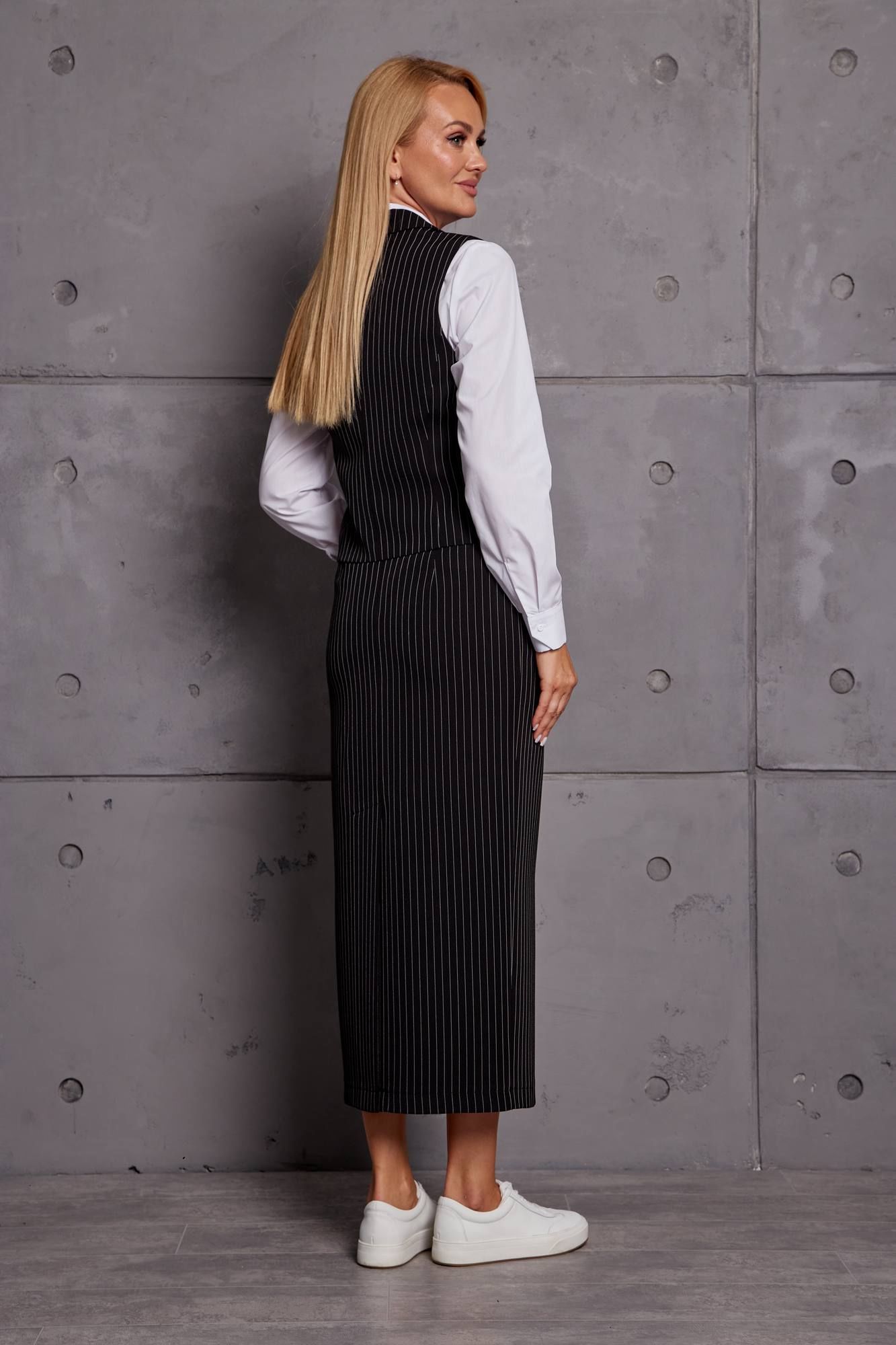 Комплект женский юбочный, состоит из жилета и юбки. Жилет укороченный, двубортный с отложным воротником с лацканами, по переду и спинке вертикальный рельефы, по переду обманки-клапаны, изделие на подкладке. Юбка прямая, зауженная к низу, на поясе, застёжка сзади на молнию и пуговицу, с боковыми карманами, сзади шлица, изделие на подкладке.