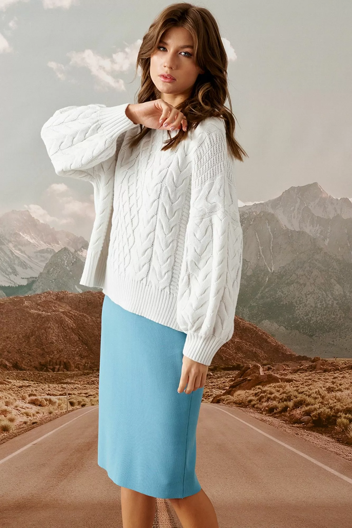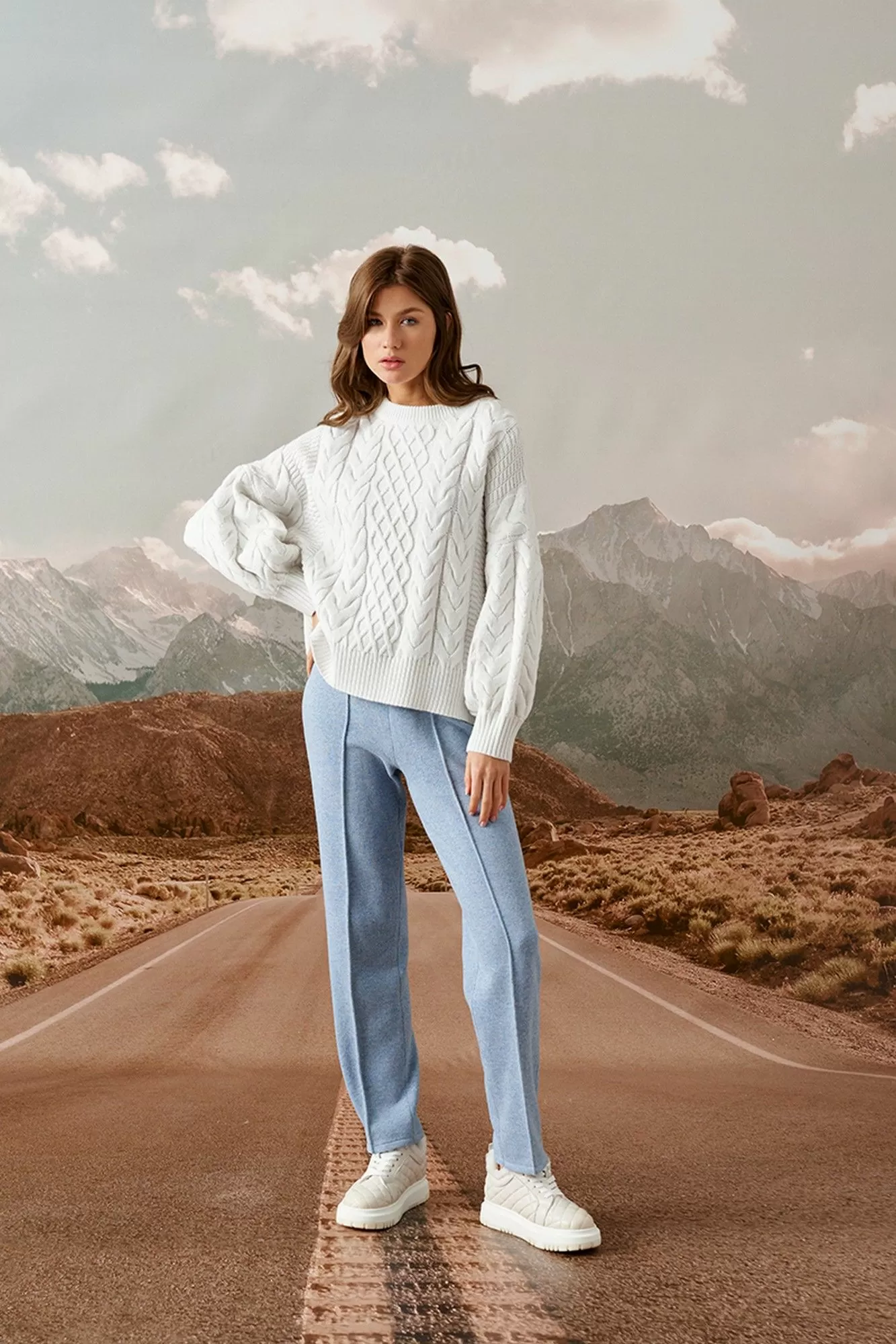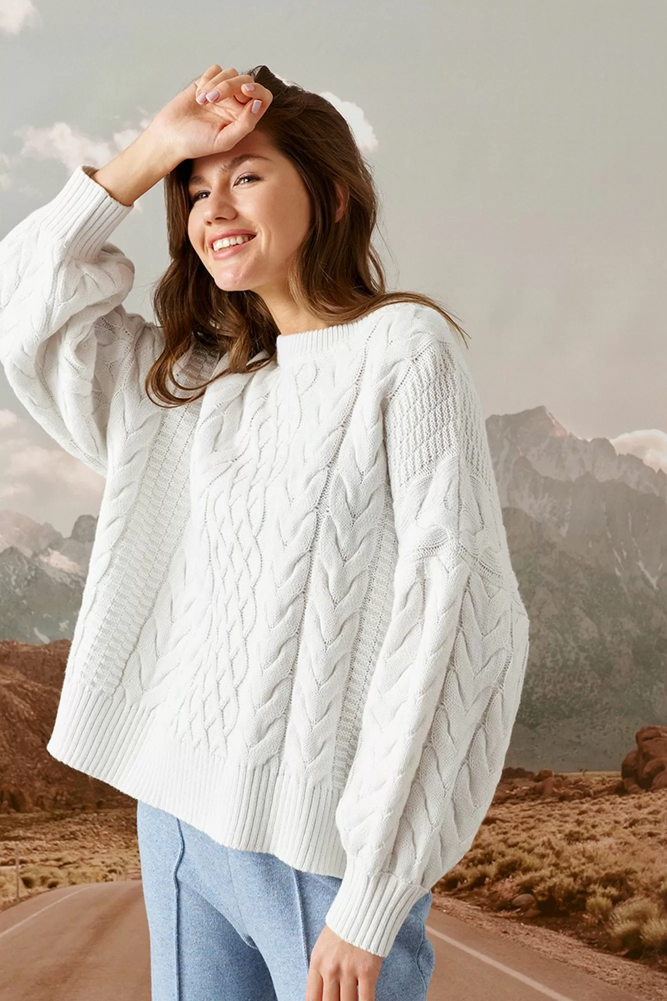 Джемпер выполнен в объемном переплетении с элементами косы.