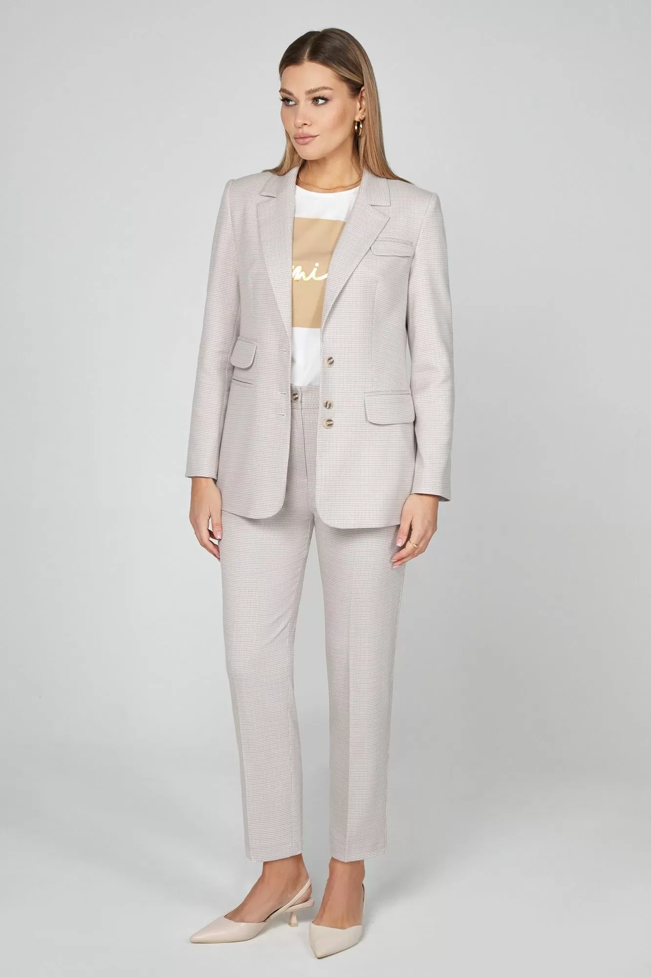 На передовой моды: модный однобортный жакет полуприлегающего силуэта с приятным рисунком в мелкую гусиную лапку, стильно подчёркнутый сочетанием карманов и интересным расположением пуговиц по борту. Приятная испанская ткань с добавлением вискозы прекрасно держит форму и обеспечивает свободу движений и комфорт. Рукава втачные двухшовные. На подкладке. Универсальный компаньон для множества нарядов.