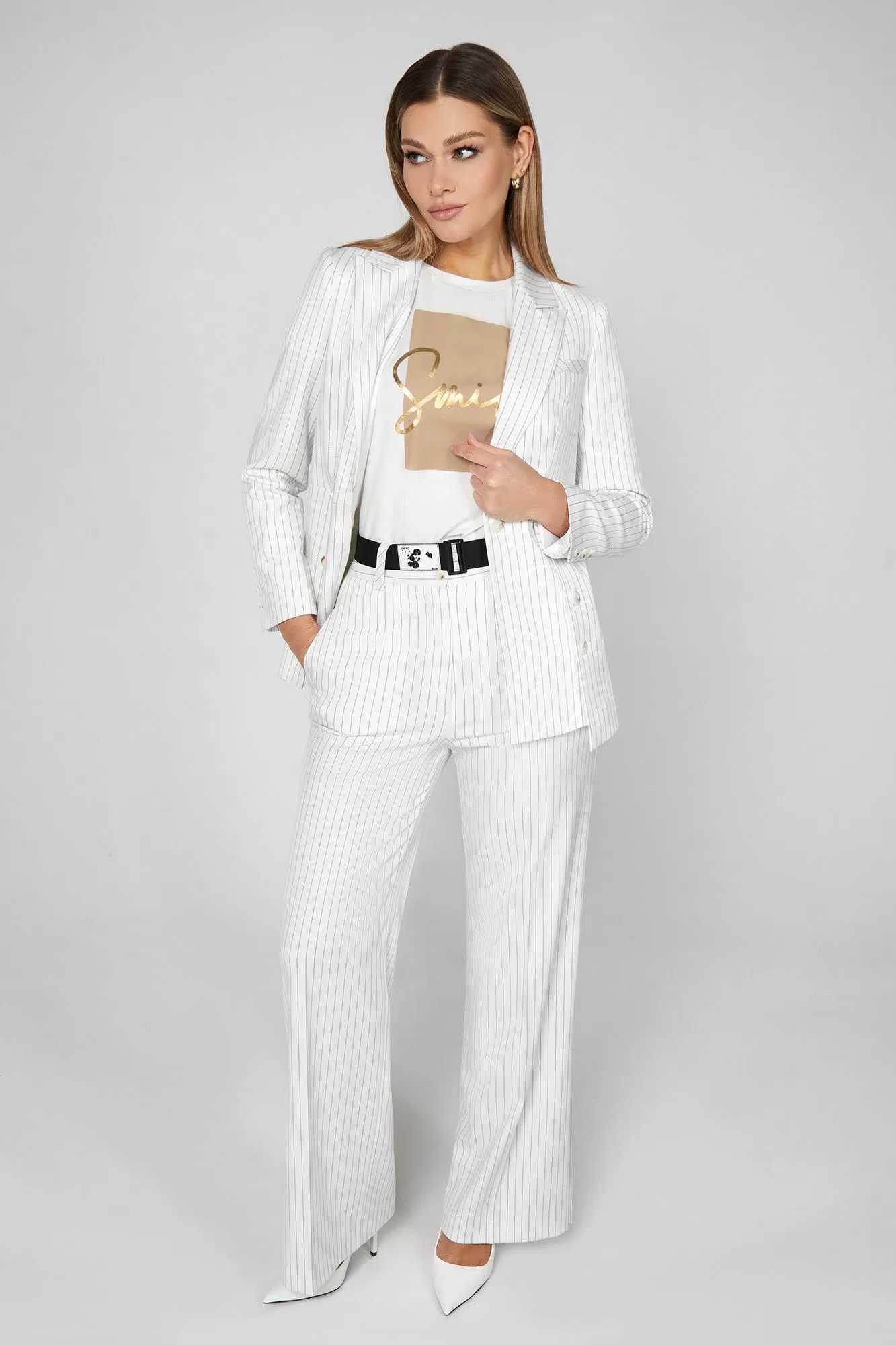 Легкий и повседневный вариант для весны! После долгих зимних месяцев с первыми теплыми днями хочется легких нарядов. Соответственно, этот светлый пиджак в тонкую полоску является обязательным элементом гардероба модницы, который образует шикарный ансамбль с соответствующими брюками широкого кроя. Эта модель из поливискозной испанской ткани спрямлённого силуэта впечатляет интересными элементами в виде отделочных шлиц с пуговицами по переду, спинке и рукавам , застежкой на одну пуговицу в шве по линии талии и необычной задумкой линии низа. А также дополнен классической формой лацканов с отложным воротником и функциональными карманами в боковых швах. На подкладке.
