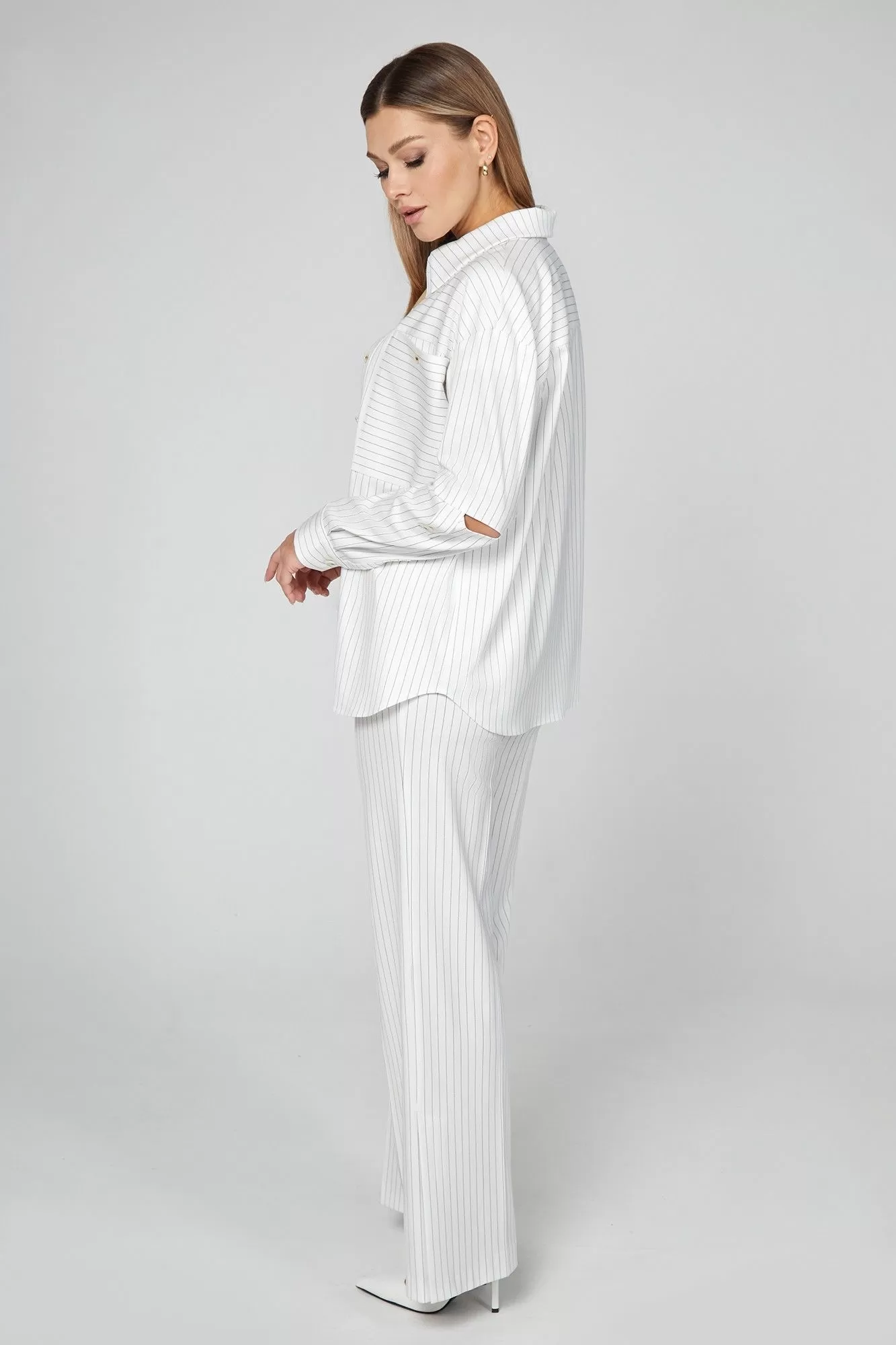 Блузка свободного кроя выполнена из приятной светлой поливискозной ткани с узором в полоску, придающим модели динамичности. Изделие с отложным воротником-стойкой, застёжкой на петли-пуговицы, со спущенной линией плеча, с интересными рукавами с горизонтальными щелевидными разрезами, зафиксированными с помощью паты и пуговицы и дополнена нагрудными отделочными карманами. Сочетайте изделие с брюками из той же линейки для создания готового образа.