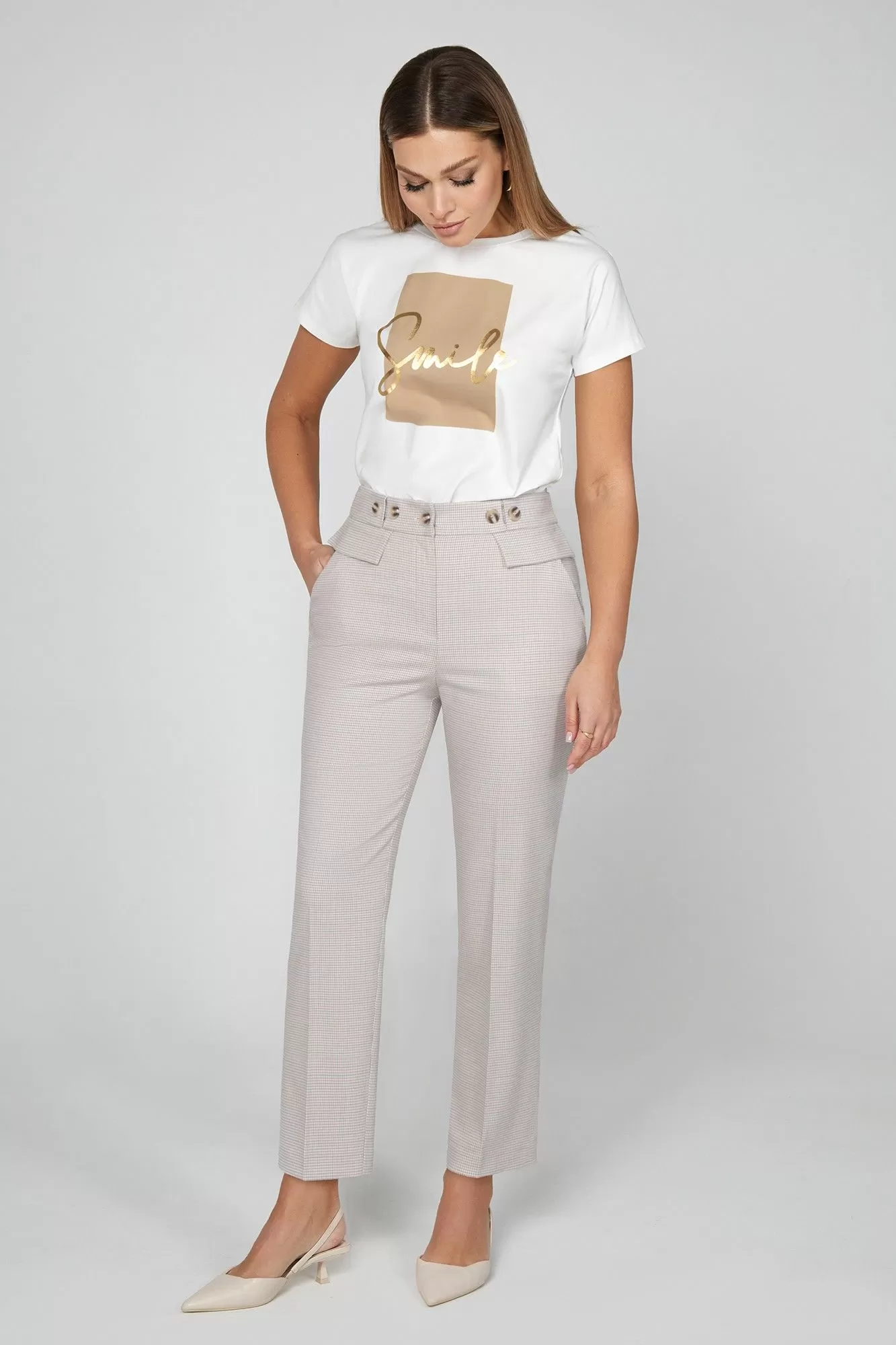 Эти элегантные брюки предлагают идеальный симбиоз стиля и функциональности. Притачной пояс, частично собранный на эластичную тесьму, застёжка на молнию и петлю-пуговицу и боковые косые карманы дополняют образ практичной функциональностью, а задний карман с листочкой и передние декоративные клапаны в сочетании с интересным решением отделки пояса, подчёркивают шикарный вид этих брюк. Данная модель классической длины со стрелками особенно хорошо смотрятся в качестве брюк для костюма и подходит как и для повседневных стилей, так и для офиса.