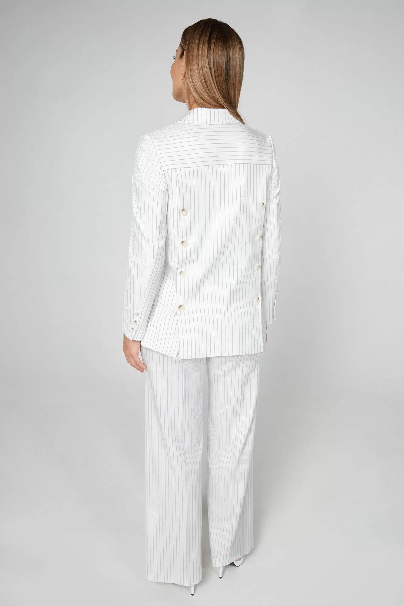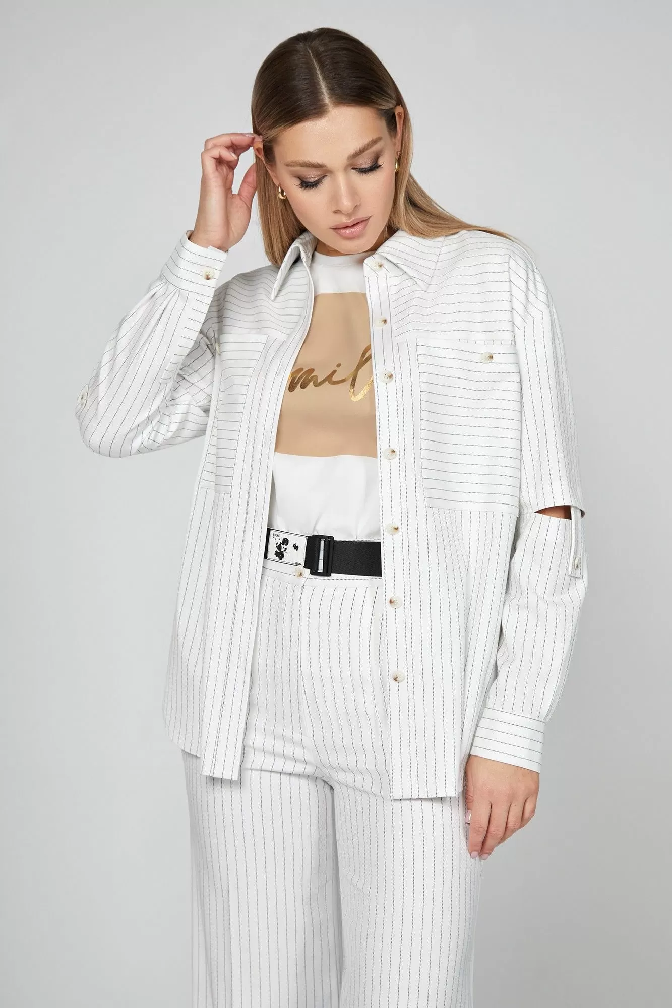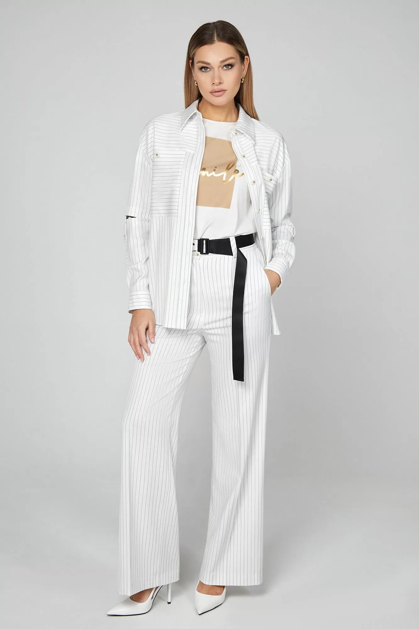 Модное обновление: эти светлые широкие брюки с полосатым узором из эластичной поливискозной испанской ткани привнесут глоток свежего воздуха в ваш гардероб. Современный дизайн в сочетании с модным кроем делают эту базовую модель привлекотельной. Изделие на притачном поясе со шлёвками, собранном на эластичную тесьму по спинке, спереди застёжка на молнию и петли-пуговицы и функциональные косые карманы.Модель дополнена контрастным поясом-тесьмой с пряжками, делающим образ более современным. Идеальный стиль с соответствующим жакетом или блузкой для городского модного образа.