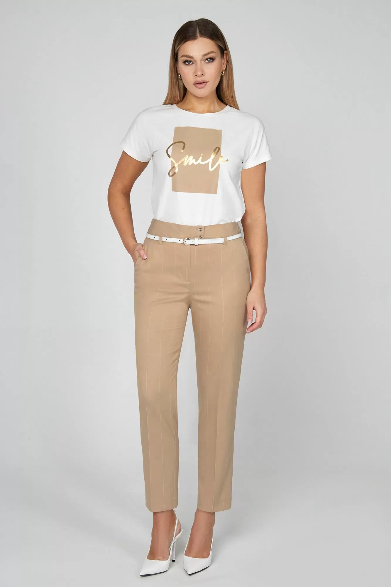 Хлопковый блузон получился в равной степени комфортным и красивым. Спереди изделие украсили принтом с мерцающим элементом. Модель с цельнокроеными короткими рукавами будет интересным вариантом как и для офиса, так и в повседневном гардеробе.