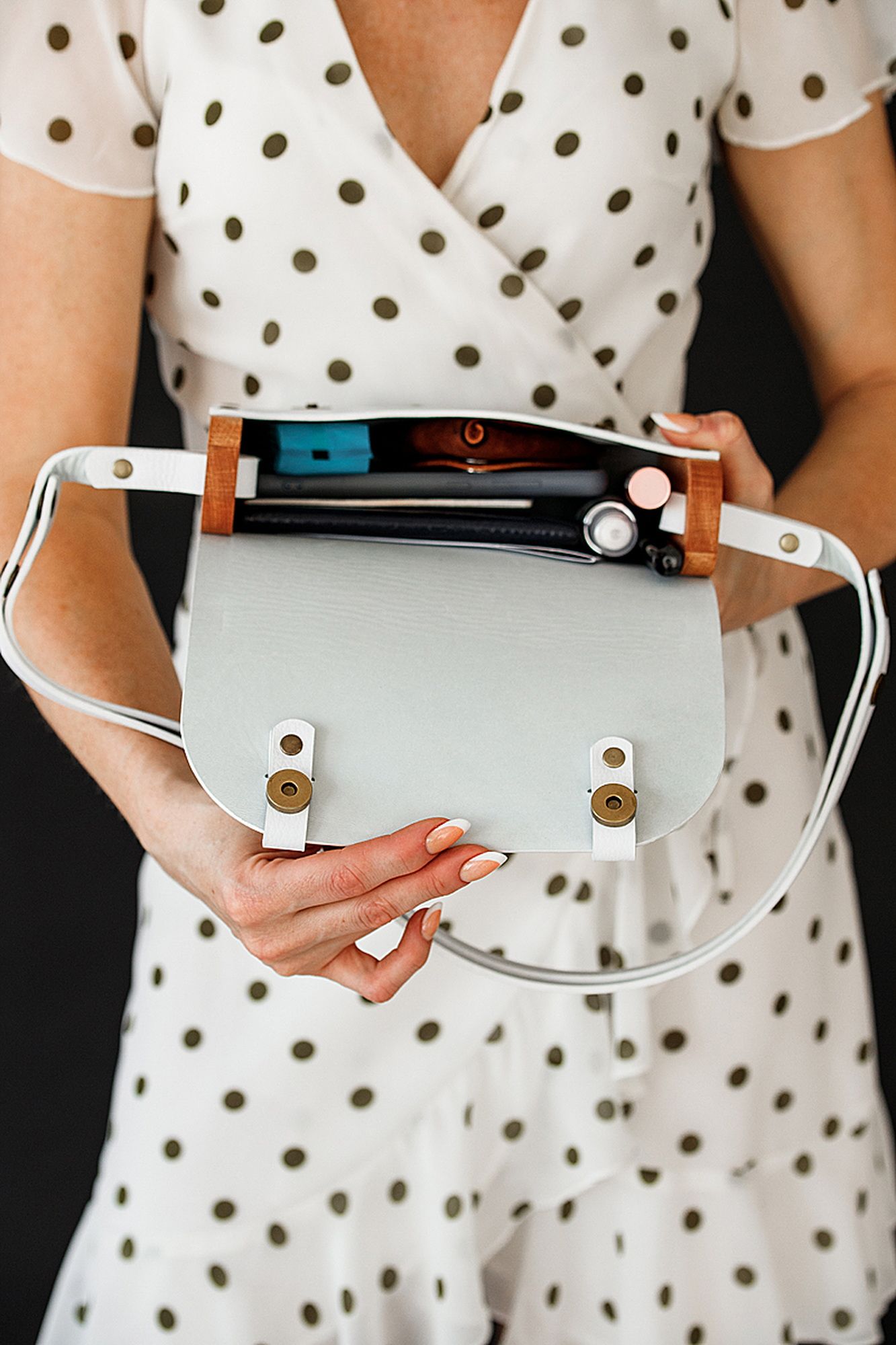 Сумка AELITA WHITE изготовлена вручную из плотной натуральной кожи белого цвета и элементов массива бука. Размер 22*15*6 см. Простые формы и минимум декора. Деревянные вставки из массива бука. Качественная и плотная ременная кожа коричневого цвета , хорошо держит форму изделия. Ручка регулируется от длинной 105 см до короткой 65 см за счет перестегивания кнопок. Закрывается сумка на магнитные кнопки цвета античной латуни, что в совокупности с натуральными материалами придает ему оригинальный внешний вид и подчеркивает неординарный вкус обладателя данного аксессуара. Кожа и дерево надежно закреплены с помощью металлических заклепок. Этот аксессуар будет весьма уместно вручить в качестве оригинального подарка себе любимой или на любое торжество Размер 22*15*6