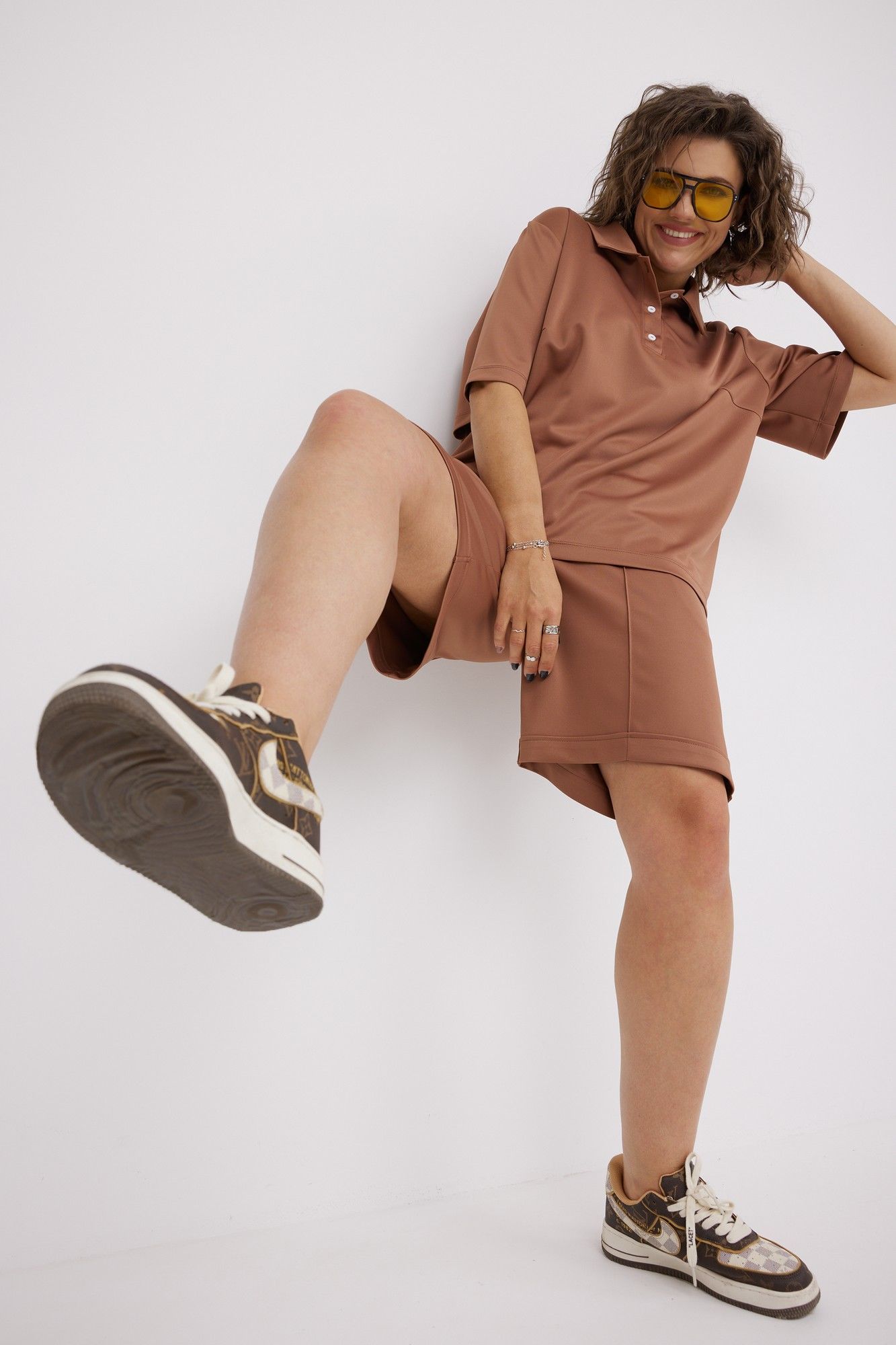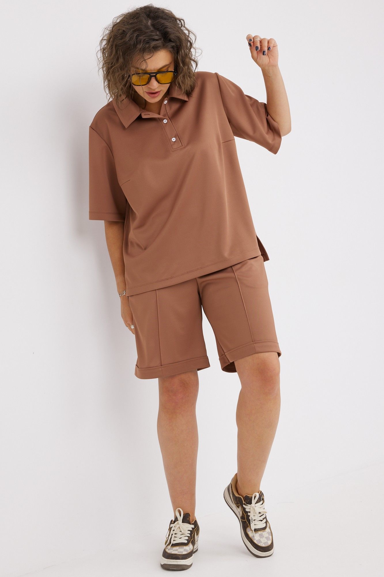 Яркий стильный женский комплект свободного кроя, состоящий из блузы - поло и шорт, выполнен из трикотажной, мягкой, растяжимой ткани с эффектом перелива. Отличный вариант для насыщенного впечатлениями лета. Потрясающе удобный и трендовый костюмчик с укороченными шортами, который должен быть в гардеробе любой модницы! Блуза - поло свободного кроя с отложным воротником на планке визуально удлиняет линию шеи. Рукав втачной с подгибкой по линии низа. На спинке в районе плеча расположены вытачки. В боковых швах - разрезы, обработанные подгибкой. Спинка длиннее переда. Шорты свободного прилегания, дополнены карманами «Хулиганами». По передней части застрочены стрелки. Верх шорт обработан широким поясом с островком с эластичной резинкой. Нижний край шорт обработан подгибкой с закрытым швом по лицевой части изделия. Комплект идеально подходит на каждый день, для занятий спортом, прогулок и отдыха. Для того, чтобы правильно подобрать свой размер, необходимо ваш замер объёма груди разделить на 2. (например, объём груди 104:2=52 размер). Замеры в готовом изделии: Блуза: Длина по спинке от плеча: 69см Длина рукава от проймы: 41см Обхват груди: 118см/48р; 122см/50р; 126см/52р; 130см/54р; 134см/56р; 138см/58р; 142см/60р; 146см/62р Шорты: Длина с поясом: 50см Обхват бёдер: 118см/48р; 122см/50р; 126см/52р; 130см/54р; 134см/56р; 138см/58р; 142см/60р; 146см/62р Рост фотомодели 174 см, размер одежды на фото 52. Допуск расхождения в замерах +-2 см.