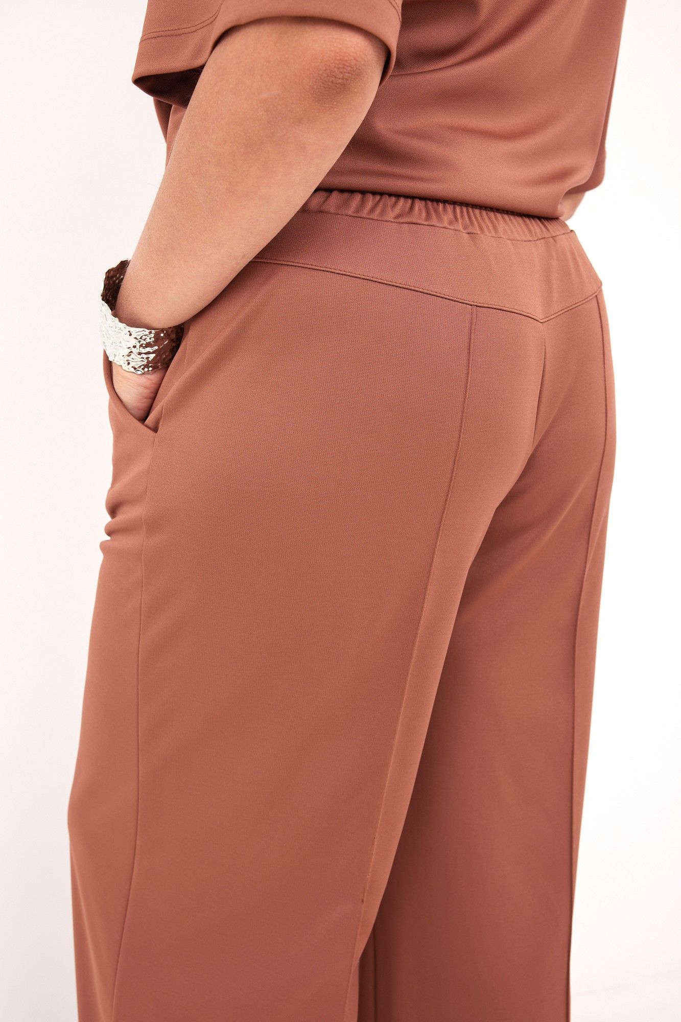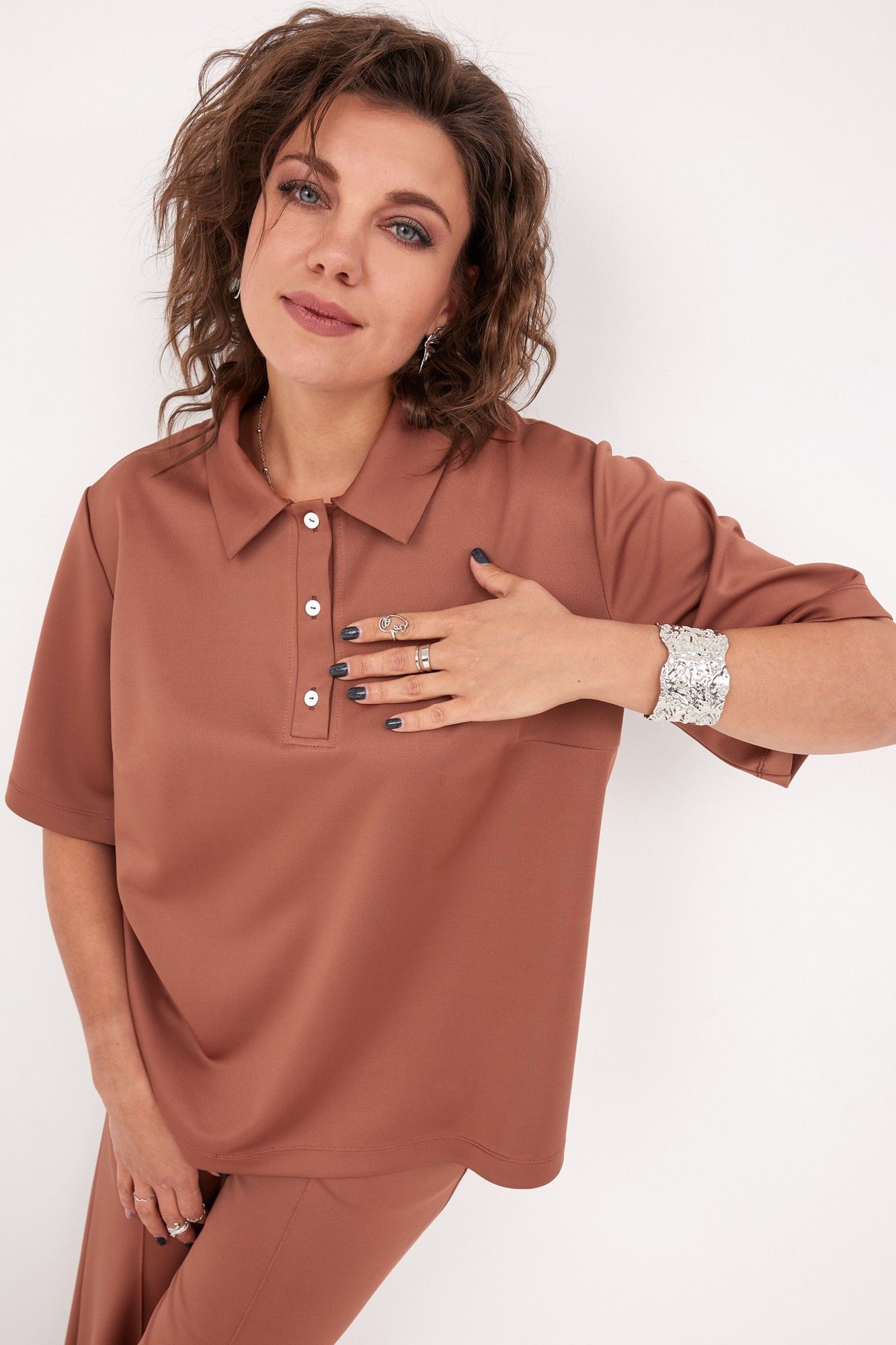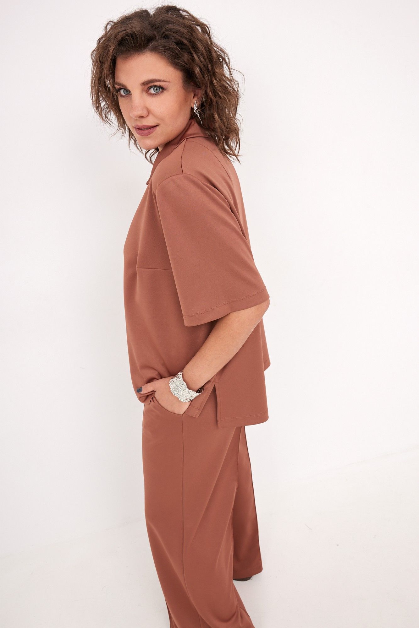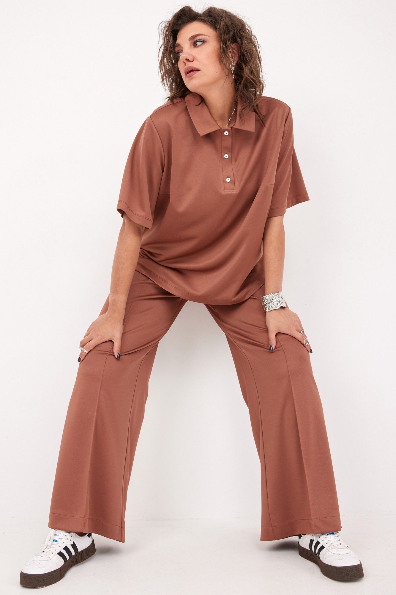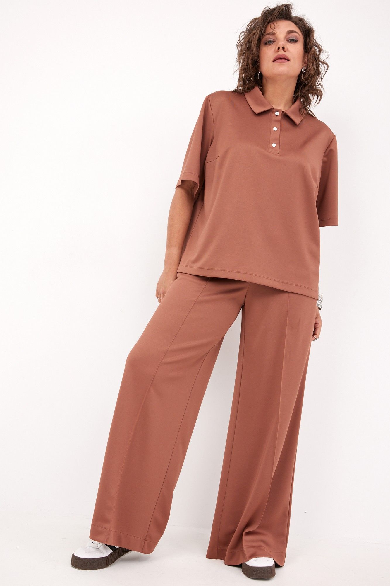 Неповторимый монохромный комплект в стиле спорт-шик выполнен из трикотажной, мягкой, растяжимой ткани с эффектом перелива. Модель выглядит современно и неизбито, она невероятно стройнит силуэт, удлиняет ножки благодаря застроченным стрелкам, создающим вертикаль. Надев комплект, Вы непременно не останетесь без внимания! Блуза- поло свободного кроя с отложным воротником на планке. Визуально удлиняет линию шеи. Рукав втачной с подгибкой по линии низа. На спинке в районе плеча расположены вытачки. В боковых швах - разрезы, обработанные подгибкой. Спинка длиннее переда. Брюки свободного кроя, с застроченными стрелками. Отрезная кокетка на задней части брюк делает их посадку идеальной. Пояс с островком, сзади на кокетке для идеальной посадки. Для Вашего удобства- карманы хулиганы. Низ брюк обработан подгибкой. Дополните комплект любимой парой обуви, минималистичными украшениями, сумочкой, и образ готов! Для того, чтобы правильно подобрать свой размер, необходимо ваш замер объёма груди разделить на 2. (например, объём груди 104:2=52 размер). Замеры в готовом изделии: Блуза: Длина по спинке от плеча: 69см Длина рукава от горловины: 41 см Обхват груди: 114см/46р; 118см/48р; 122см/50р; 126см/52р; 130см/54р; 134см/56р; 138см/58р; 142см/60р; 146см/62р Брюки: Длина с поясом: 108см Обхват бёдер: 108см/46р; 112см/48р; 116см/50р; 120см/52р; 124см/54р; 128см/56р; 132см/58р; 136см/60р; 140см/62р. Рост фотомодели 174 см, размер одежды на фото 52. Допуск расхождения в замерах +-2 см