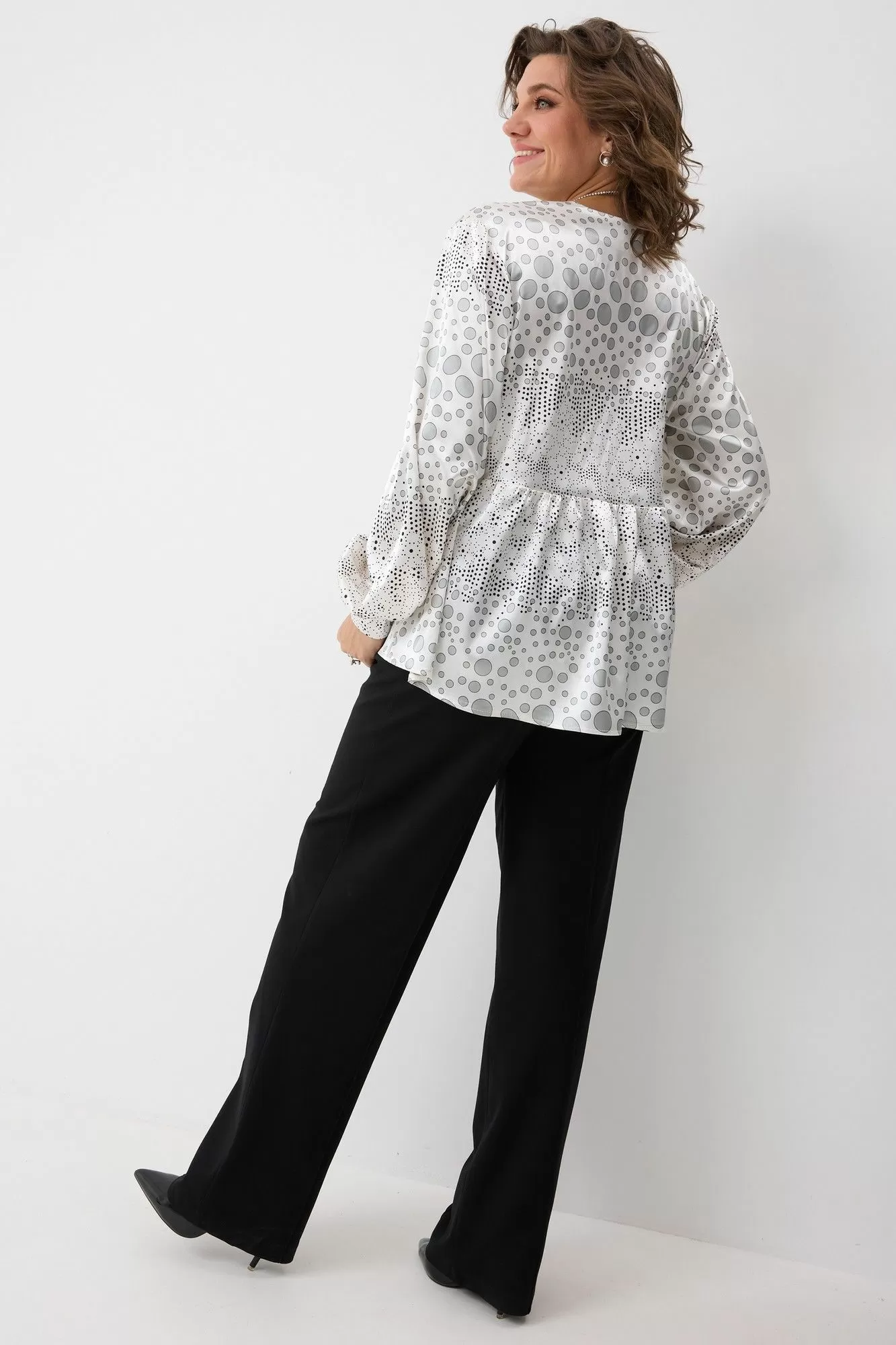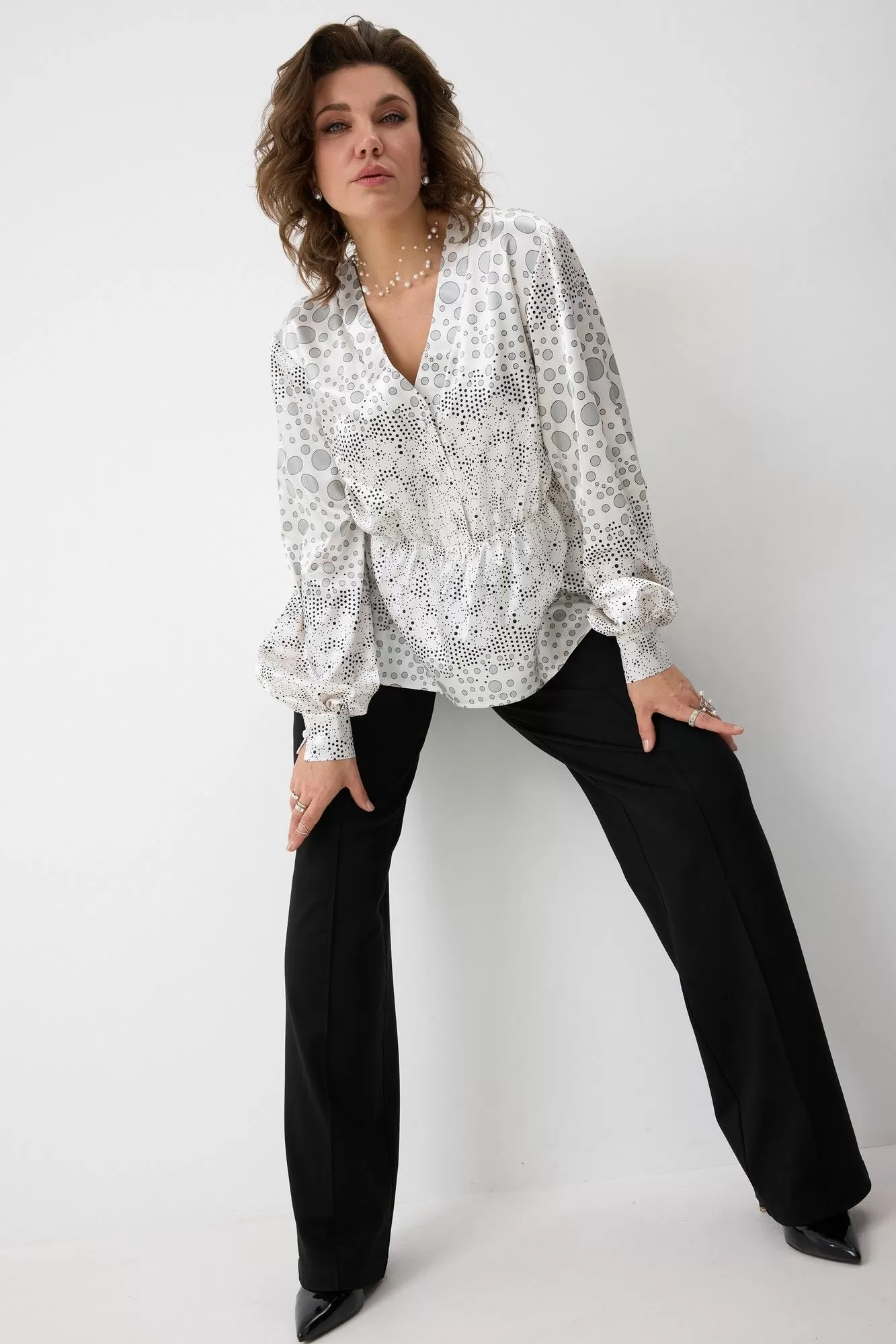 Блуза свободного кроя. Передняя часть на притачной планке, имеющей застёжку на петли-пуговицы. V-образный вырез формирует красивое декольте.