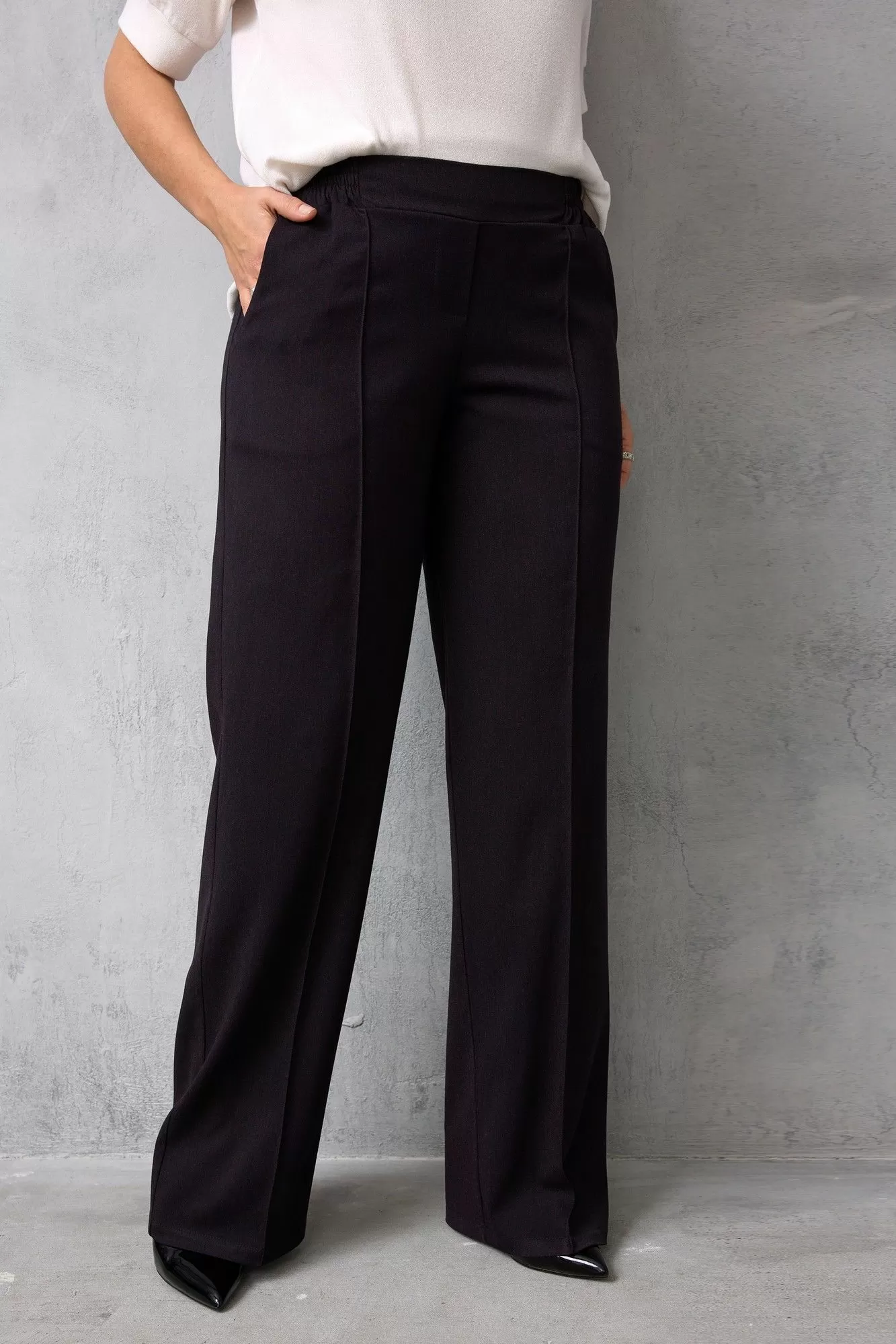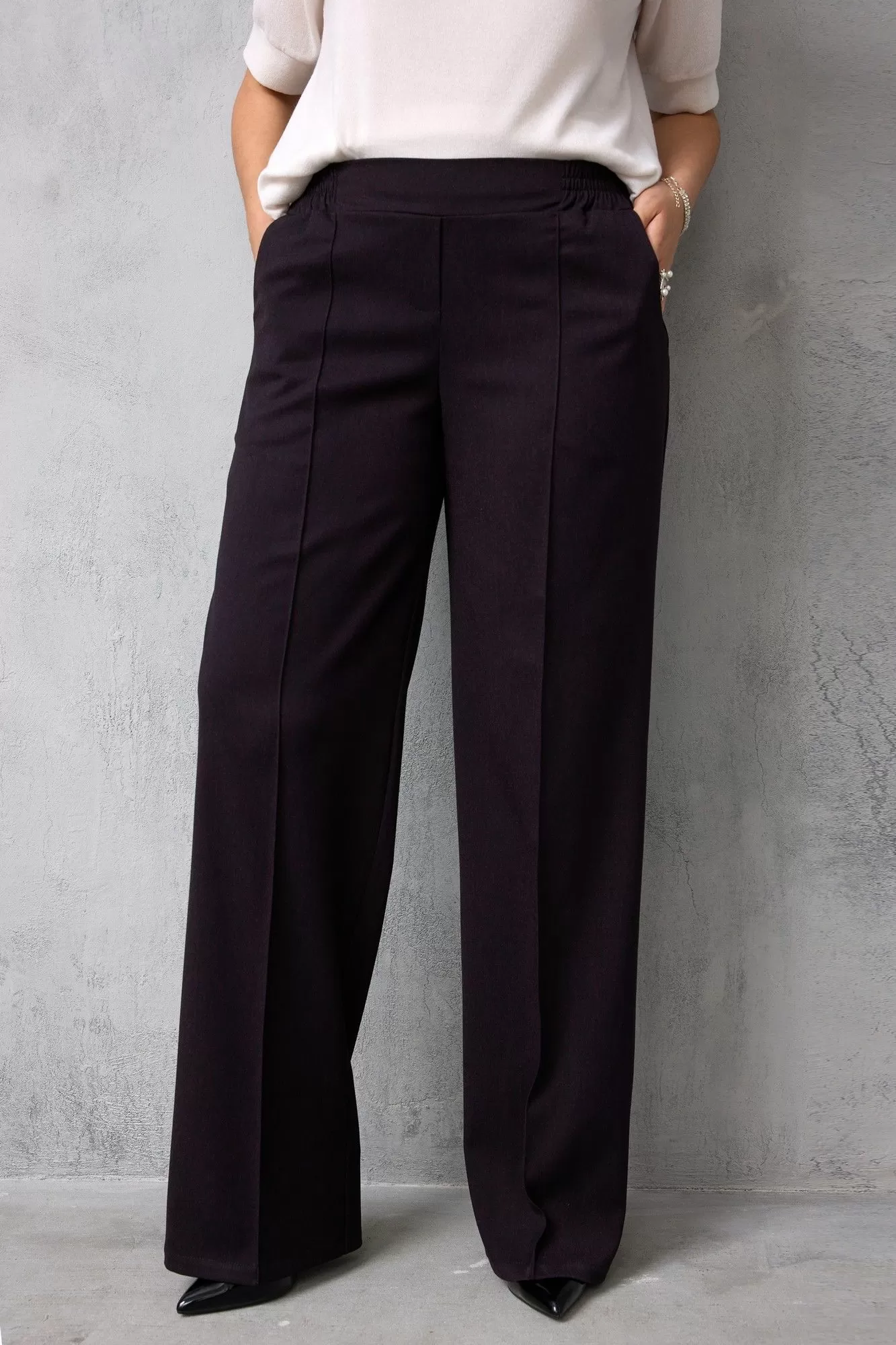 Если Вы хотите приобрести шикарные, базовые брюки, которые позволят создавать множество сочетаний, предлагаем Вашему вниманию модель, выполненную из приятного к телу слегка растяжимого текстиля, который подарит невероятный комфорт в носке. Благородный оттенок «чёрный баклажан» смотрится изысканно и дорого. Брюки прямого кроя с застроченными стрелками сделают Ваши ножки бесконечно длинными! Модель изумительно стройнит и вытягивает силуэт благодаря выверенным лекалам и отличной посадке. Пояс модели выполнен на резинке с островком. По бокам брюк - карманы хулиганы.