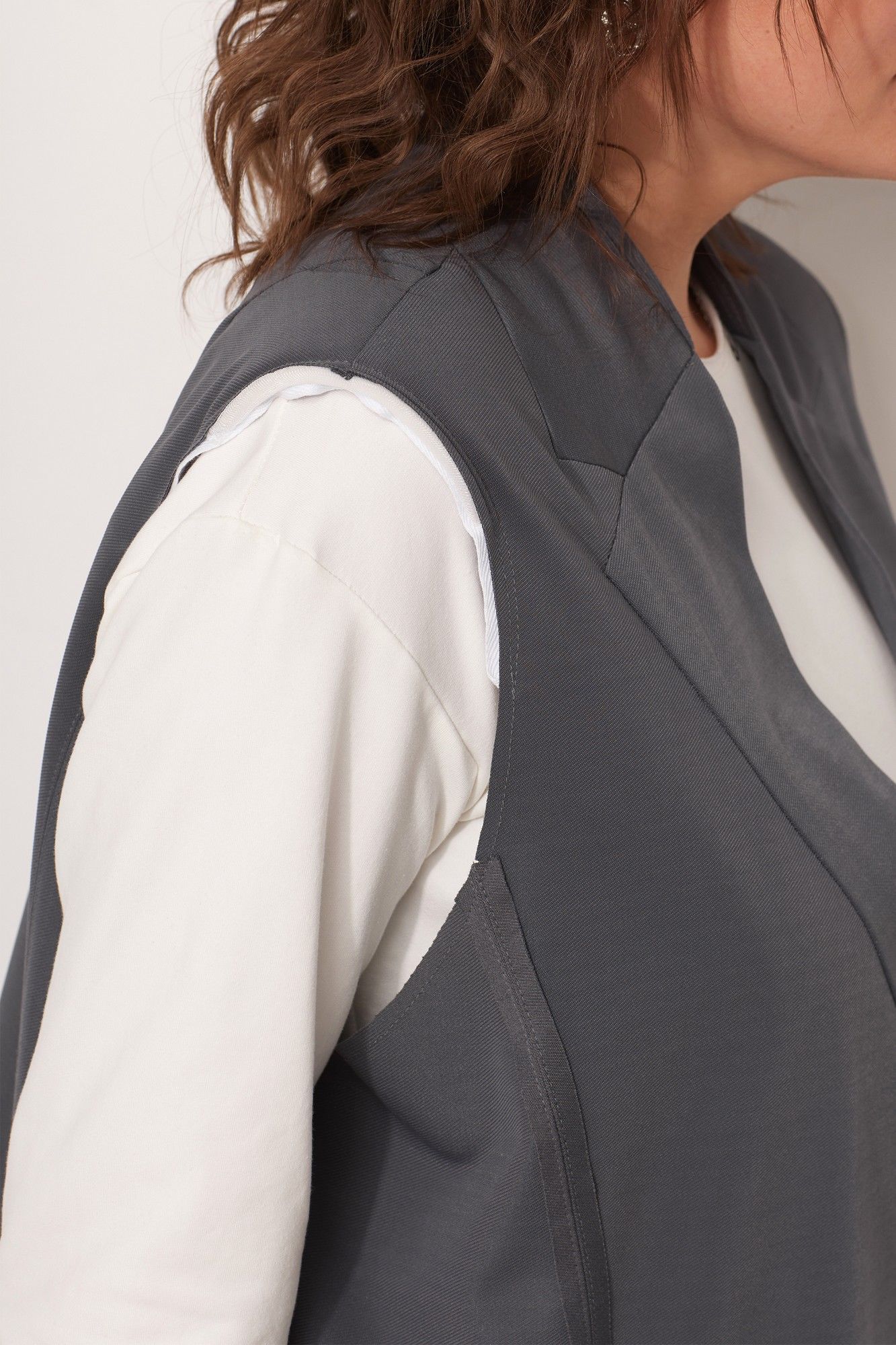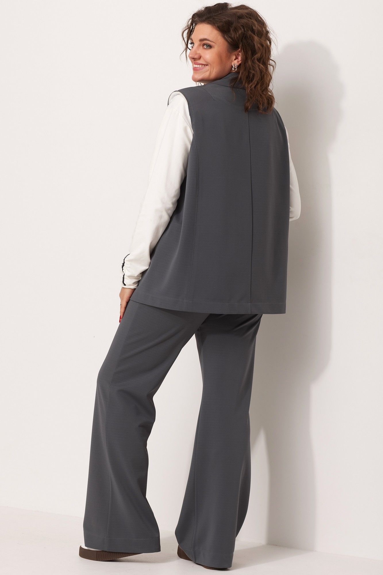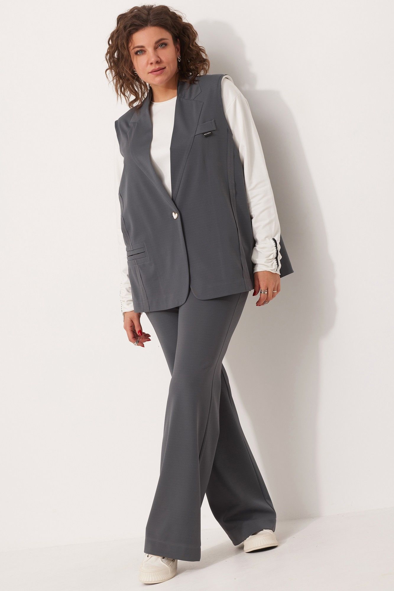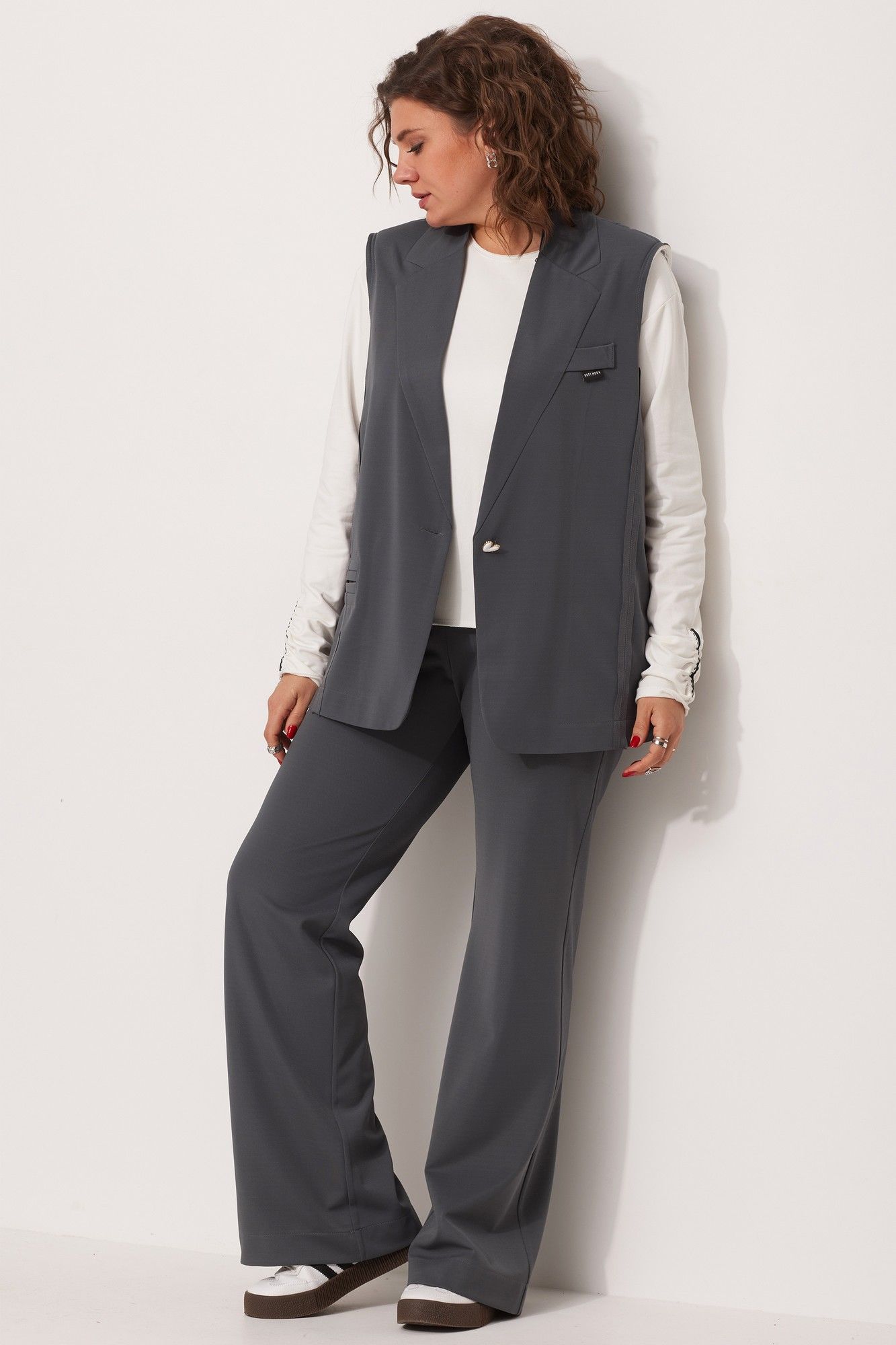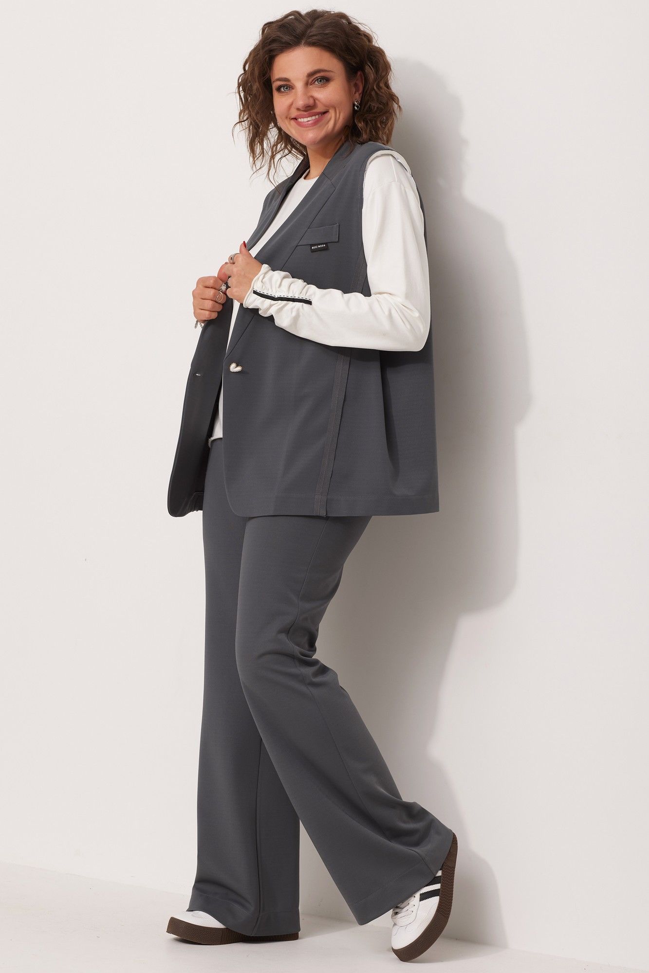 Вы задумывались над приобретением жилета, при этом строгие классические модели нагоняют на Вас тоску, предлагаем Вам уникальную современную свободную модель, которая не оставит Вас равнодушной! Жилет выполнен из струящегося текстиля со стрейчем, средней плотности с саржевым плетением. Для создания современного образа использованы открытые срезы. Жилет с имитацией отложного воротника с лацканом, с плечевыми накладками обработанными по краю киперной тесьмой с открытым срезом. Стачные швы рельефа выполнены на лицевую сторону. По линии переда-листочка - обманка с вшивным логотипом бренда и имитация кармана в рамку. Для создания комплекта, к жилету предлагаем подобрать брюки на Ваш вкус, арт. 6057, арт. 6059. Для того, чтобы правильно подобрать свой размер, необходимо ваш замер объёма груди разделить на 2. (например, объём груди 104:2=52 размер). Замеры в готовом изделии: Длина по центру спинки: 73см. Обхват груди: 132см/48р-54р; 148см/56р-62р. Рост фотомодели 174 см, размер одежды на фото 52. Допуск расхождения в замерах +-2 см.