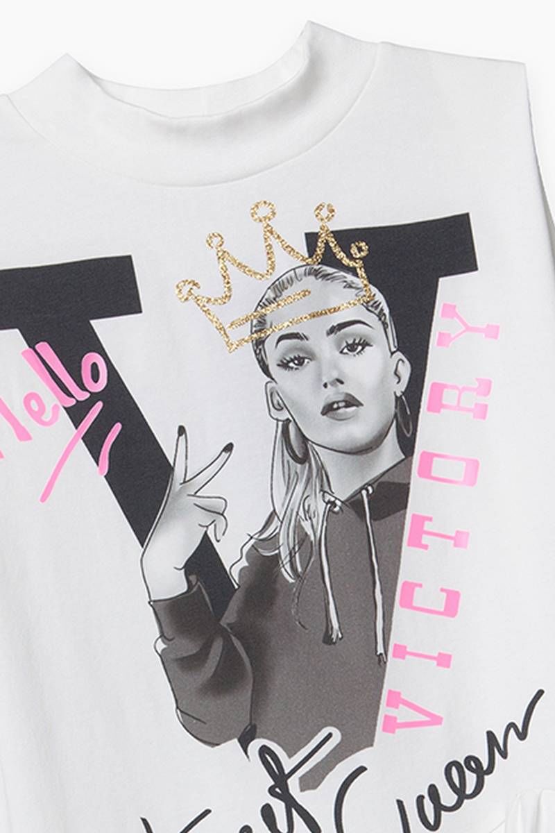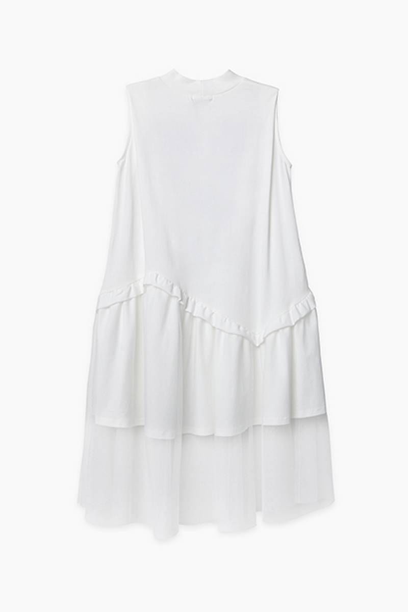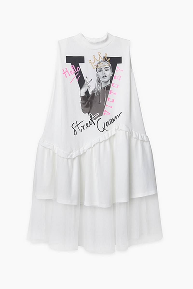 Платье-трапеция без рукавов, с воротником-стойкой, выполнено из молочно-белой кулирной глади с дополнительным слоем из сетки в тон. По низу - широкий асимметричный волан с рюшей. Декорировано текстово-графическим принтом