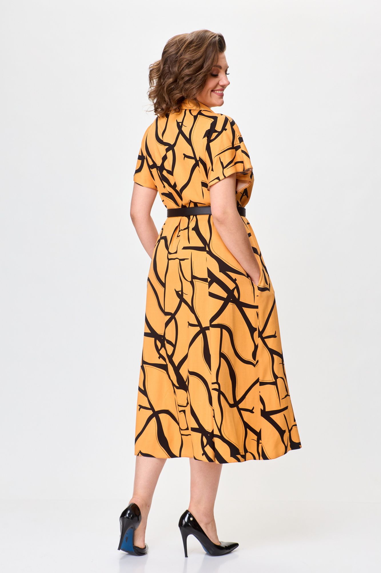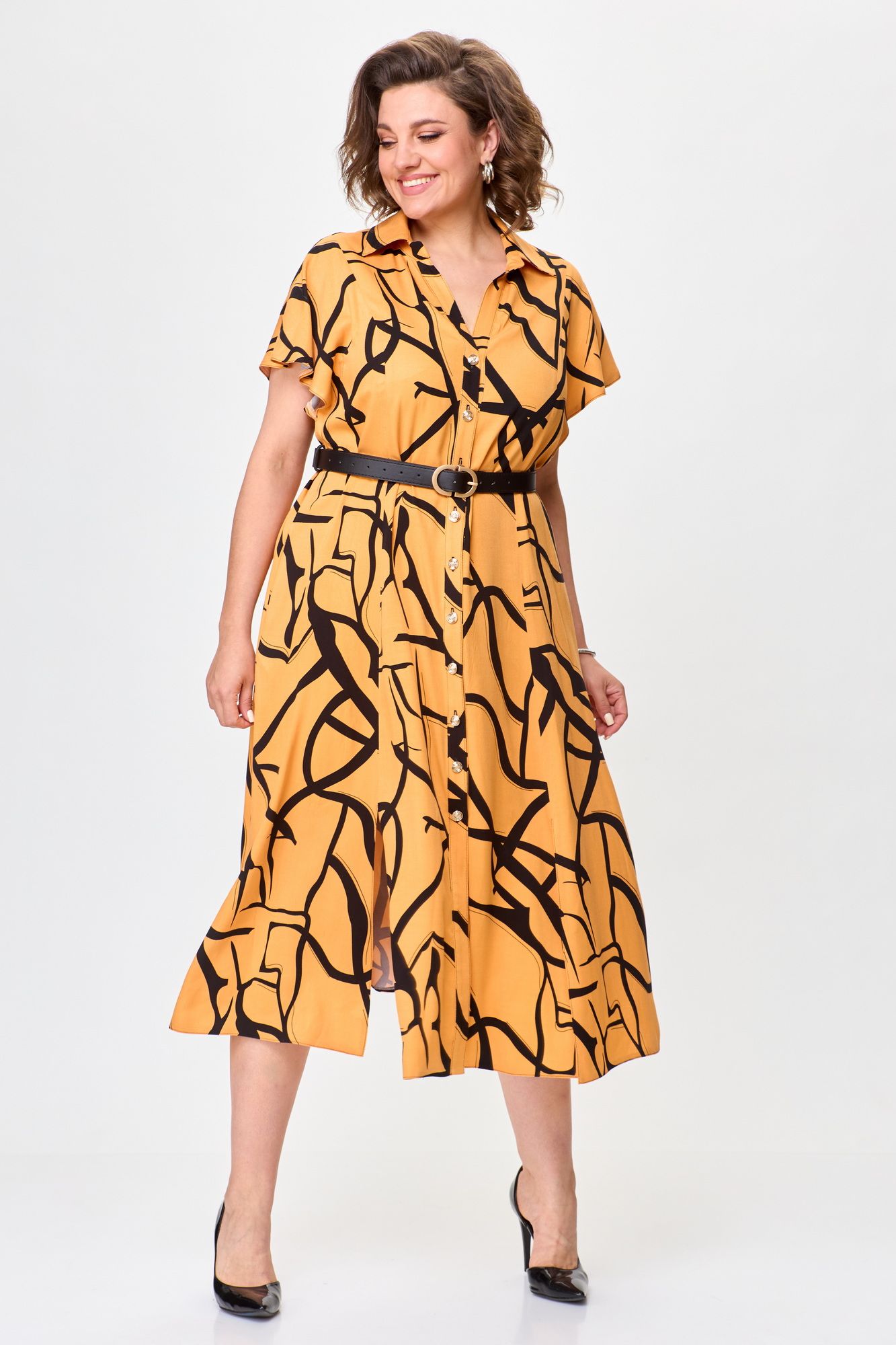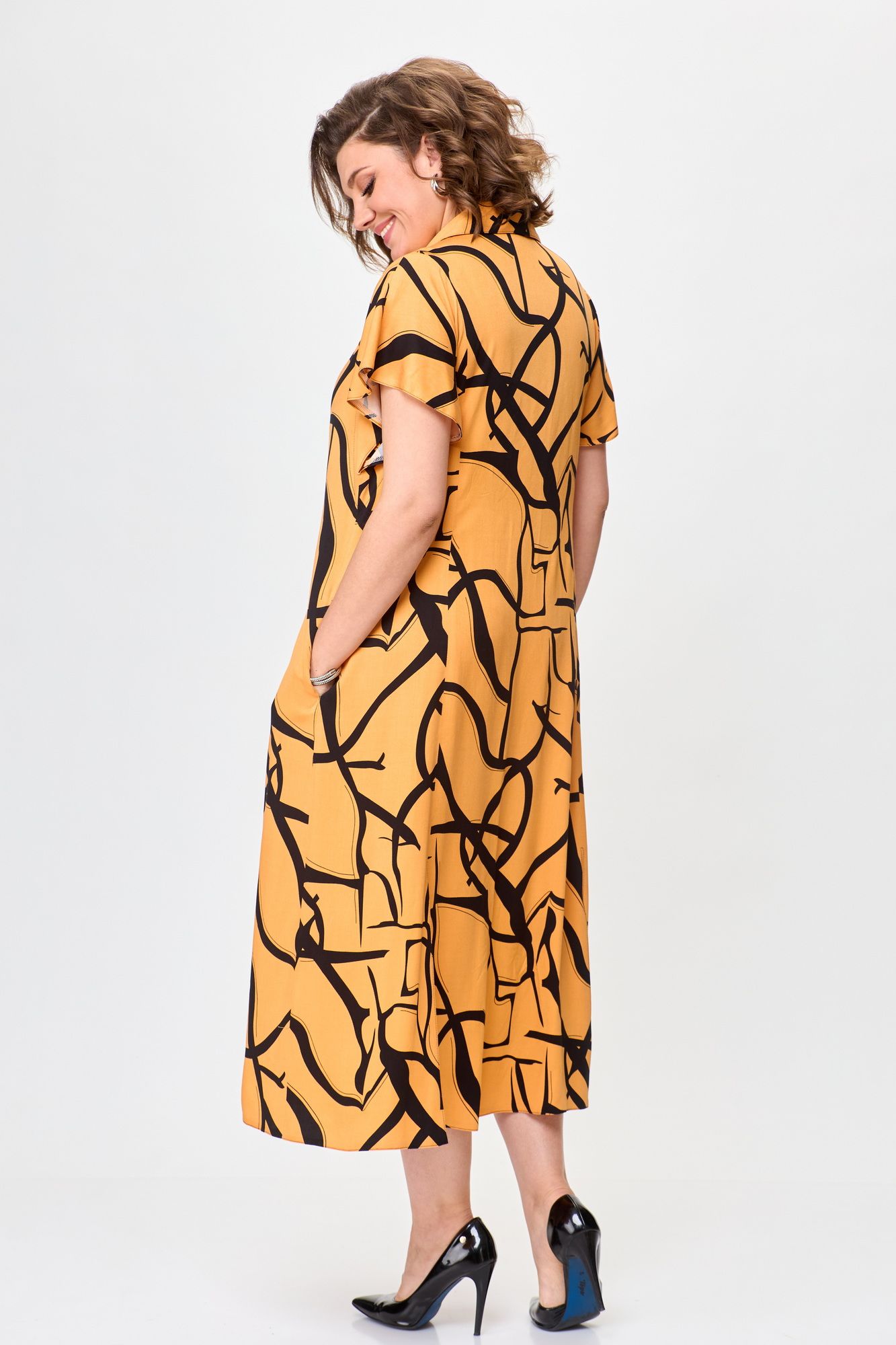 Летнее платье выполнено из легкого штапеля с принтом. Платье не отрезное по линии талии с центральной застежкой на петли-пуговицы, по переду и спинке рельефы по низу с разрезами. Платье с цельновыкроенными рукавами «крылышко». В комплект входит плетеный ремень с декоративной планкой. Длина платья – 121 см Длина рукава от горловины – 28 см