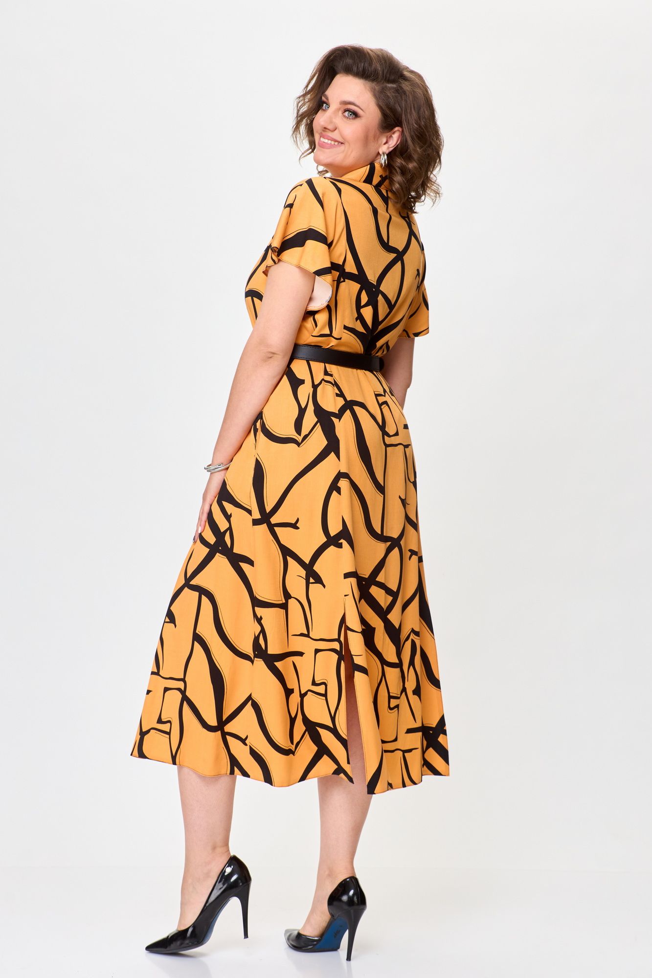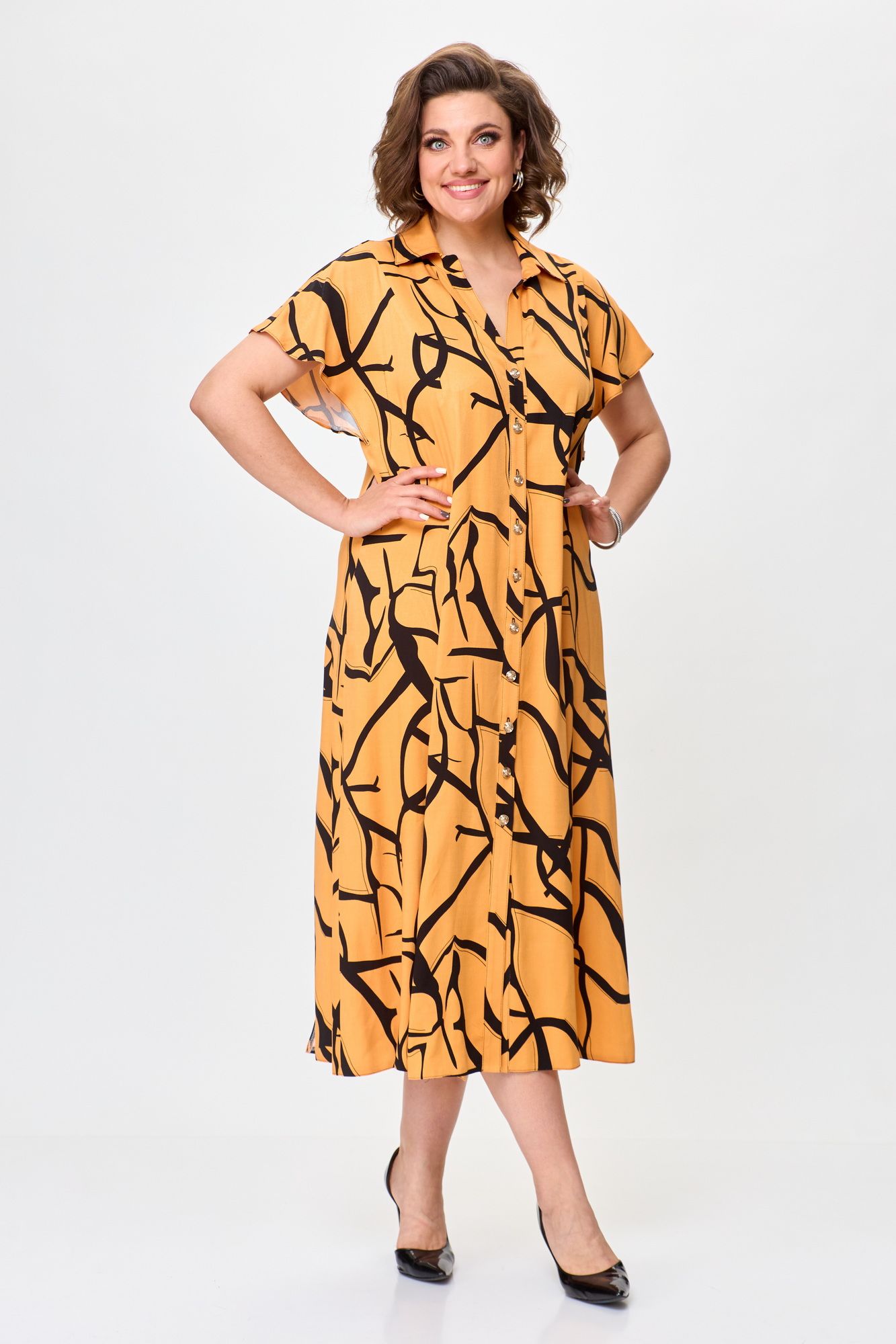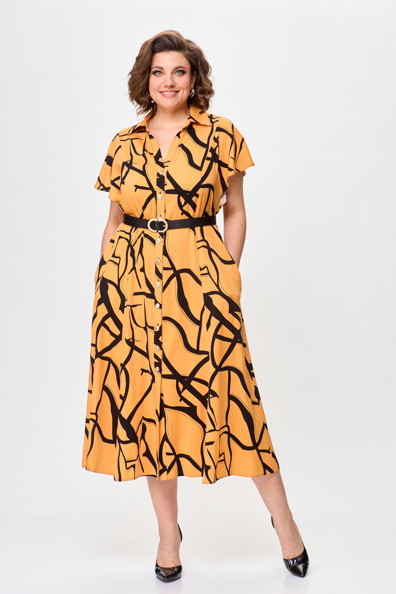 Летнее платье выполнено из легкого штапеля с принтом. Платье не отрезное по линии талии с центральной застежкой на петли-пуговицы, по переду и спинке рельефы по низу с разрезами. Платье с цельновыкроенными рукавами «крылышко». В комплект входит плетеный ремень с декоративной планкой. Длина платья – 121 см Длина рукава от горловины – 28 см