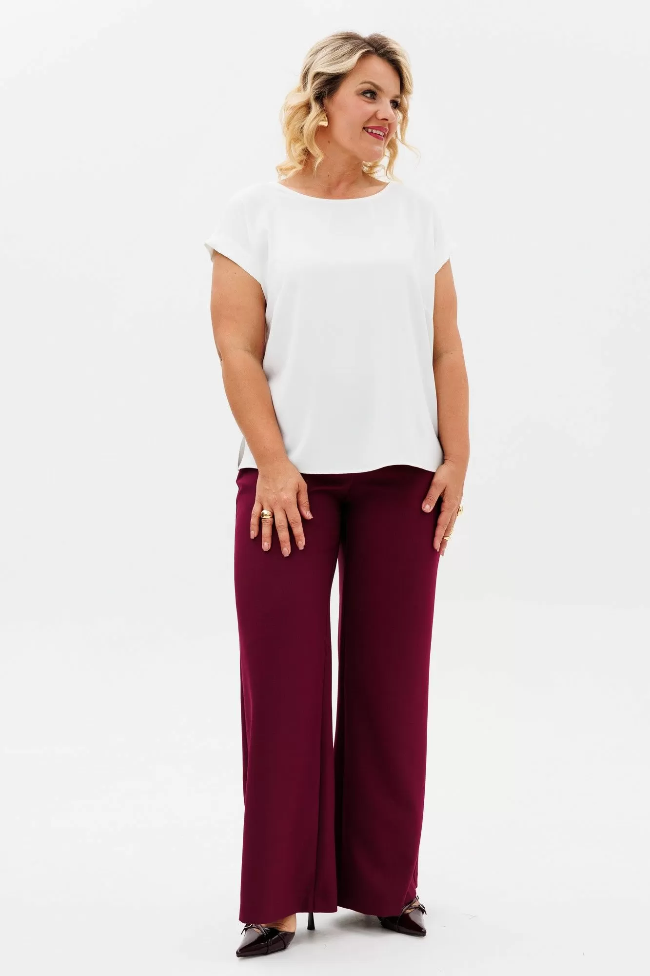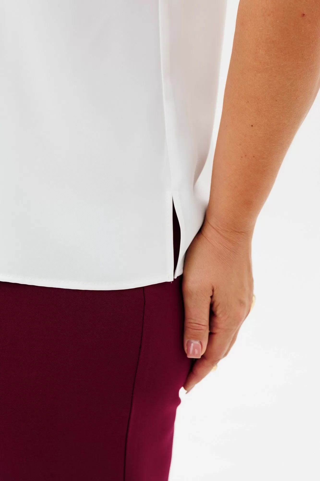 Базовая блузка из струящейся ткани. Блузка лаконичная с цельнокроеным коротким рукавом и с круглым вырезом горловины. В боковых швах разрезы. Изделие хорошо сочетается с брюками, юбками и джинсами, жакетами, а оптимальная длина блузки визуально уравновешивает фигуру. Отличный вариант под все базовые вещи в офис.