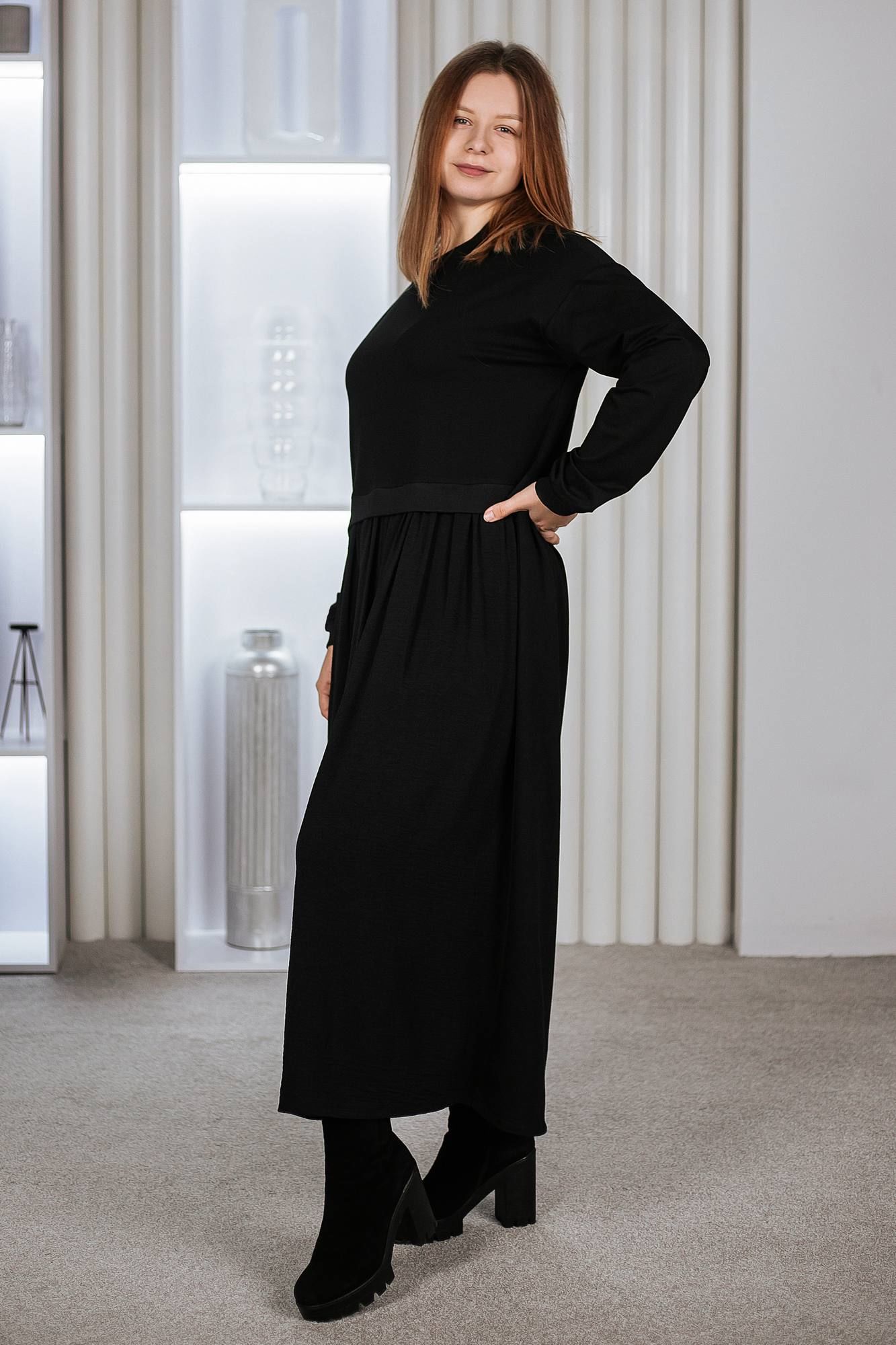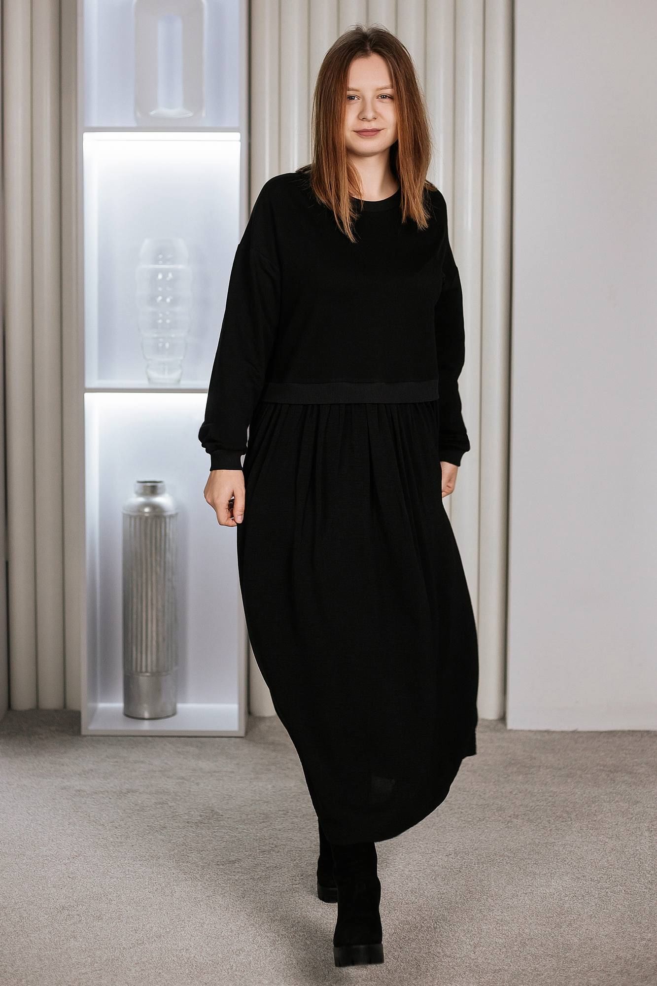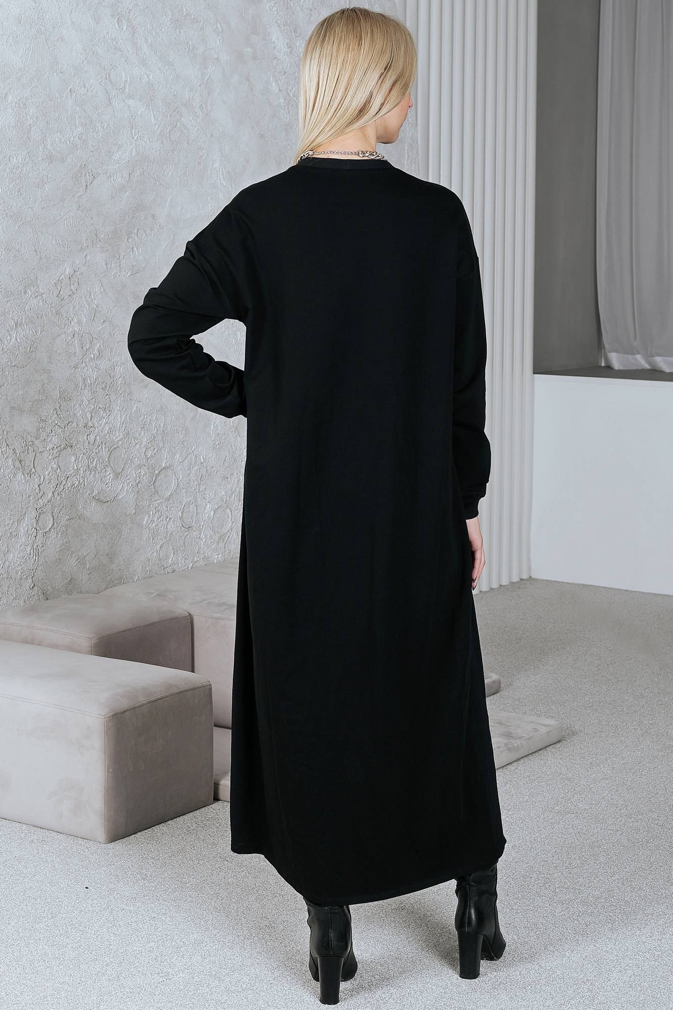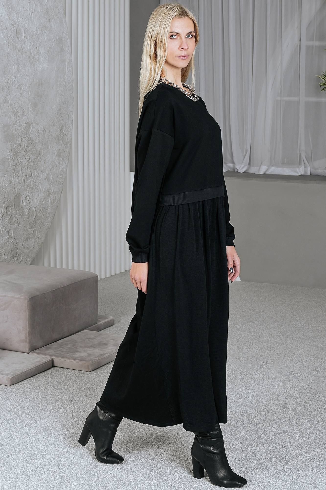Женское платье прилегающего силуэта, идет в размер. Изготовлено из плотной эластичной ткани. Горловина округлой формы. Рукава длинные втачные, в нижней части одного рукава расположена стильная нашивка. Платье отрезное по линии талии, по боковым швам в области талии выполнены фигурные разрезы. По левому боковому шву выполнен асимметричный разрез. Платье представлено на девушке 44 размера, рост 173 см.