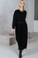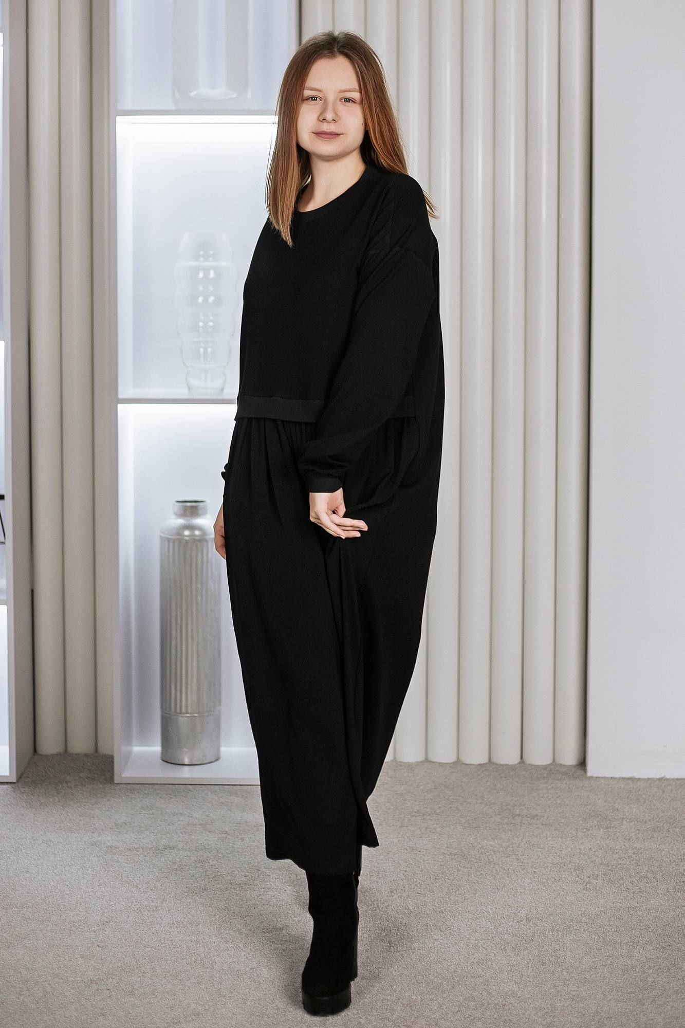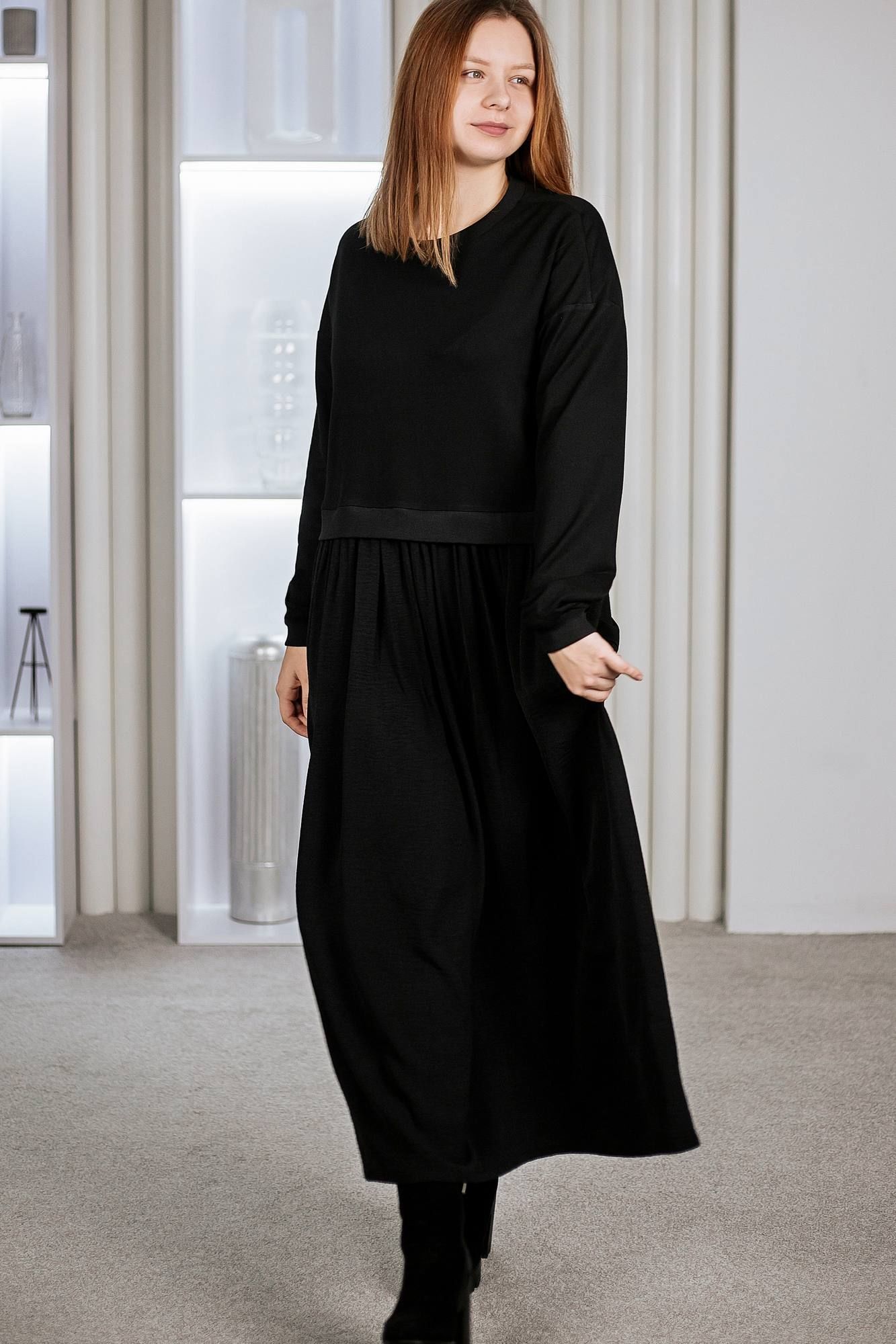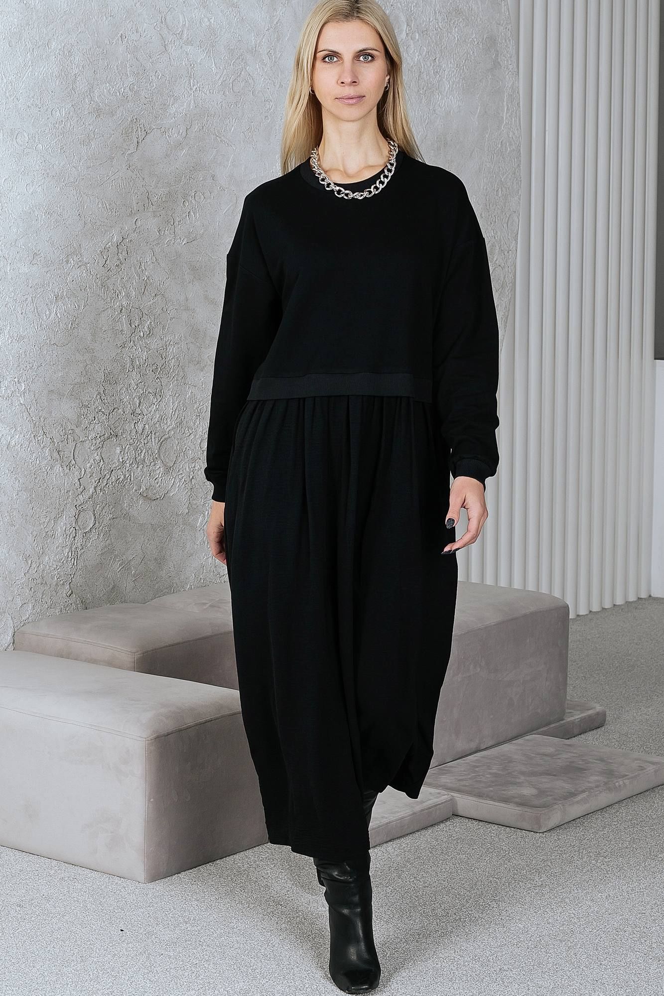 Женское платье прилегающего силуэта, идет в размер. Изготовлено из плотной эластичной ткани. Горловина округлой формы. Рукава длинные втачные, в нижней части одного рукава расположена стильная нашивка. Платье отрезное по линии талии, по боковым швам в области талии выполнены фигурные разрезы. По левому боковому шву выполнен асимметричный разрез. Платье представлено на девушке 44 размера, рост 173 см.