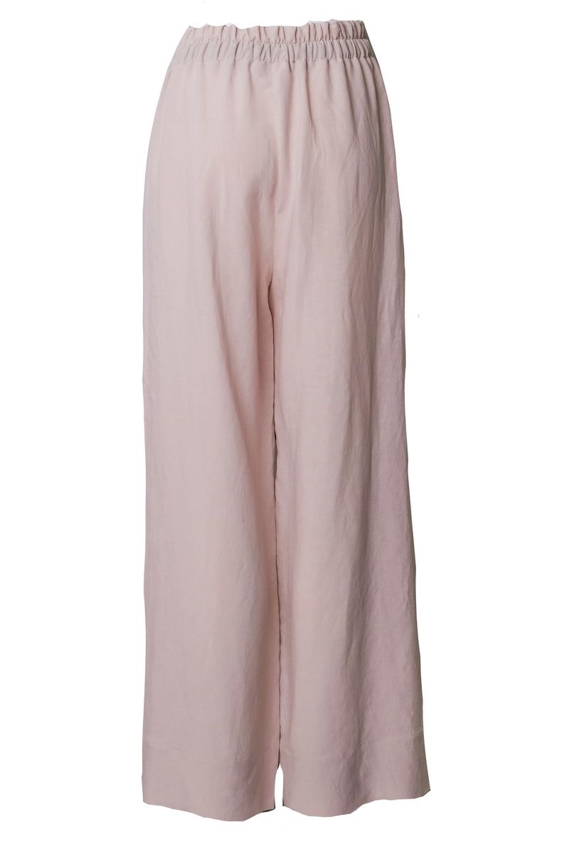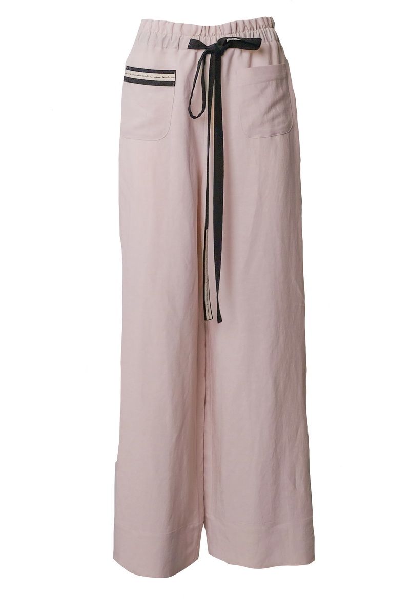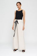 Брюки женские,длинные,расширенные книзу.Верх брюк обработан подкрайным поясом с резинкой и кулисой по поясу с завязывающимся бантом.По передней половинке брюк накладные карманы закругленной формы.Брюки без застежки.