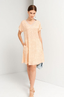 Платье женское,длиной выше линии колен,с V-образным вырезом горловины,короткими цельнокроеными рукавами,горизонтальным подрезом по переду и спинке на уровне линии талии и расширенной книзу юбкой от линии подреза.Горловина изделия обработана вязаной бейкой.По среднему шву переда декоративные пуговицы.