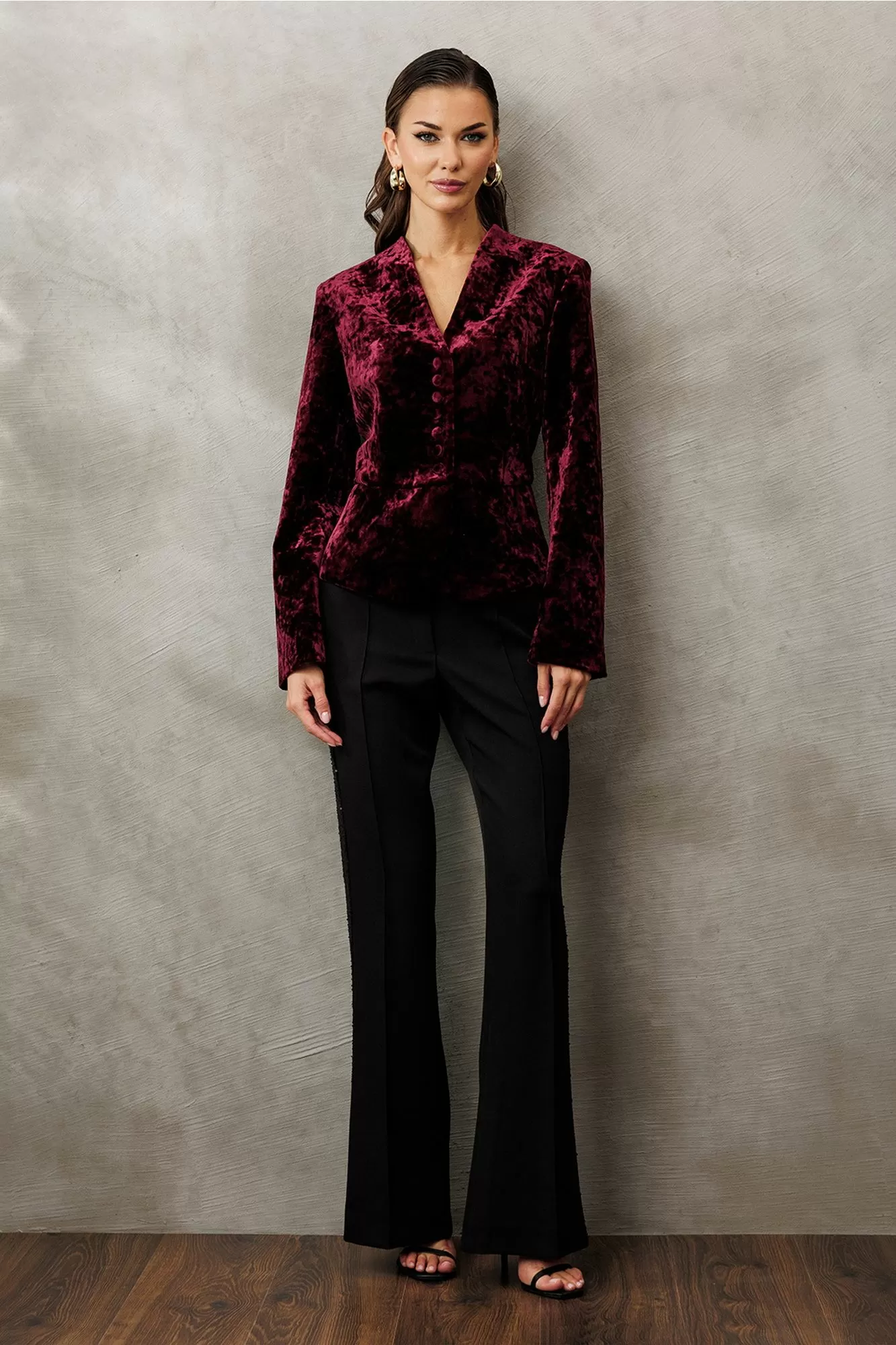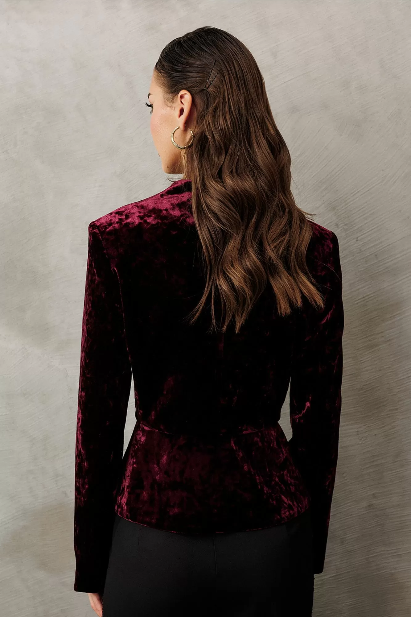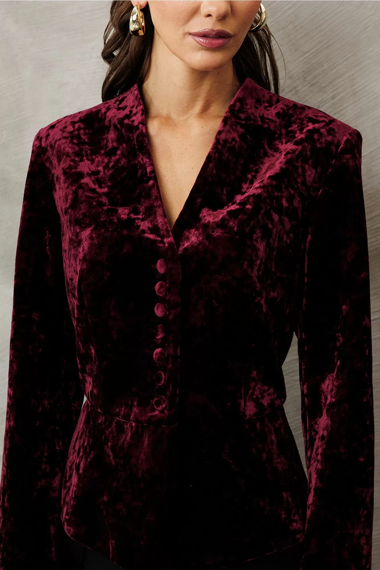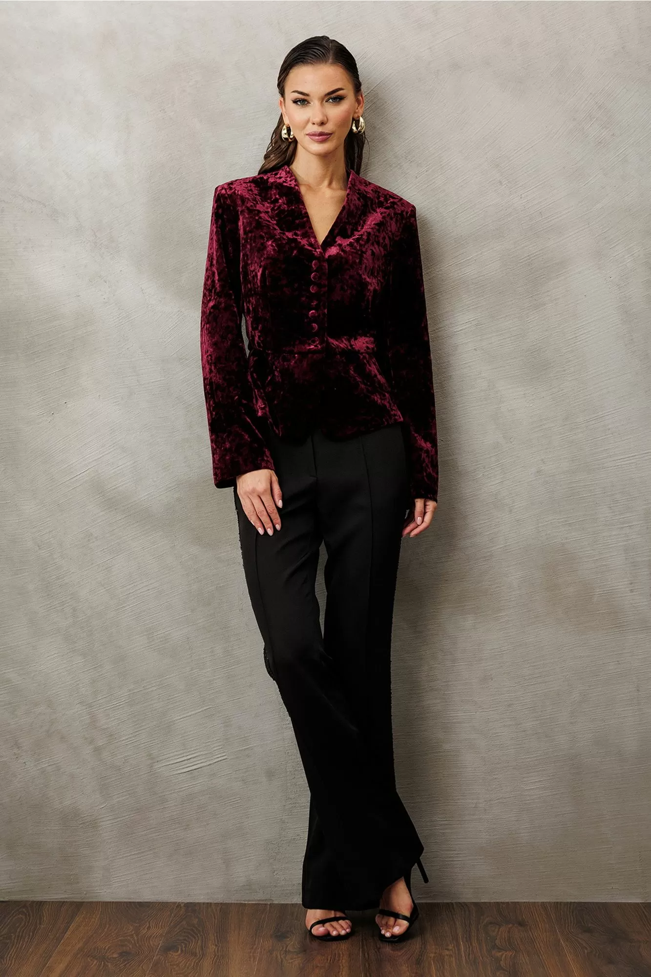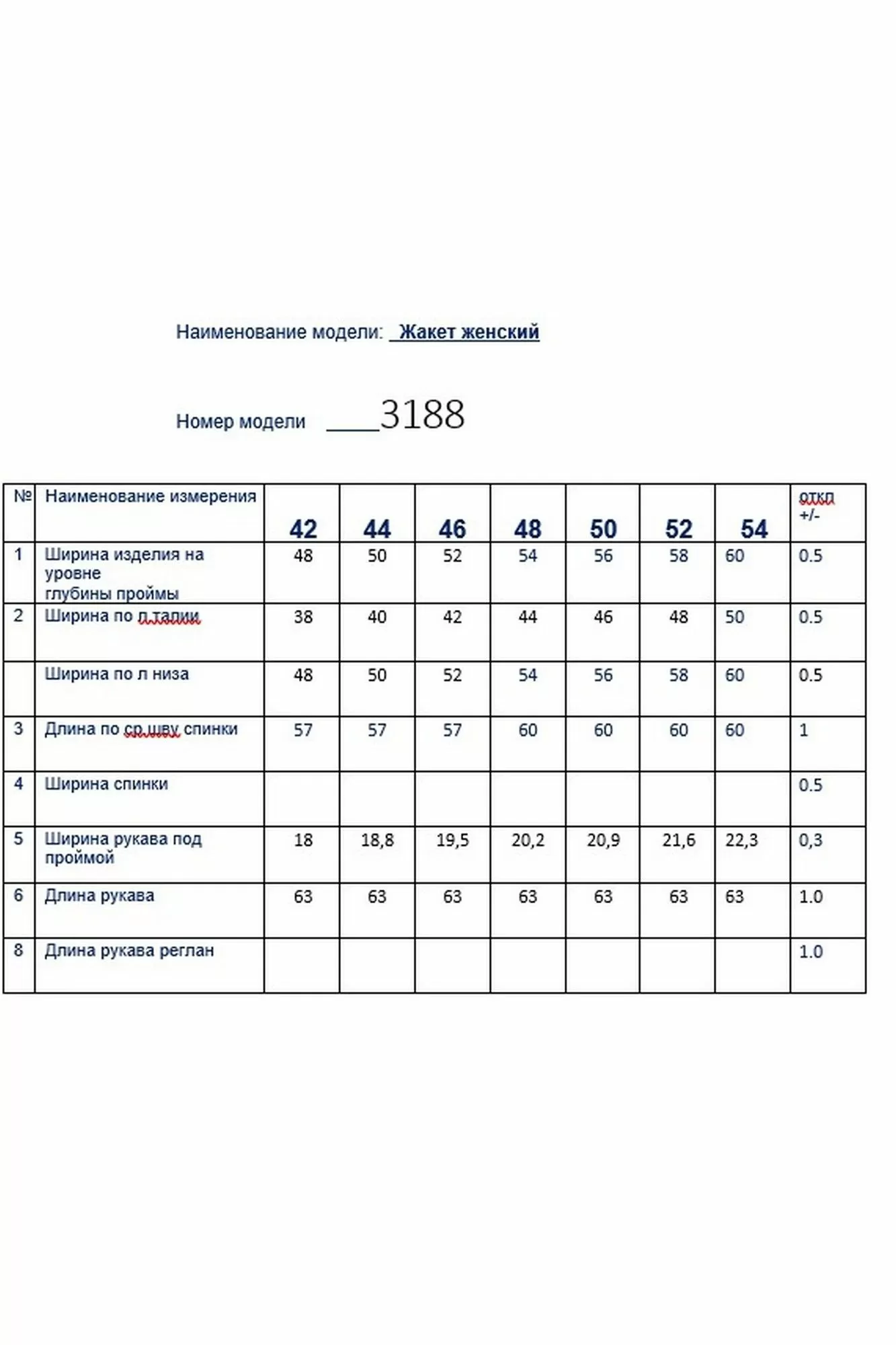 Жакет из велюровой ткани полуприлегающего силуэта, с втачным двухшовным рукавом. Полочка и спинка с отрезной баской по линии талии. Полочка с V-образным вырезом, однобортной застежкой на петли пуговицы и талиевой вытачкой от баски. Спинка с центральным швом. Жакет с отрезным бочком, переходящим на полочку и на спинку. Жакет на подкладке.