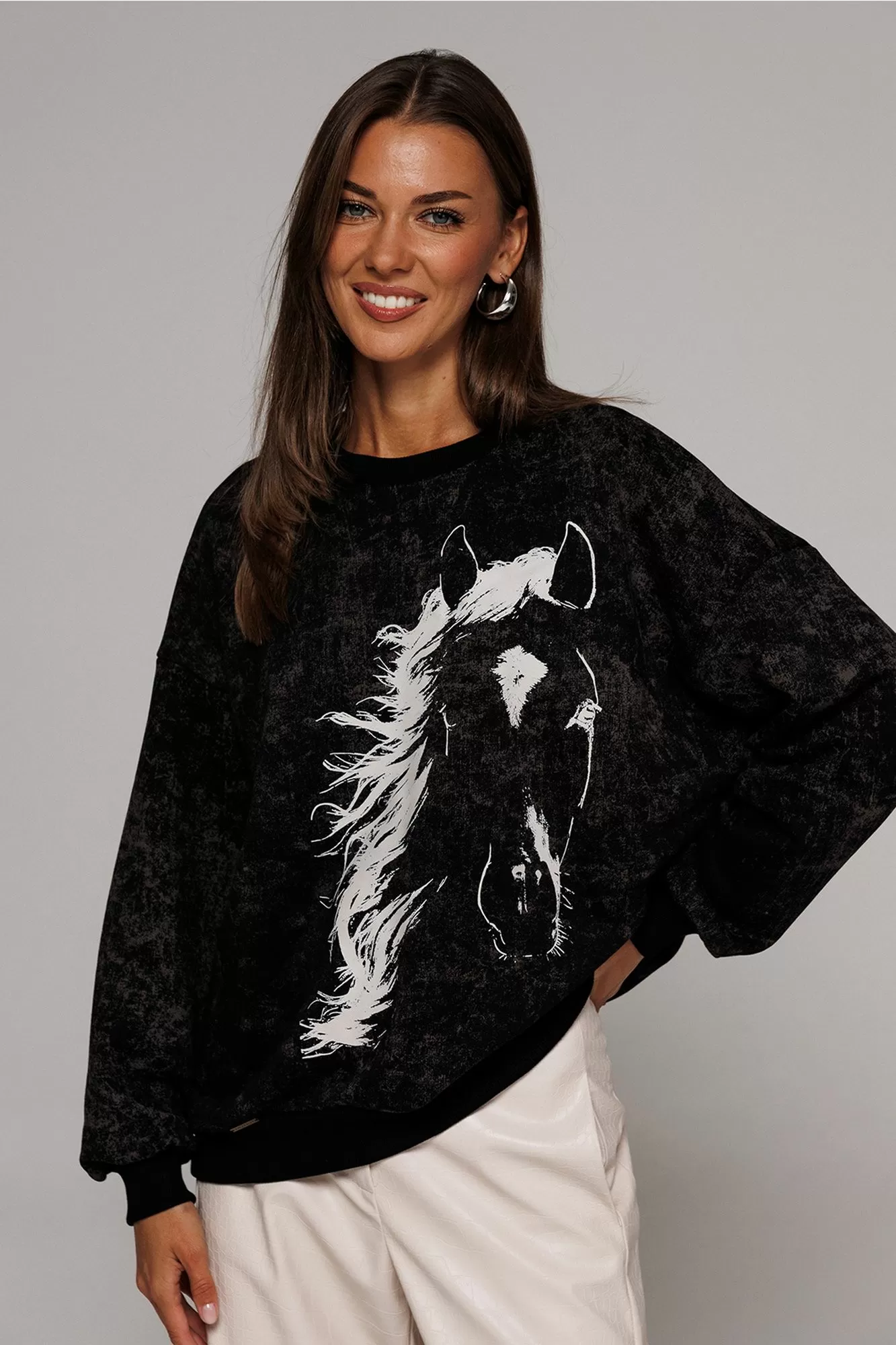 Джемпер из трикотажного полотна свободного силуэта, слегка заужен к низу, с втачным рукавом и спущенной линией плеча, с манжетой из отделочной ткани по низу рукава. По переду печать "HORSE" и нашивка с гравировкой "BUTER", низ фигурный. Спинка длиннее переда. По горловине и низу изделия притачная планка из довяза.