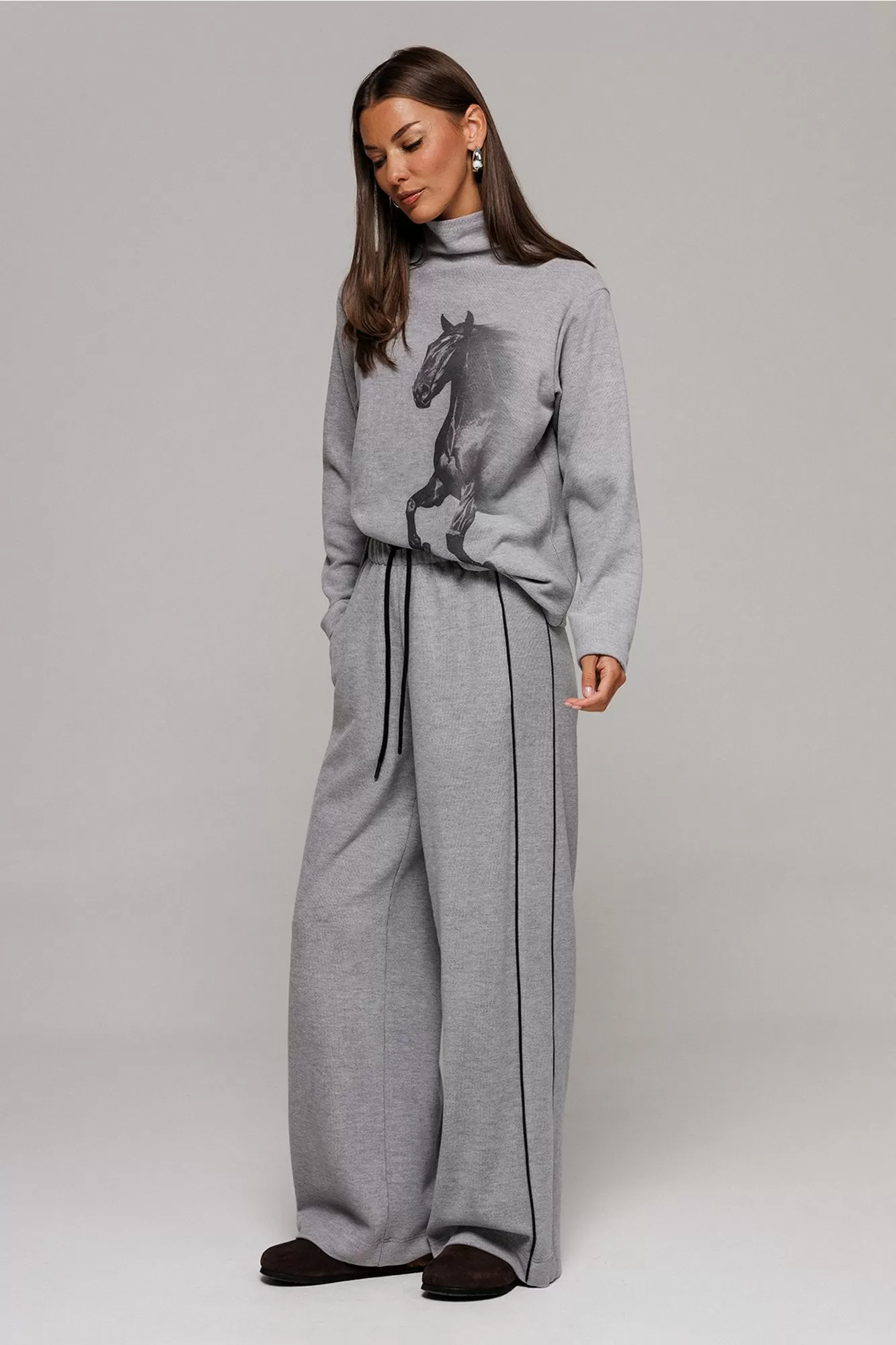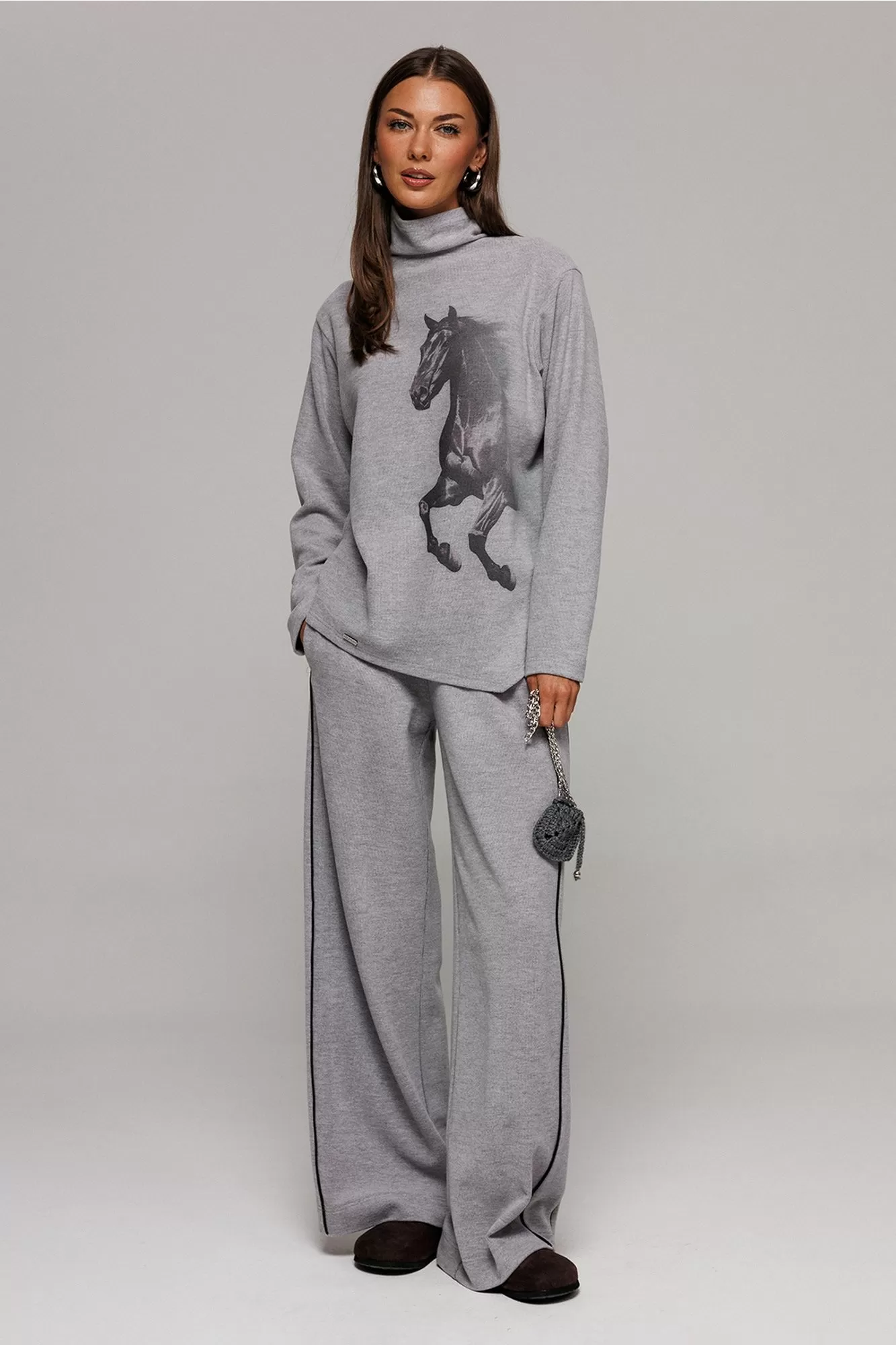 Джемпер из трикотажного полотна с велюровым эффектом прямого силуэта со спущенной линией плеча. Рукав втачной. По переду печать "Лошадь" и нашивка с гравировкой "BUTER". Низ джемпера по переду фигурный ассиметричный. Внизу по правому боковому шву обработан разрез. Воротник-стойка цельнокроеный.