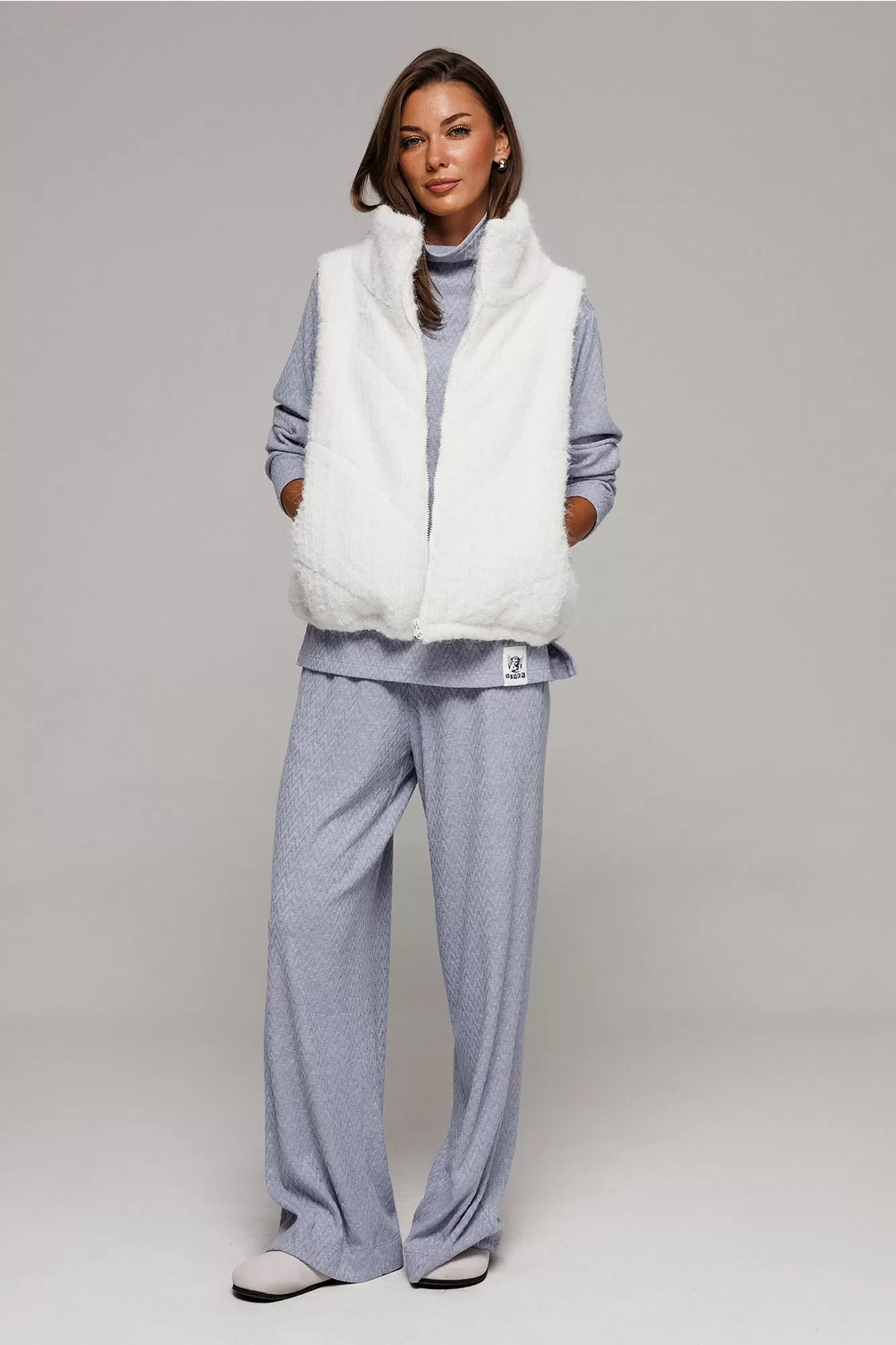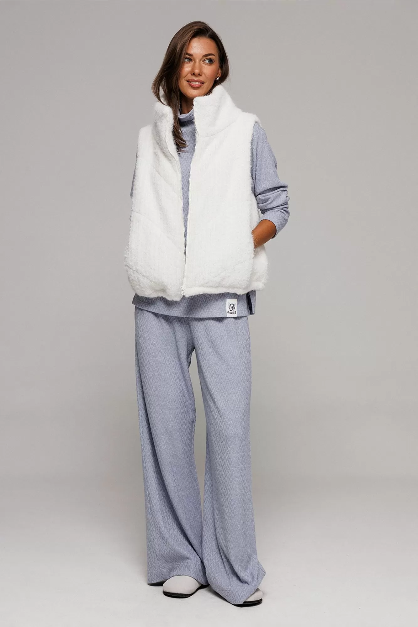 Жилет короткий свободного силуэта, слегка заужен к низу. Полочка с центральной застежкой на тесьму-молнию, с отрезным бочком и карманом в шве притачивания бочка. По низу жилета вставлена эластичная тесьма с фиксатором на спинке. Воротник - стойка. Жилет из трикотажного полотна с фигурной стежкой на синтепоне (isosoft 150г/м²) и подкладке.