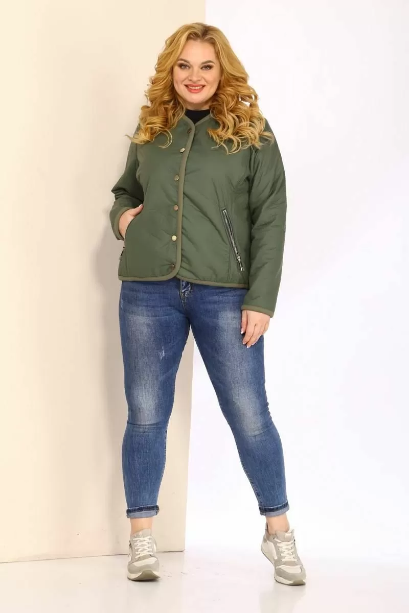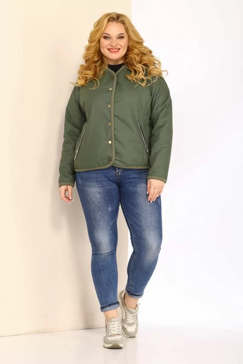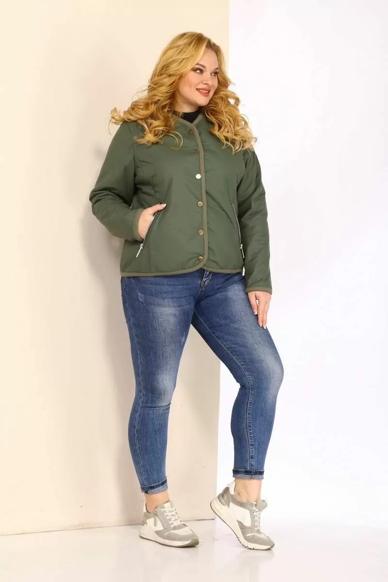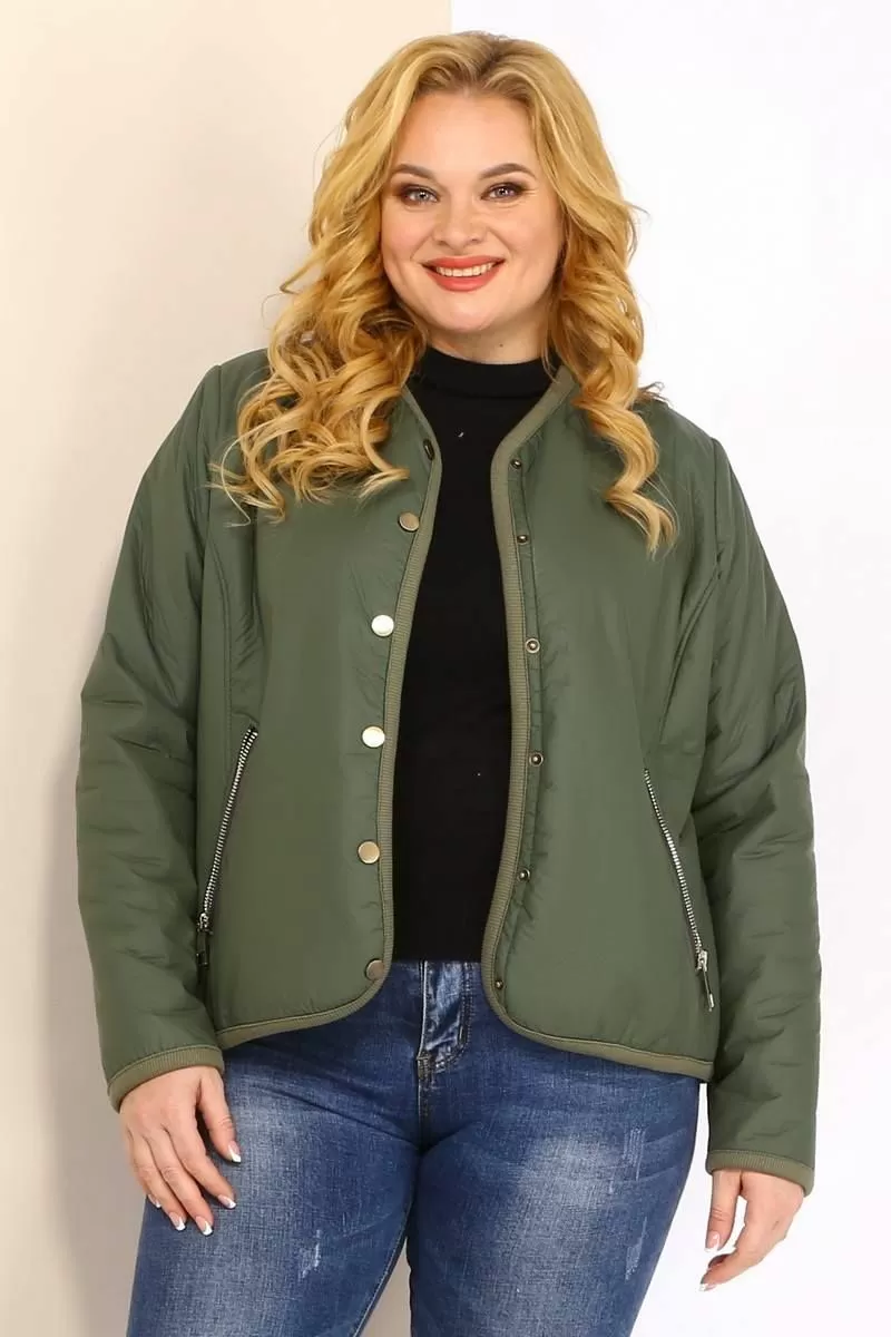 Застежка центральная на кнопки, на полочке выполнены рельефы и функциональные карманы на молнии. Спинка с центральным швом, рукав втачной одношовный. Все края куртки обработаны широкой трикотажной окантовкой. Длина изделия по спинке 61 см.