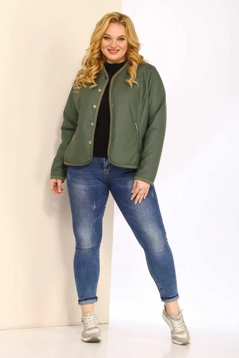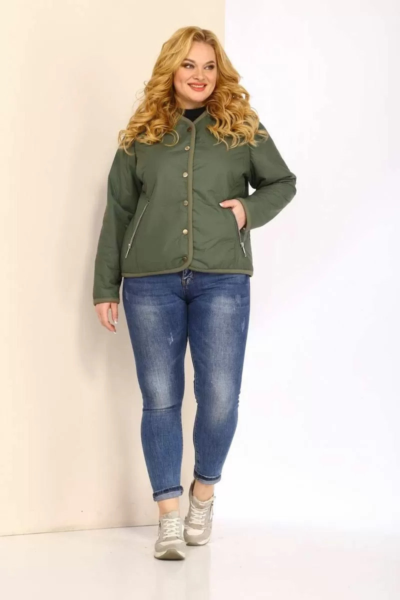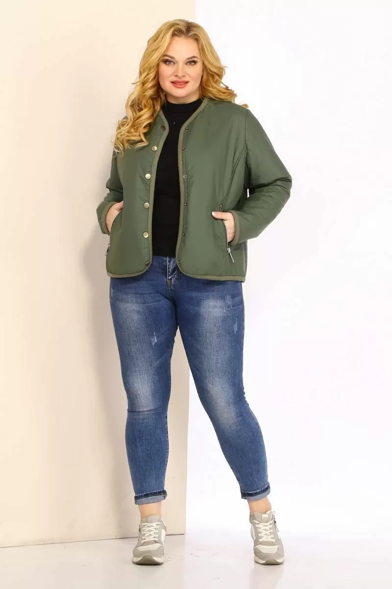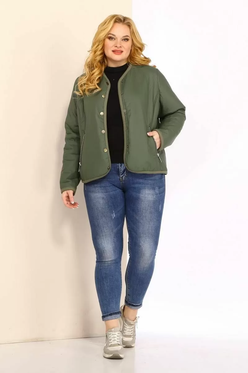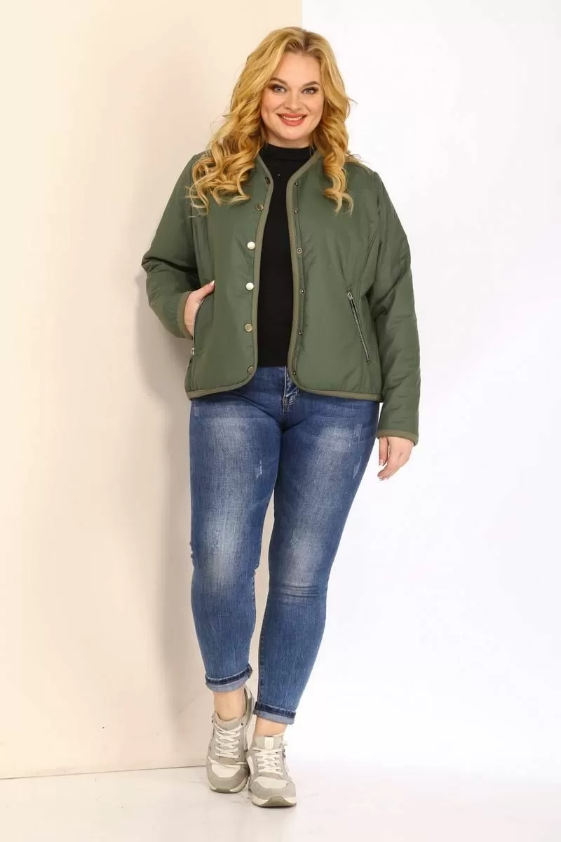Застежка центральная на кнопки, на полочке выполнены рельефы и функциональные карманы на молнии. Спинка с центральным швом, рукав втачной одношовный. Все края куртки обработаны широкой трикотажной окантовкой. Длина изделия по спинке 61 см.