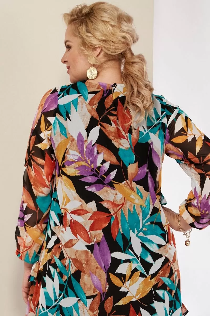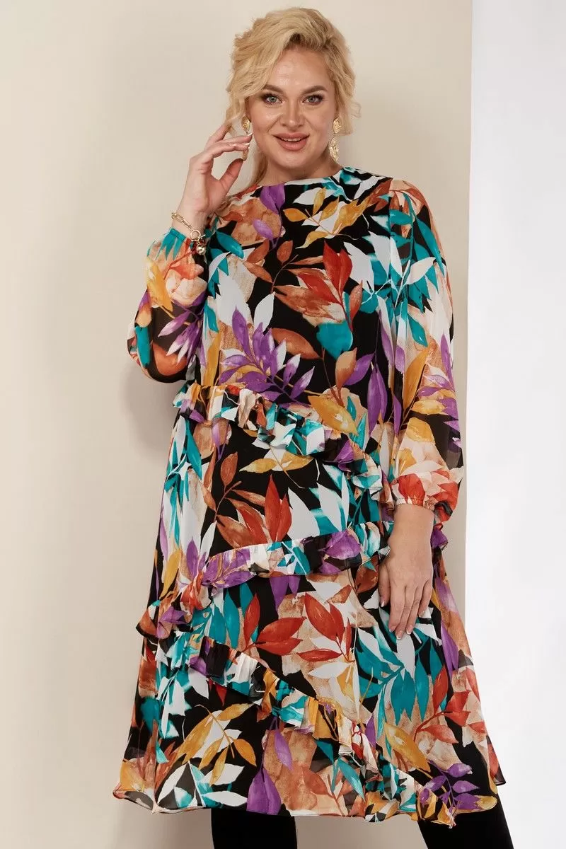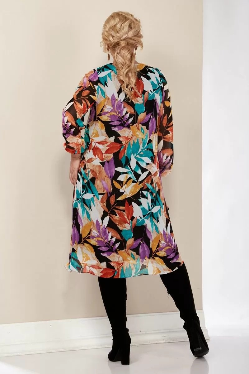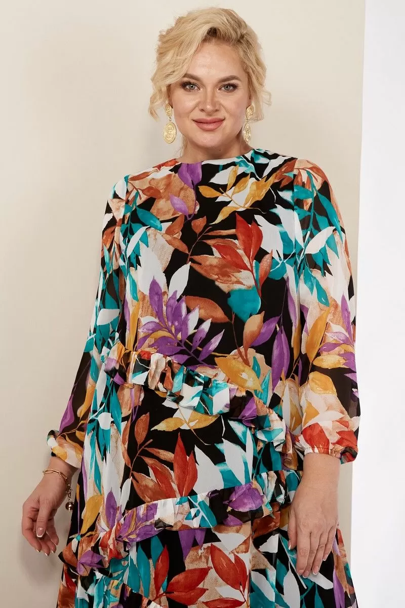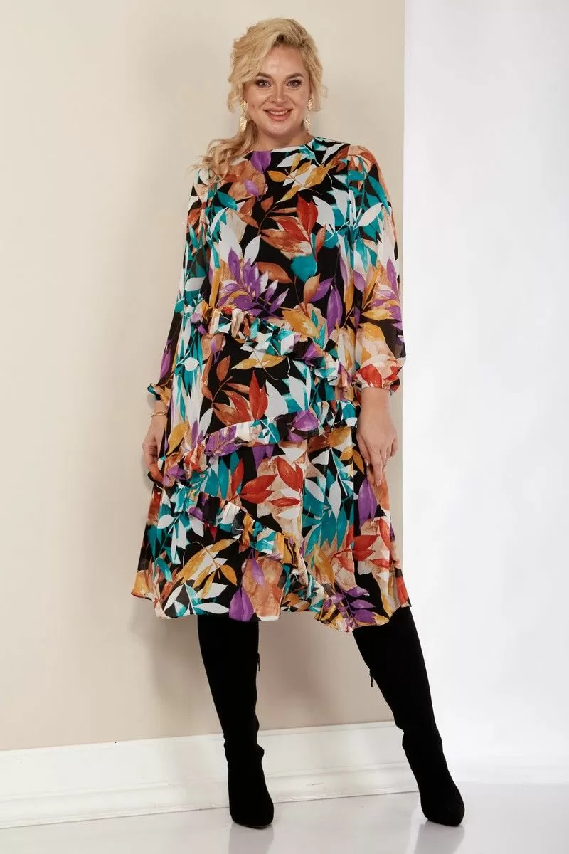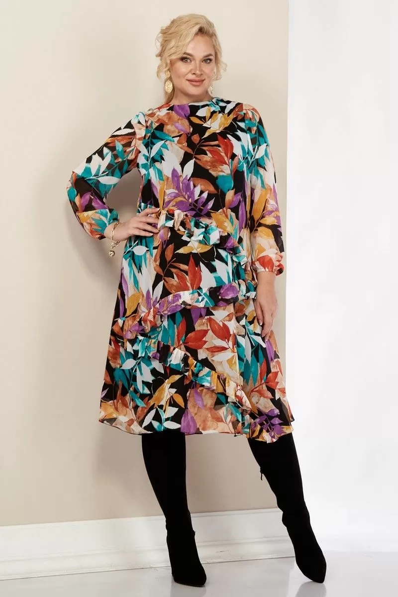 Полочка платья с асимметричными подрезами, в которые вставлены рюши, спинка цельная. Горловина округлая, застежка на навесную петлю и пуговицу на спинке. Рукав одношовный длинный, низ на резинке.