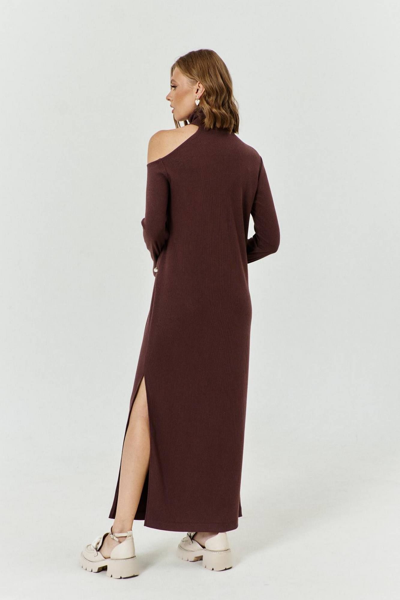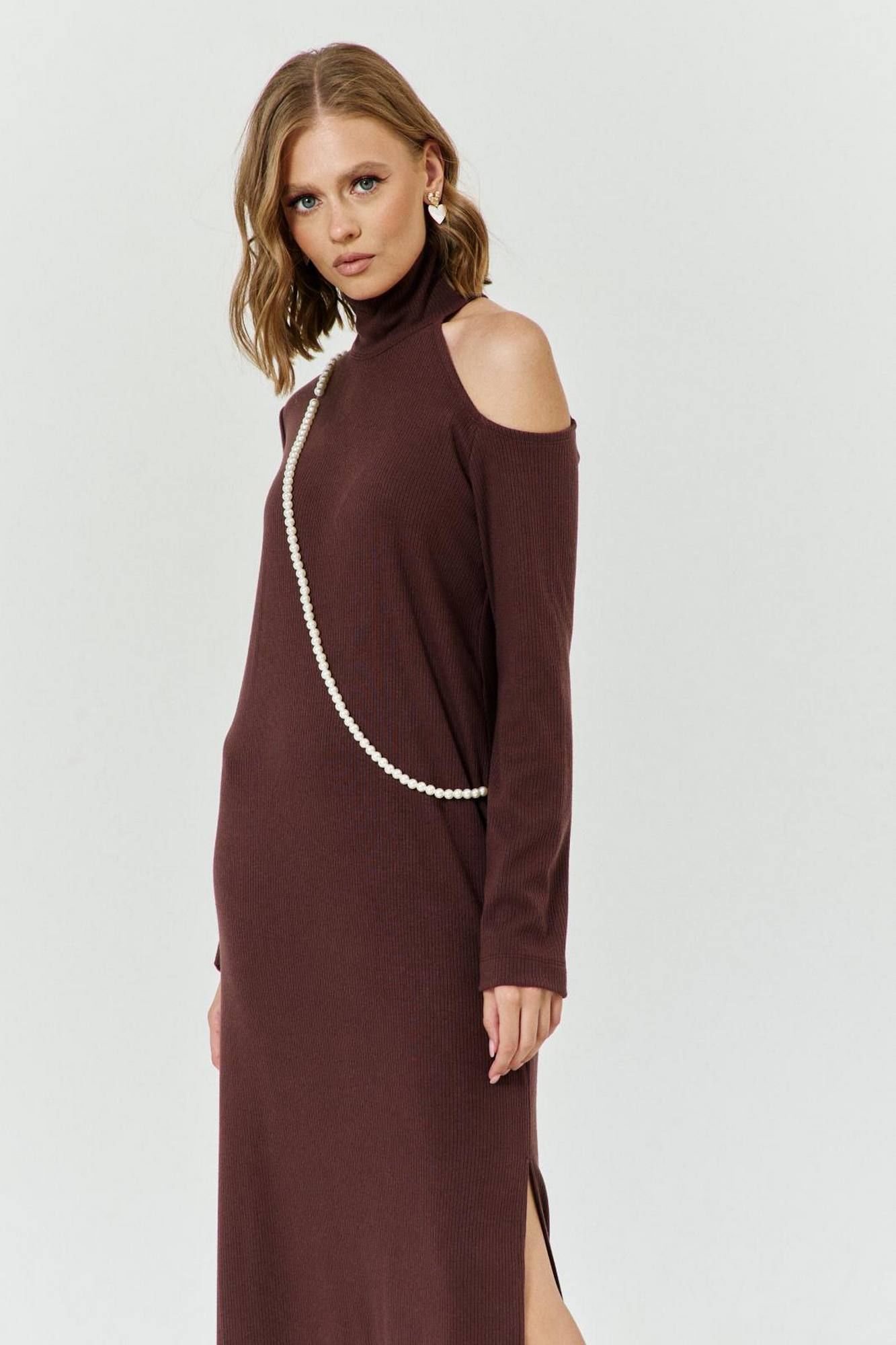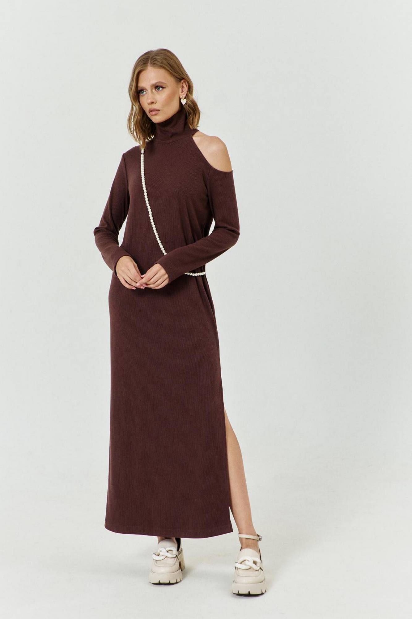 Платье женское прямого силуэта, выполненное из трикотажа. Платье с вырезом по левому плечу и с разрезом по левому боку. Воротник-стойка. Рукава втачные, одношовные, длинные. Левый рукав с вырезом. В комплекте съемные бусы, цепляющиеся за петельки по плечу и боку.