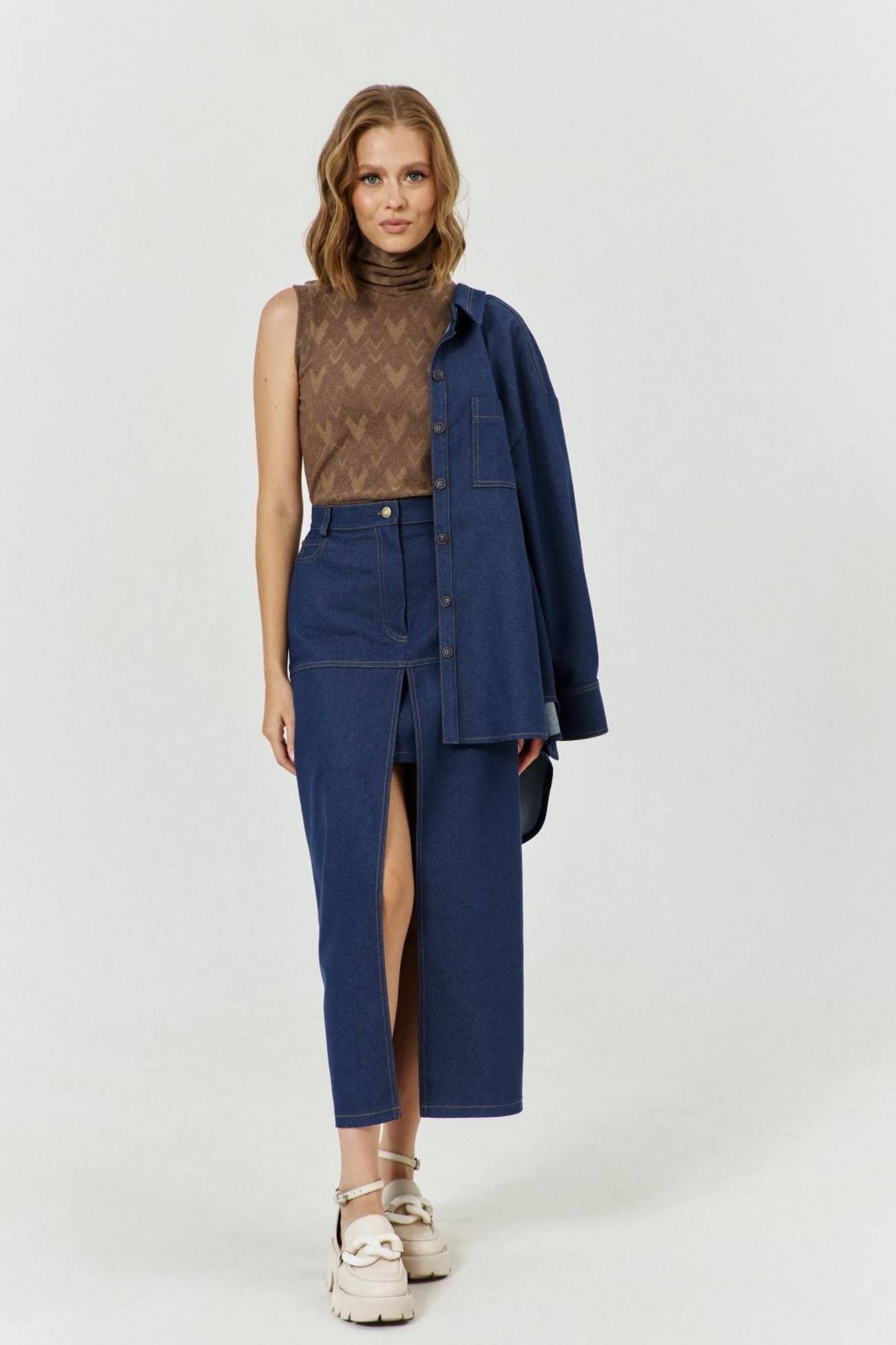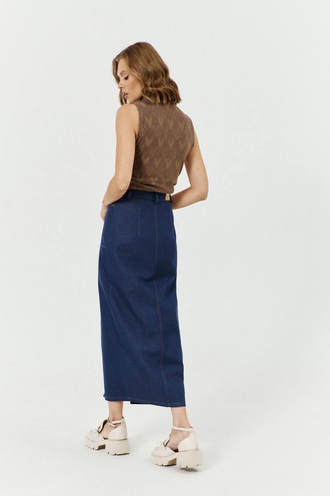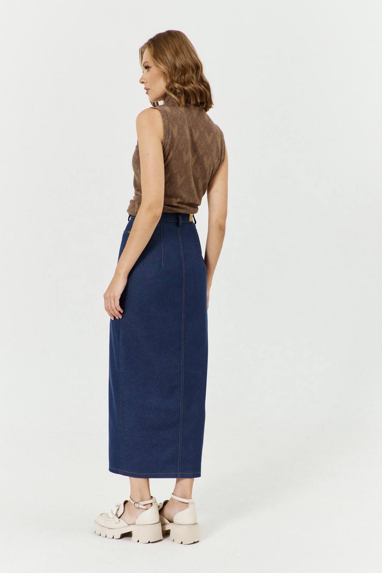 Юбка женская длинная, с застежкой на тесьму молнию с гульфиком и откоском в верхней части среднего шва переднего полотнища юбки, с притачным поясом со шлевками. Пояс застегивается на прорезную петлю и болт. Переднее полотнище с подрезом, в который втачана нижняя часть юбки; с разрезом, с боковыми фигурными карманами. В правом кармане настрочен маленький накладной карман. По бокам карманов – хольнитены. Спинка со средним швом и талиевыми вытачками.
