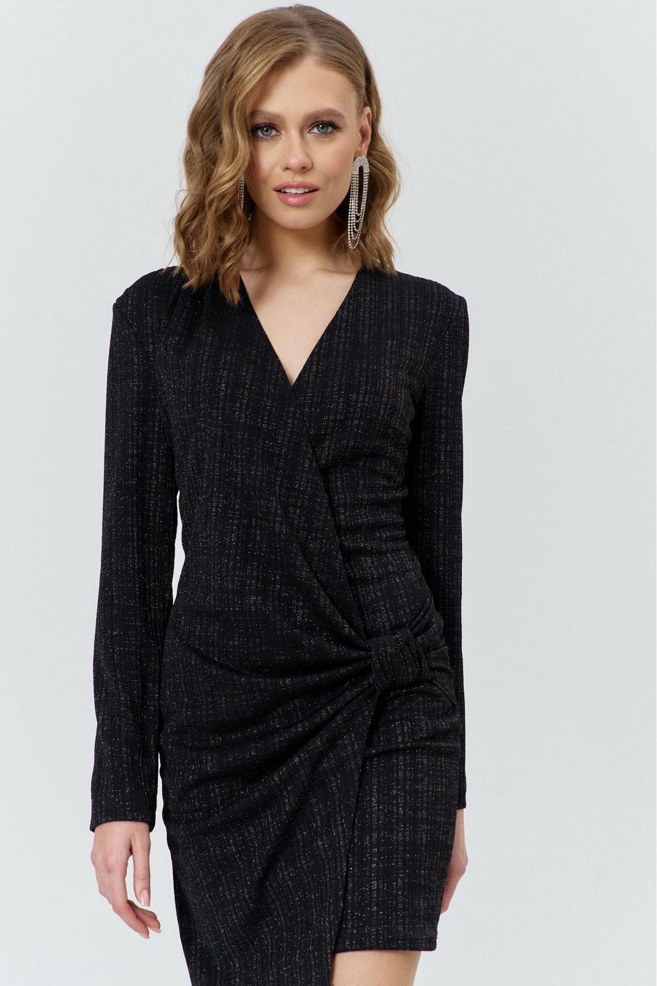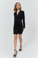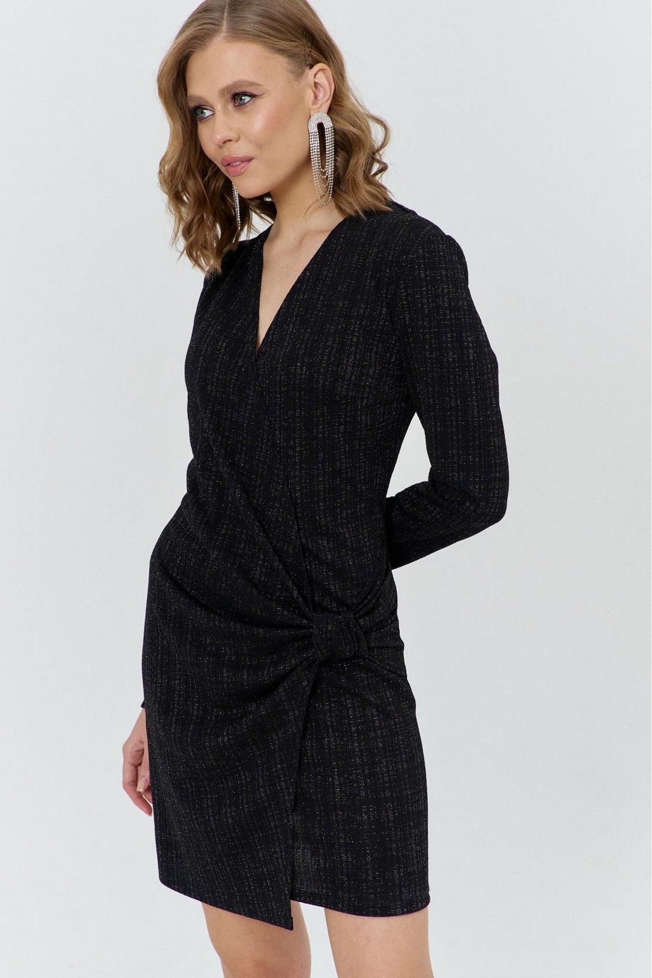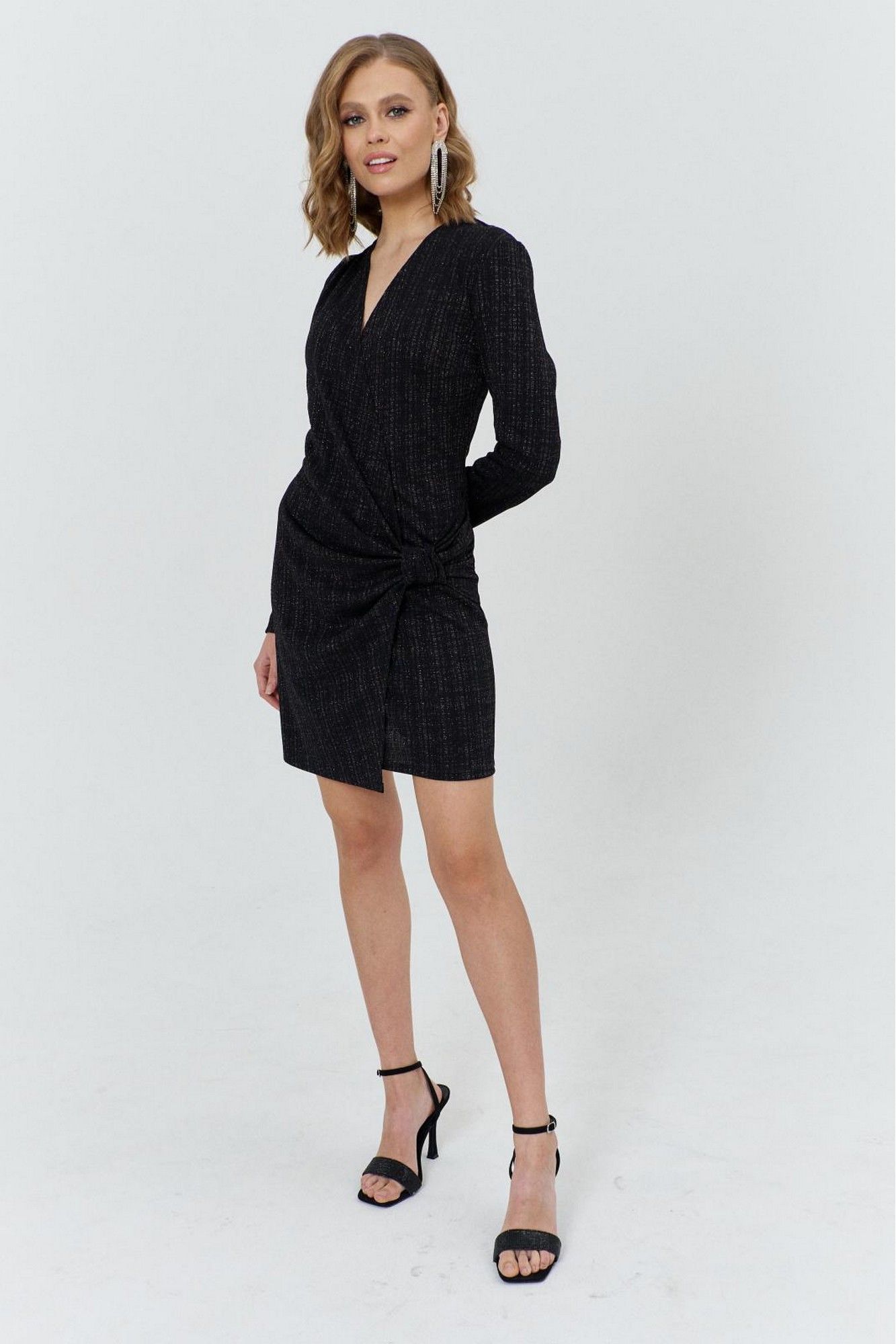 Платье женское прилегающего силуэта из трикотажа.Перед с отлетной драпированной деталью, протянутой через перемычку, и имитирующей запах, со сборкой по правому плечу, с нагрудной вытачкой по левой части переда, с отрезной кокеткой под драпировкой и талиевой вытачкой. Спинка со средним швом. Вырез горловины V-образный. Рукава втачные одношовные длинные.