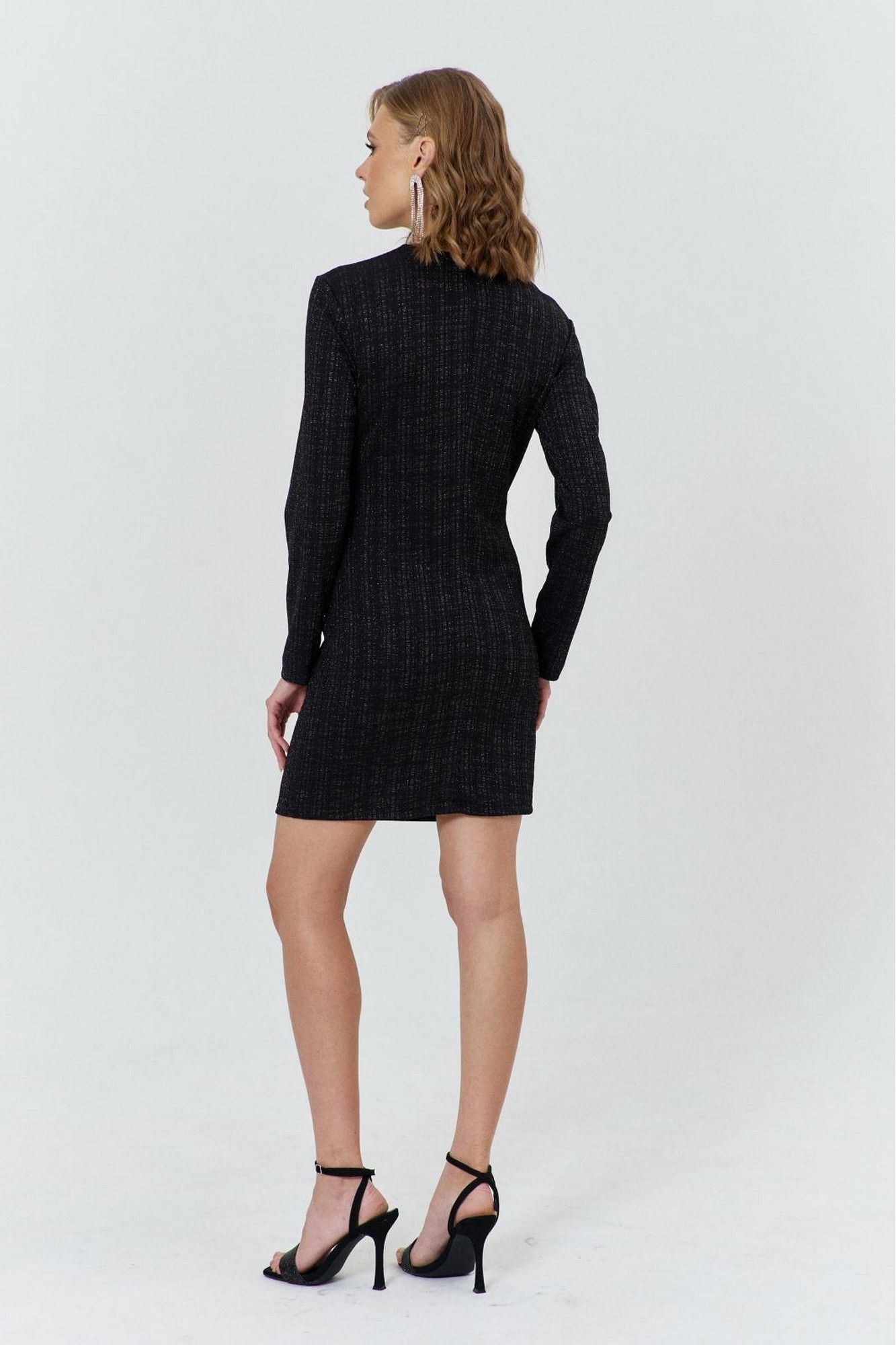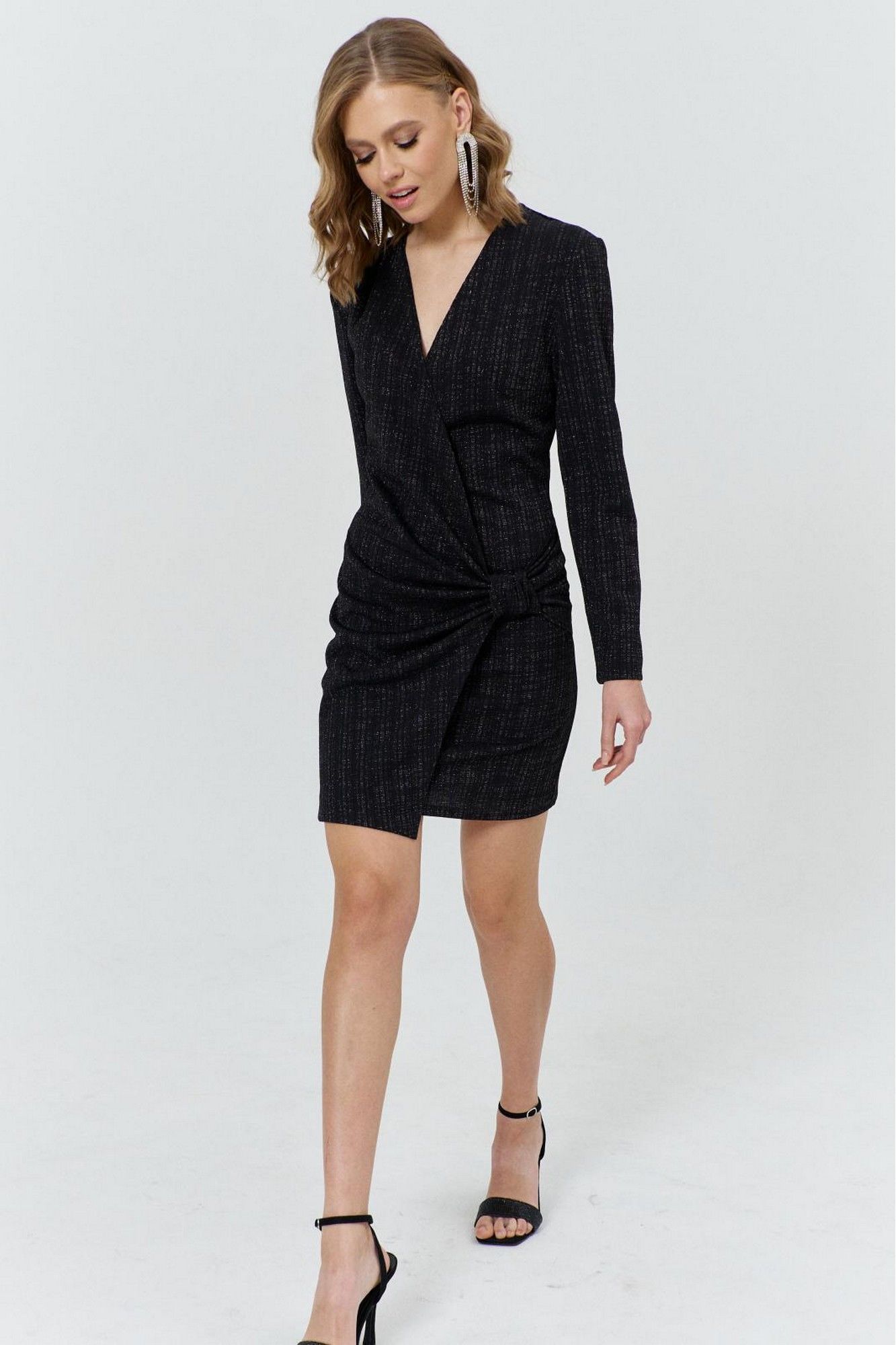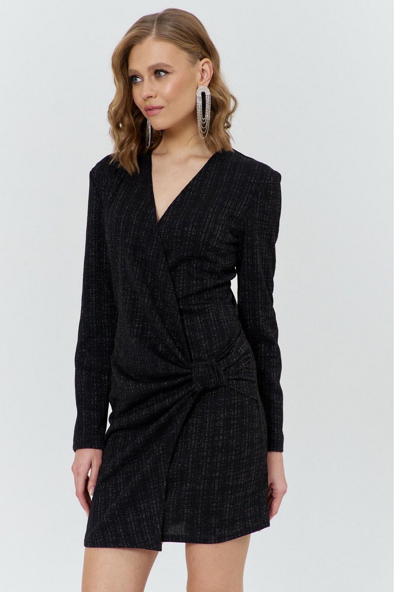 Платье женское прилегающего силуэта из трикотажа.Перед с отлетной драпированной деталью, протянутой через перемычку, и имитирующей запах, со сборкой по правому плечу, с нагрудной вытачкой по левой части переда, с отрезной кокеткой под драпировкой и талиевой вытачкой. Спинка со средним швом. Вырез горловины V-образный. Рукава втачные одношовные длинные.