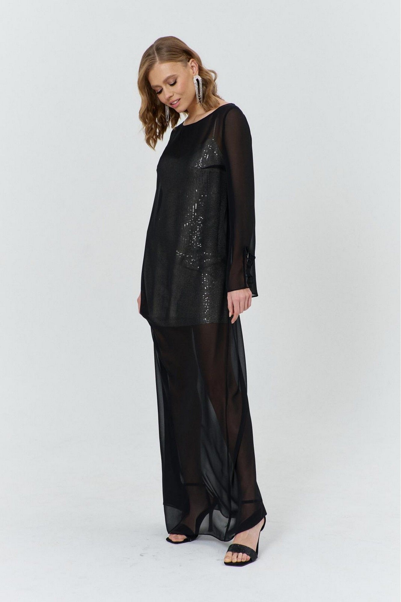 Комплект женский, состоящий из нижнего короткого платья, и верхнего, полупрозрачного длинного платья. Нижнее платье прилегающего силуэта, выполнено из материала с пайетками на трикотажной основе. Перед с нагрудными и талиевыми вытачками. Спинка с талиевыми вытачками. Платье на трикотажной подкладке и с регулируемыми по длине бретелями. Верхнее платье силуэта трапеция, длинное, выполнено из полупрозрачного шифона. Перед с нагрудным вытачками. Спинка без конструктивных элементов. Вырез горловины-«лодочка». Рукава втачные одношовные длинные, с вырезом по низу и притачанным к вырезу воланом.